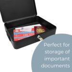 About this item • 12 inch security box can be used to keep cash, valuables, jewellery, important documents or media secure and safe at home or at work • Black powder coated steel with secure lock, helps keep all contents secure
