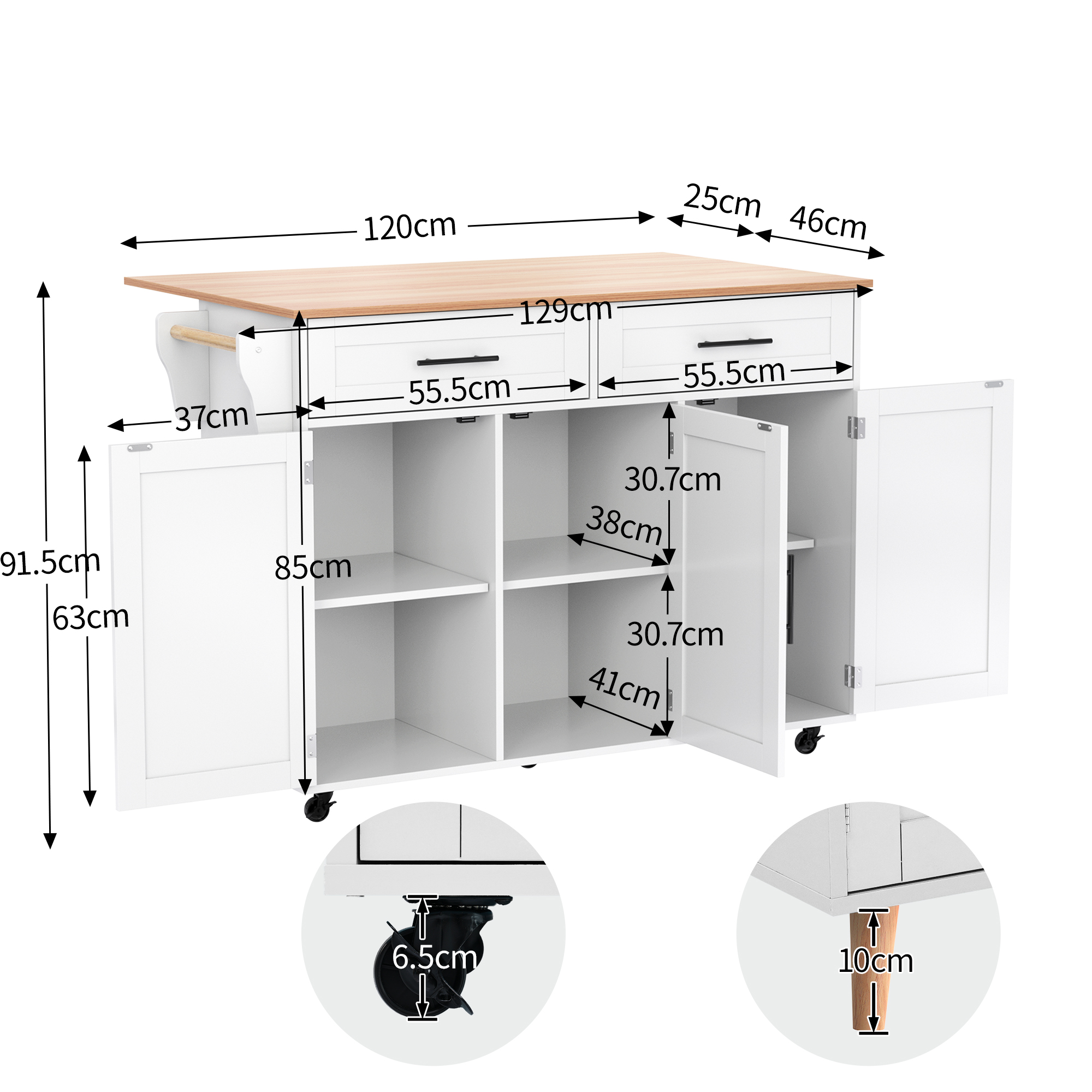 129×46 71x91cm Kitchen Island On Wheels, With Foldable Tabletop, Adjustable Shelves, Rolling Trolley With Storage Cabinets And 2 Drawers, For The Dining Room Living Room