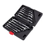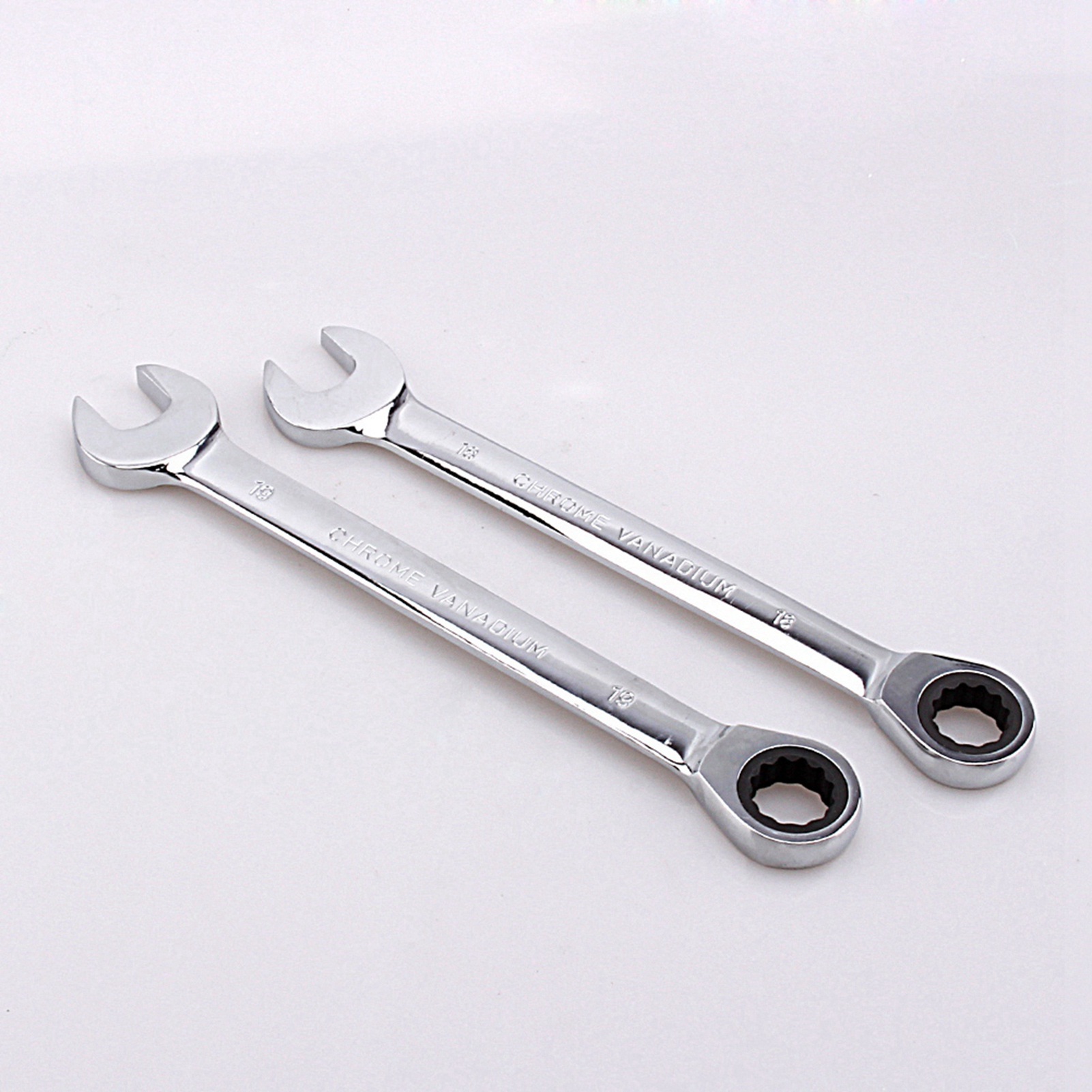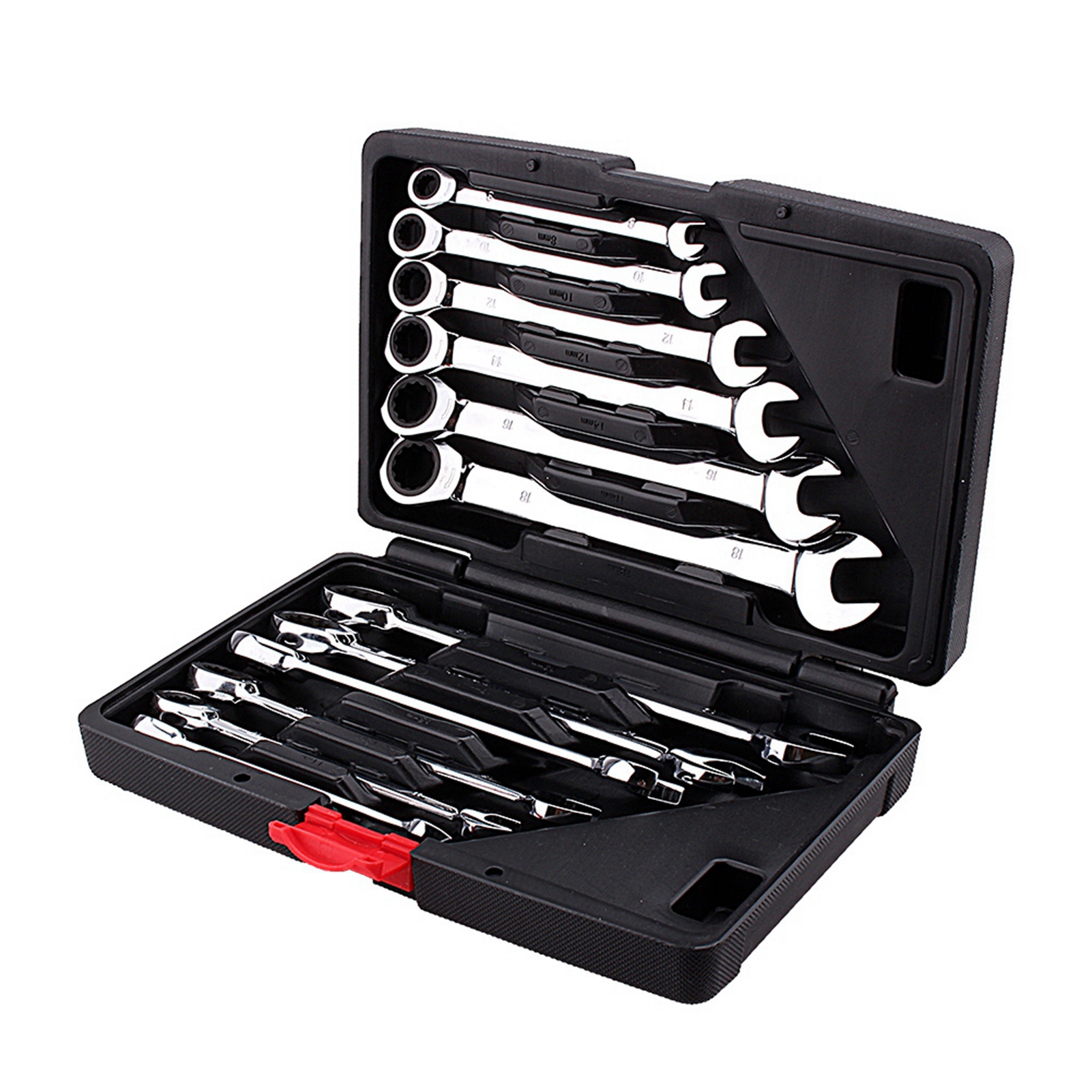 Beautifully and precisely made 12 pcs wrenches numbering 8 9 10 11 12 13 14 15 16 17 18 19, and all in polish chrome vanadium finish. • 5° return angle and 72 teeth quality ratchet end, which is perfect to access areas which are hard to attain. • Comes with a plastic blow moulded case for better protection and transportation.