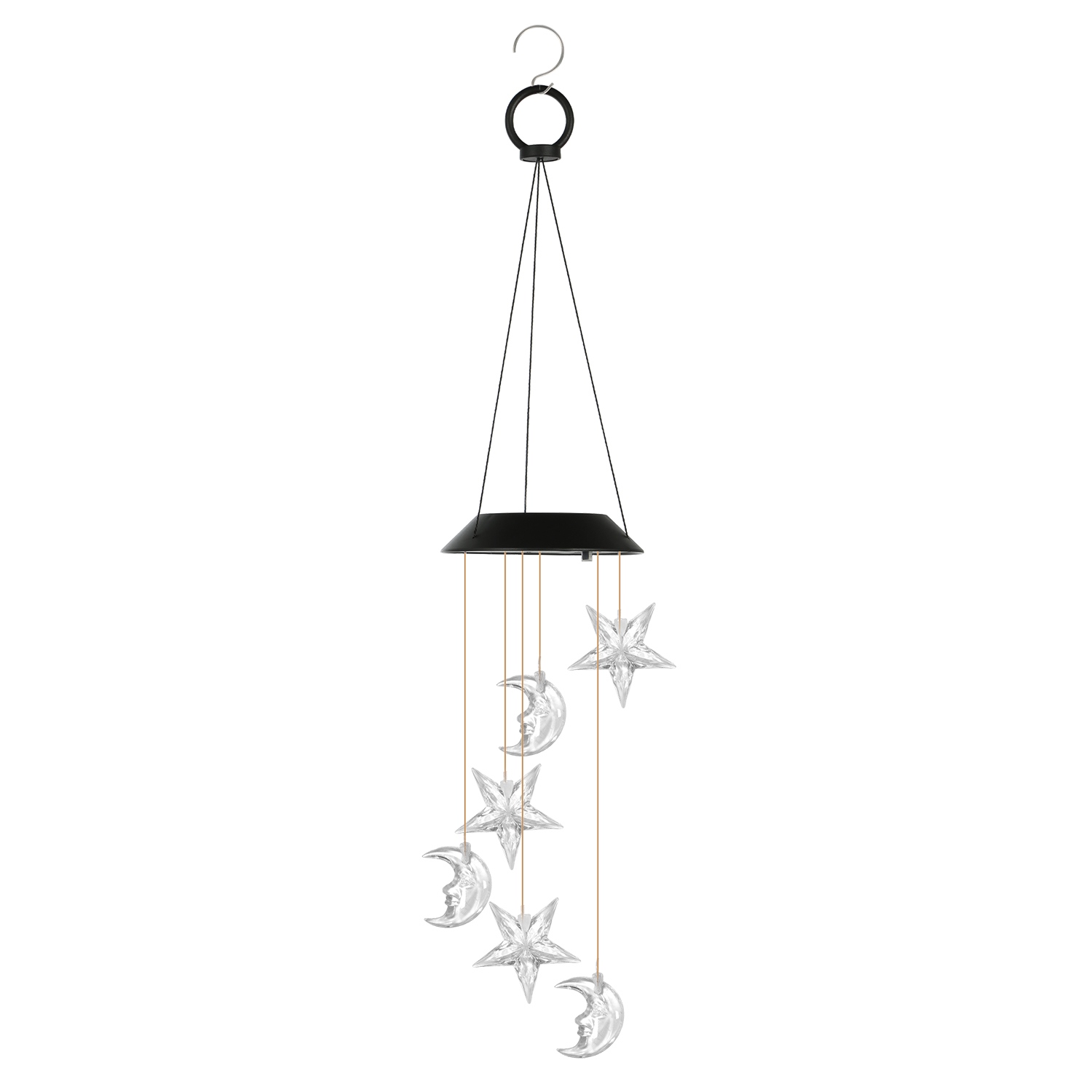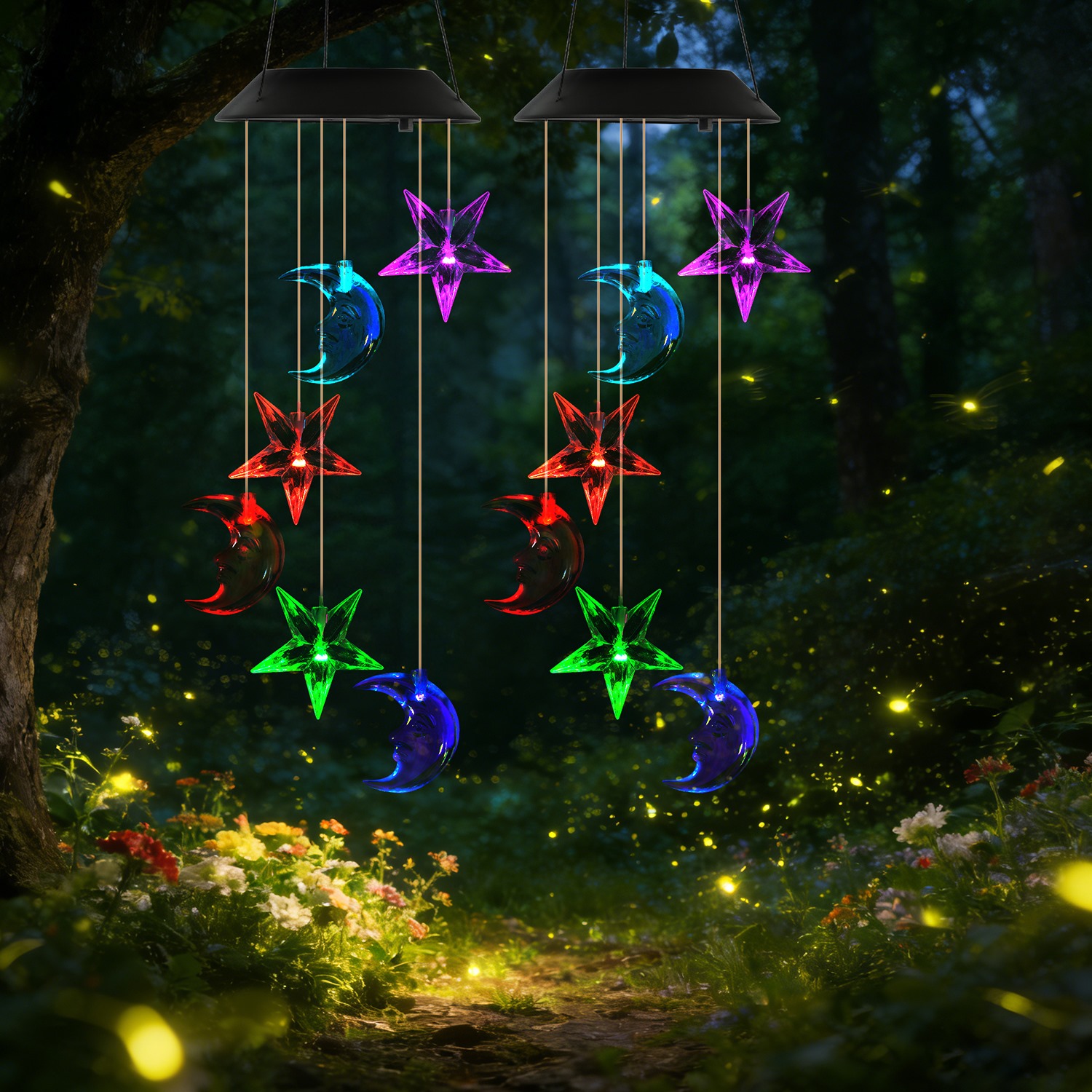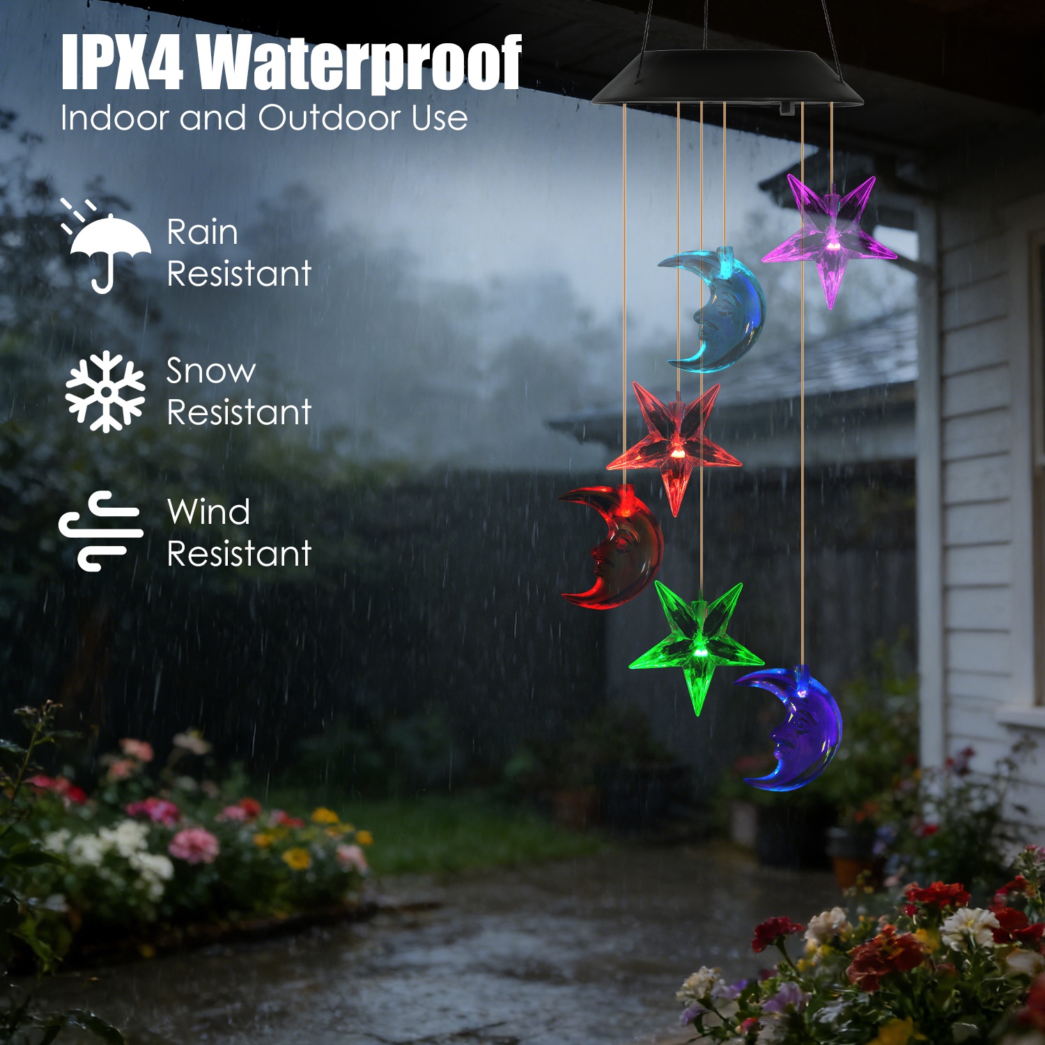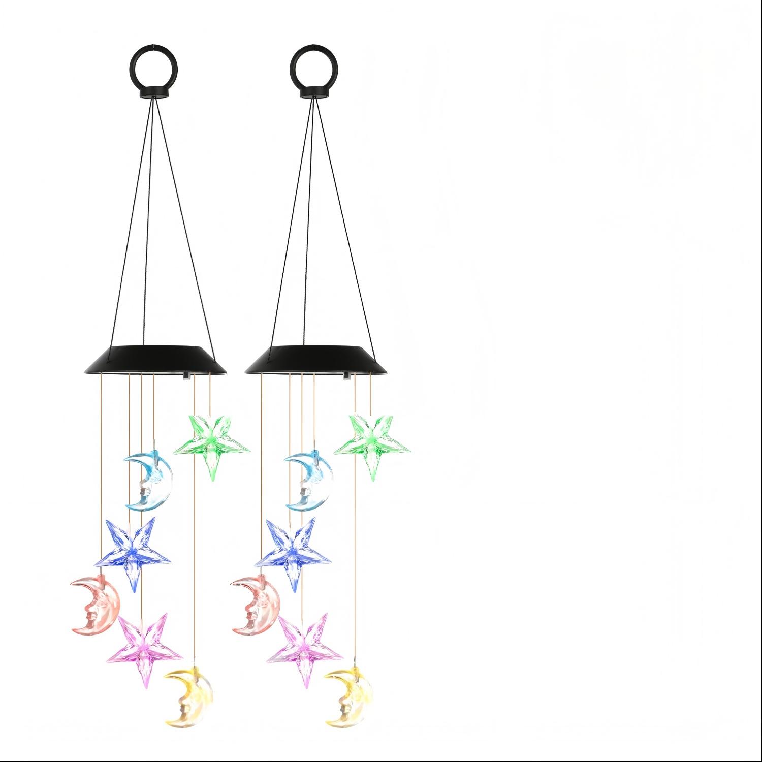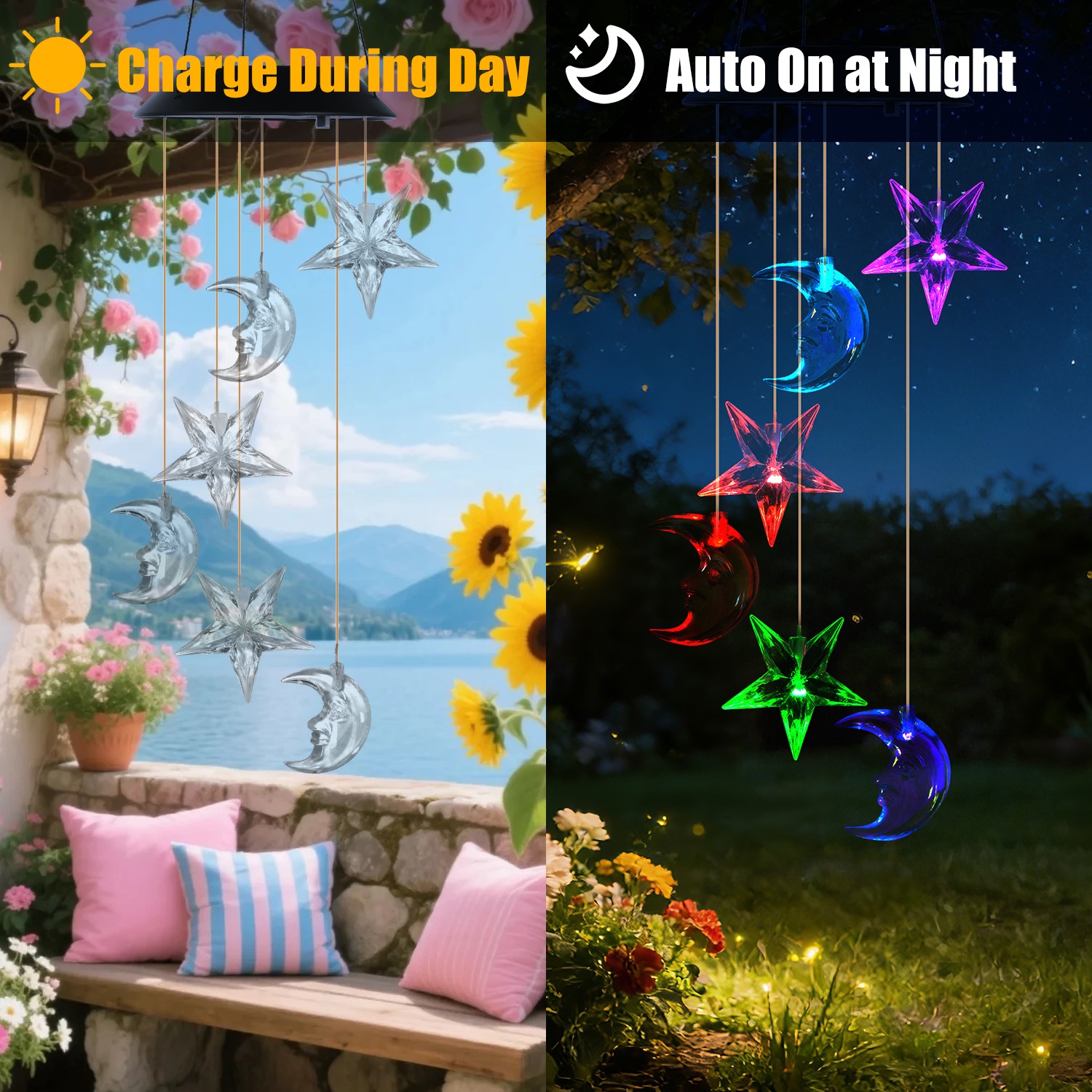 *Features*: • *Soothing Moon & Star Wind Chimes*:Delicate moon and star wind chimes gently collide in the breeze,creating soft,calming tones that bring a peaceful,nature-inspired melody to your garden,patio,balcony,or porch. • *Solar Powered & IPX4 Waterproof*:High-efficiency solar panel charges during the day and automatically lights up at night. Eco-friendly,energy-saving,and IPX4 waterproof to withstand rain,snow,and outdoor weather conditions.