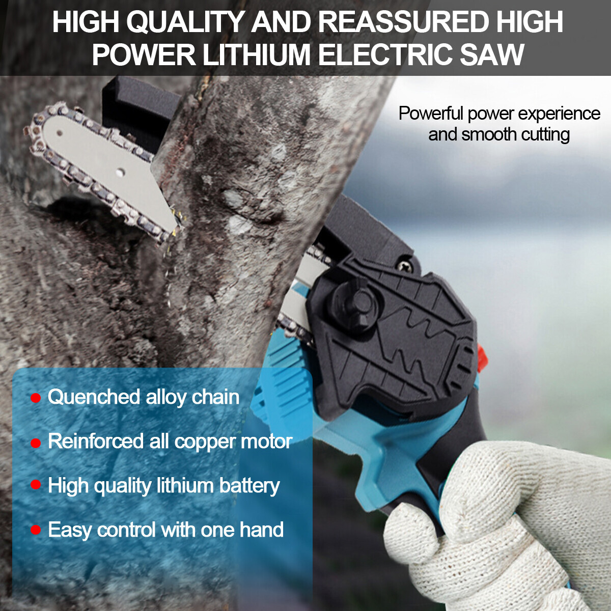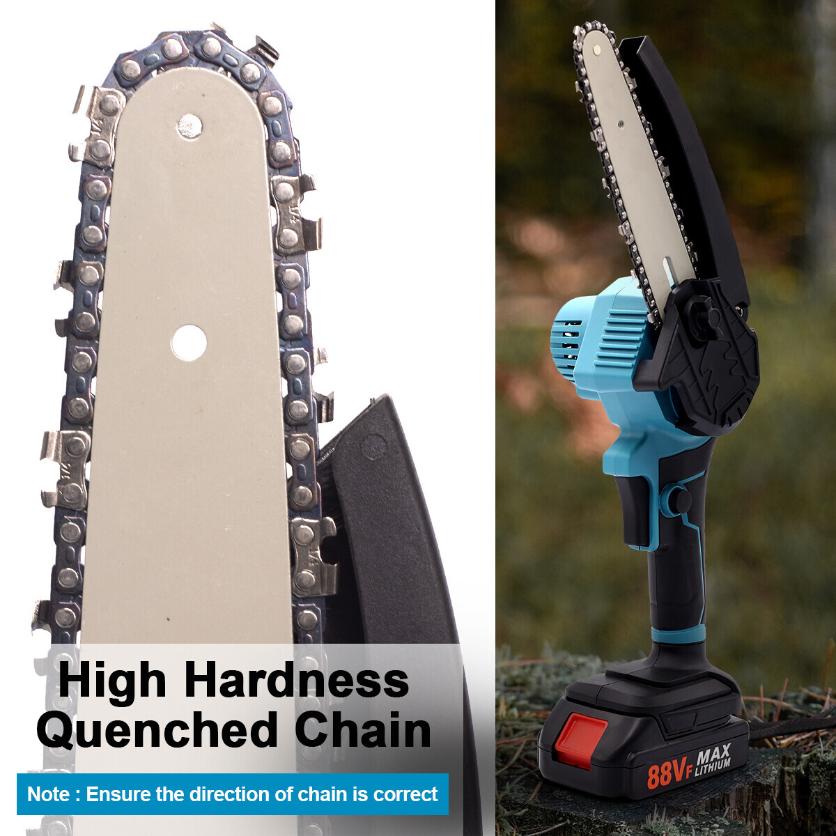 Rechargeable electric chain saw, light and portable, long battery life, no damage to the bark. • Lightweight body, light and convenient, lightweight design, long time holding and not tired hands. Pure copper motor, strong power, fast cutting, improve efficiency. Practical, fast speed, low power consumption. • Fine quality switch, fast and slow adjustment, stepless speed change. Intelligent circuit control board, overload protection, to meet your different construction needs.