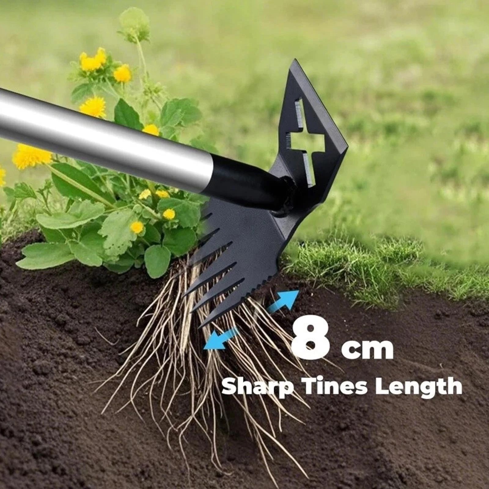 Perfectly suited for multiple gardening tasks, this weeds puller tool removes weeds and aerates soil effortlessly, switching between functions in a simple motion to maximize efficiency • Featuring an all-steel rust-resistant build, the seamless design reduces deformation over time, providing dependable functionality tailored for extended outdoor gardening use • Engineered for tough conditions like hard soil and rocks, it effectively manages dense grass roots, adapts seamlessly across terrains, and features a fatigue-reducing ergonomic long handle
