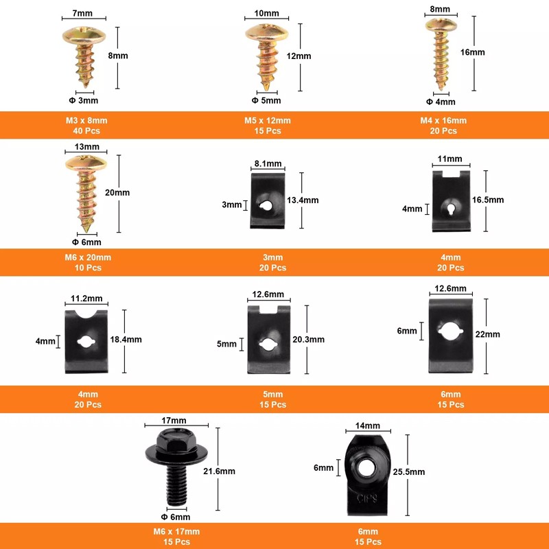 200PCS Car U-Clip & Screw Assortment Kit • Removable And Reusable. Easy to fasten bumper fender flare and mud flap. Holds securely but is easily removed without damaging it for reuse. • Widely Used. Commonly used for fitting side skirts, front bumper, fender, cowl trim panel, wheel well, door trim panel, interior trim panel, etc. The Body Bolts and U Clip is suitable for Toyota for Ford for Infiniti for Honda for Nissan etc.