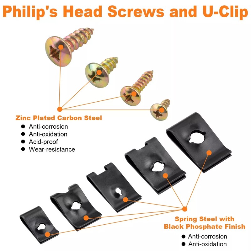 • 85-PCS 5 sizes U-Clips(3mm to 6mm) with black phosphate finish, will be less prone to getting rust. Durable and fit perfect with Philips’s head screws.
