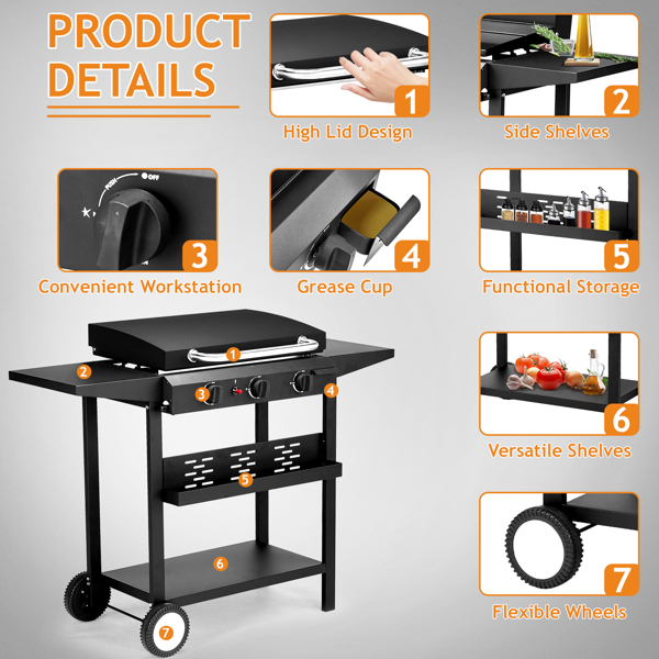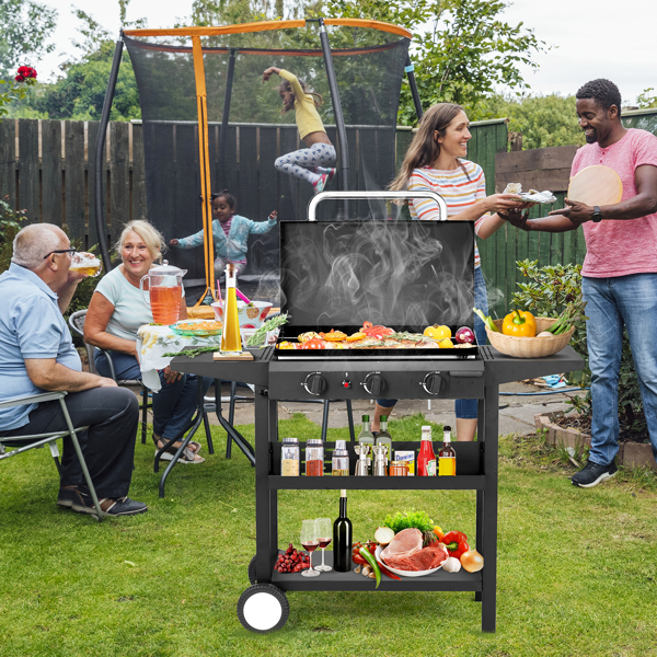 Elevate your outdoor cooking with this 3-Burner Flat Top Gas Griddle Cooking Station. Whether you’re flipping burgers, searing steaks, or sautéing vegetables, this cooking station is equipped to deliver restaurant-style results in the comfort of your backyard. The ceramic-coated cast iron pan ensures a non-stick experience, promoting healthier meals with minimal oil. With its durable construction and precision heat control, this cooking station is set to be the centerpiece of your next outdoor barbecue or family cookout. • 2. Non-Stick Ceramic Coated Pan: Our griddle features a ceramic-coated cast iron pan, enabling you to cook with less oil while ensuring a breeze of a cleanup—simply wipe away the mess! • 3. Convenient Storage: Keep spices, utensils, and ingredients within arm’s reach with a spice rack at front and spacious shelves at both sides, making meal prep seamless and organized.
