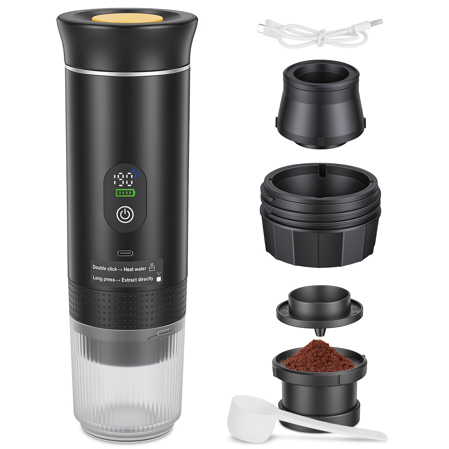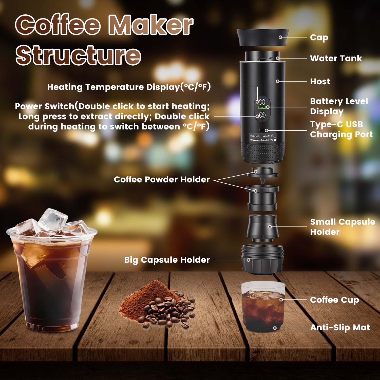 *Features*: • 3-in-1 Brewing Compatibility – This portable coffee maker supports large capsules,small capsules,and ground coffee,providing flexible options for travel espresso and daily coffee preparation. Includes two capsule adapters and a scoop for ground coffee. • Self-Heating System – The rechargeable espresso machine heats water to 90℃(194℉) within 5–6 minutes using its 72W heating system,enabling hot coffee extraction without an external kettle. Besides,you can simply double click power button during heating to switch between °C and °F.
