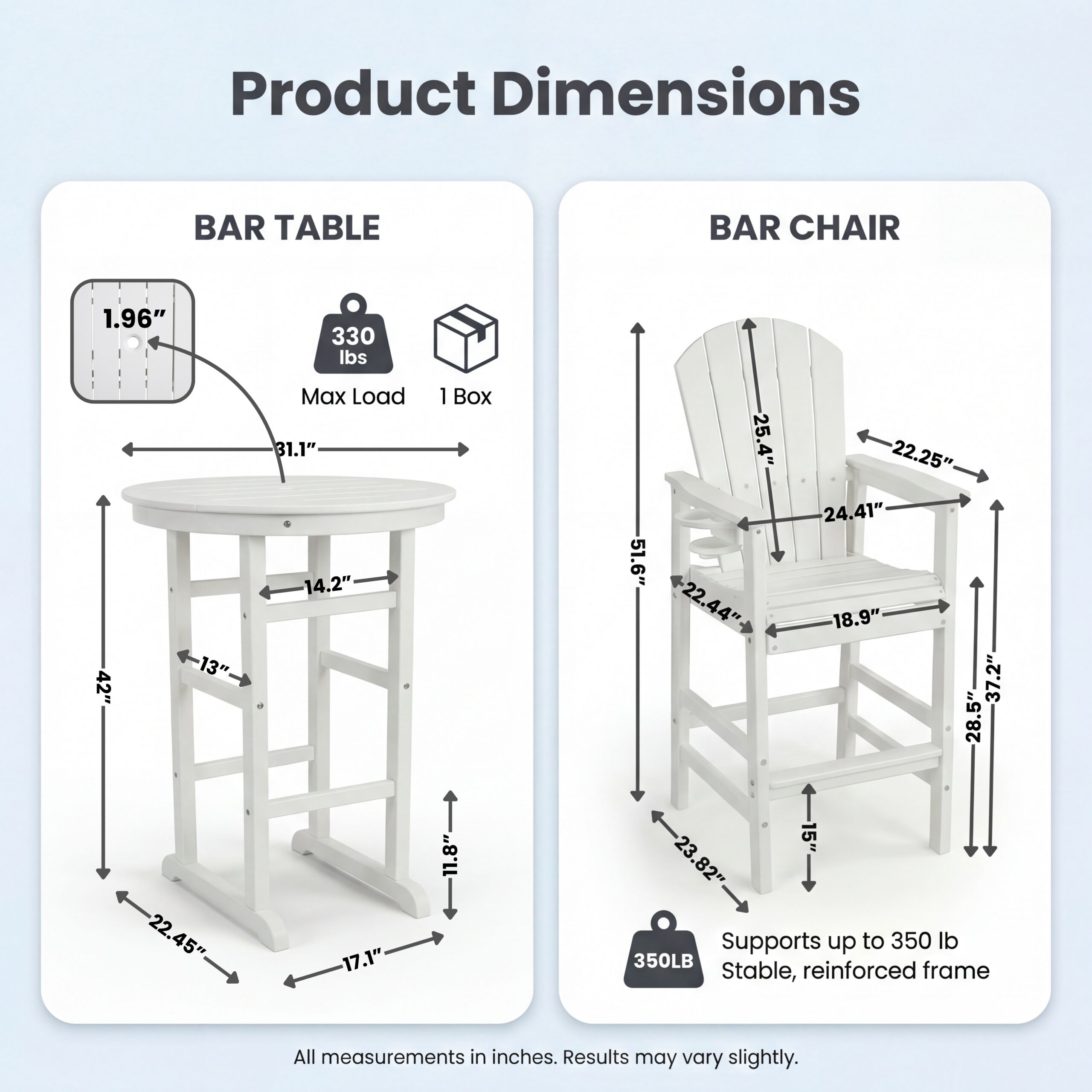 Combo ItemProduct Name:3-Piece White HDPE Indoor/Outdoor Bar Set, 42.1″ Round Bar Table with 2 Bar Stools, All-Weather Patio Bistro Set for Deck, Balcony, Poolside & Coastal UsePlace of Origin:ChinaMain Color:Cottage White,Creamy White,WhiteMain Material:HDPEFiller:HDPEProduct Style:American Design,Beach,Casual,CoastalUse Case:Garden & OutdoorSeating Capacity:Seats 2Outdoor Seating Type:Complete Patio SetsSet Design:Complete Patio SetCushions Included:NoFrame Durability:Weather Resistant FrameProduct DimensionsAssembled Length (in.):Not ApplicableAssembled Width (in.):Not ApplicableAssembled Height (in.):Not ApplicableProduct Weight (lbs.):Not ApplicablePackage SizeSub-item 1: W3566P467417Package Quantity: 139 * 36.42 * 4.13 in. 53.8 lbs.Sub-item 2: W3566P456544Package Quantity: 237 * 22.44 * 6.1 in. 48.5 lbs.