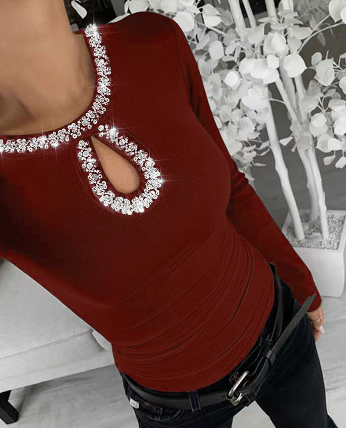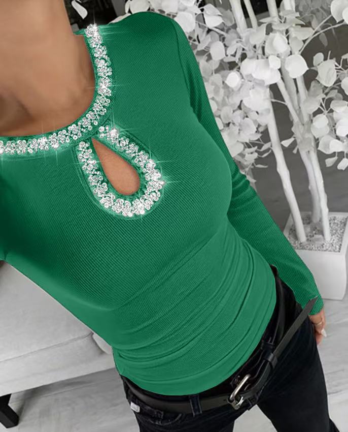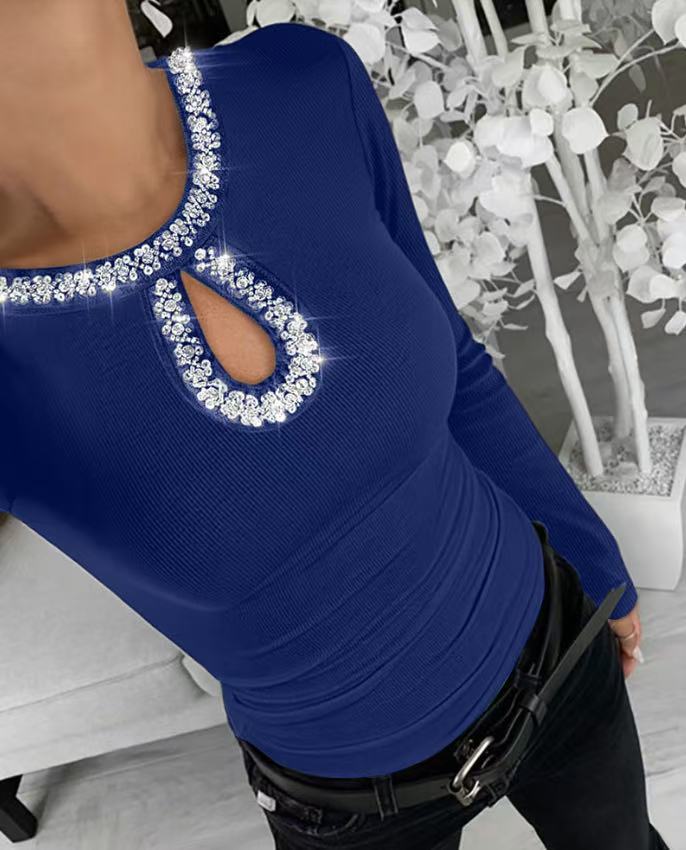 3D Rhinestone Embellished Crewneck Ribbed Long-sleeve Top
