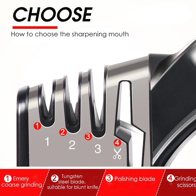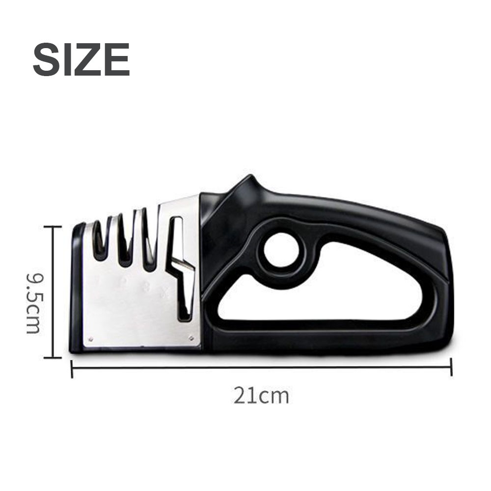 —-4-stage knife sharpener: With our incredible 4-slot system, including diamond sharpening rod for coarse, ceramic sharpening rod for fine sharpening and polish, tungsten sharpening rod for blunt blades and scissors sharpening rod. • —-Application: Designed for straight knives, such as, chef knife, steak knives, steel knives and scissors and more. • —-Non-slip base: Anti-skid silicone base makes the sharpener steady and easy to hold.