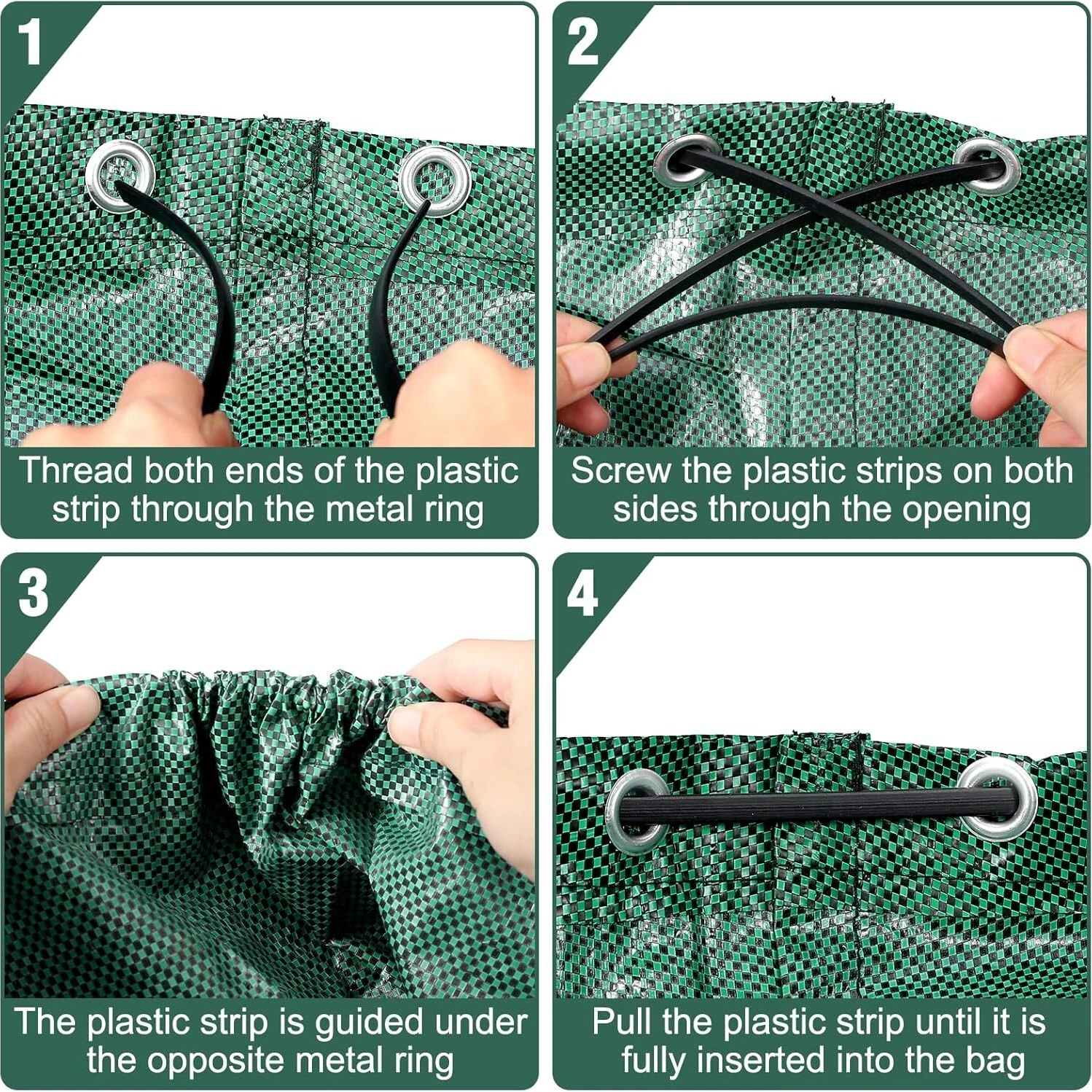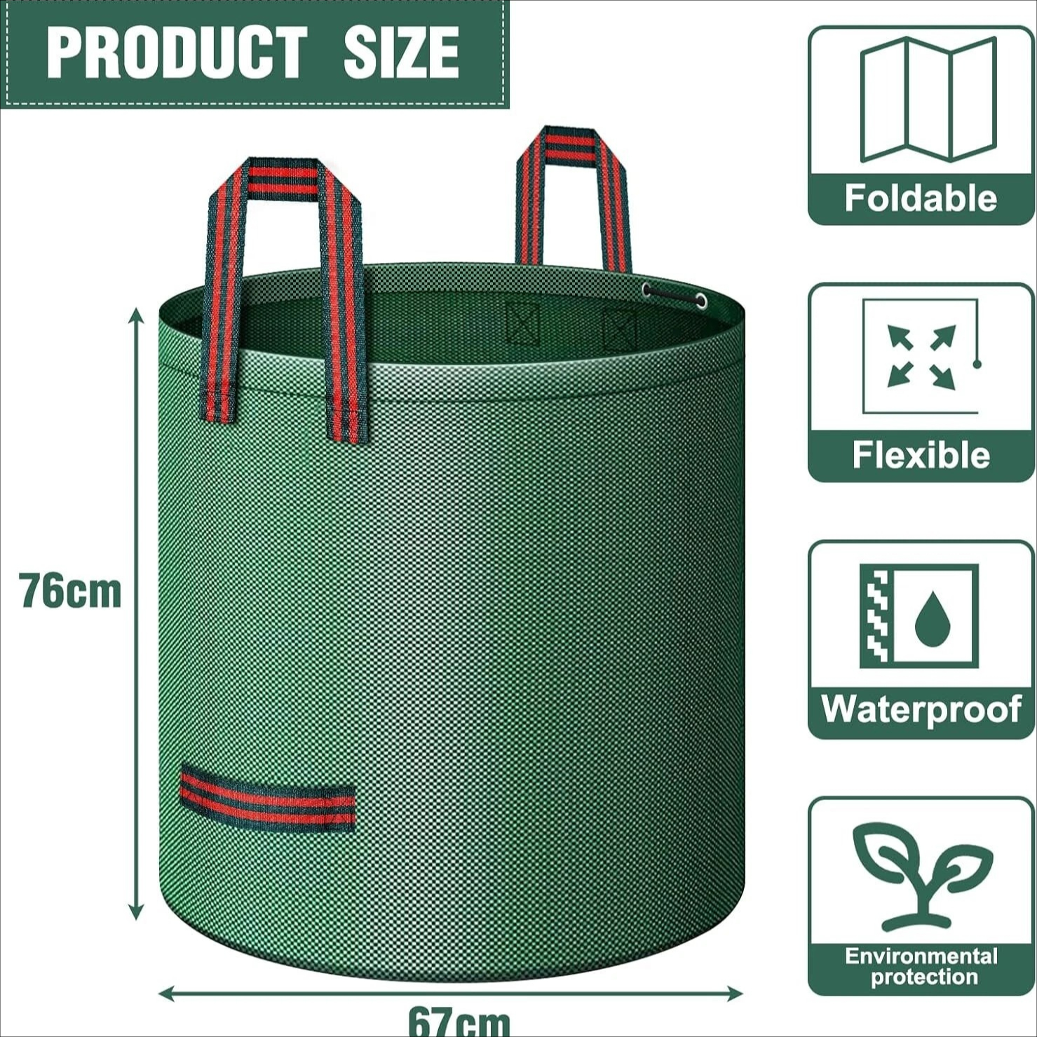 Product Name4-Pack XXL Garden Waste Bags 272 LKey Features – Extra-large capacity: 272 L per bag—perfect for leaves, grass clippings, and general garden waste. – Heavy-duty fabric: 150 g/m² woven polypropylene (PP) for tear resistance and long life. – Reinforced rim: sturdy ring keeps the bag open for effortless filling. – Easy to carry: four robust handles sewn all around for secure lifting by one or two people. – Water-repellent reusable season after season.Specifications – Material: Polypropylene (PP) 150 g/m² – Volume per bag: 272 L – Quantity: 4 bags – Handles: 4 per bag – Features: water-resistant, machine/hand washable, foldable for storagePackage Contents – 4 × 272 L garden waste bags
