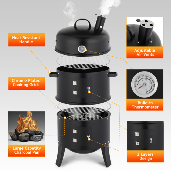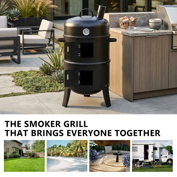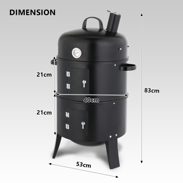 • 43×52×85 cm compact cylindrical smoker, ideal for backyard and outdoor smoking.