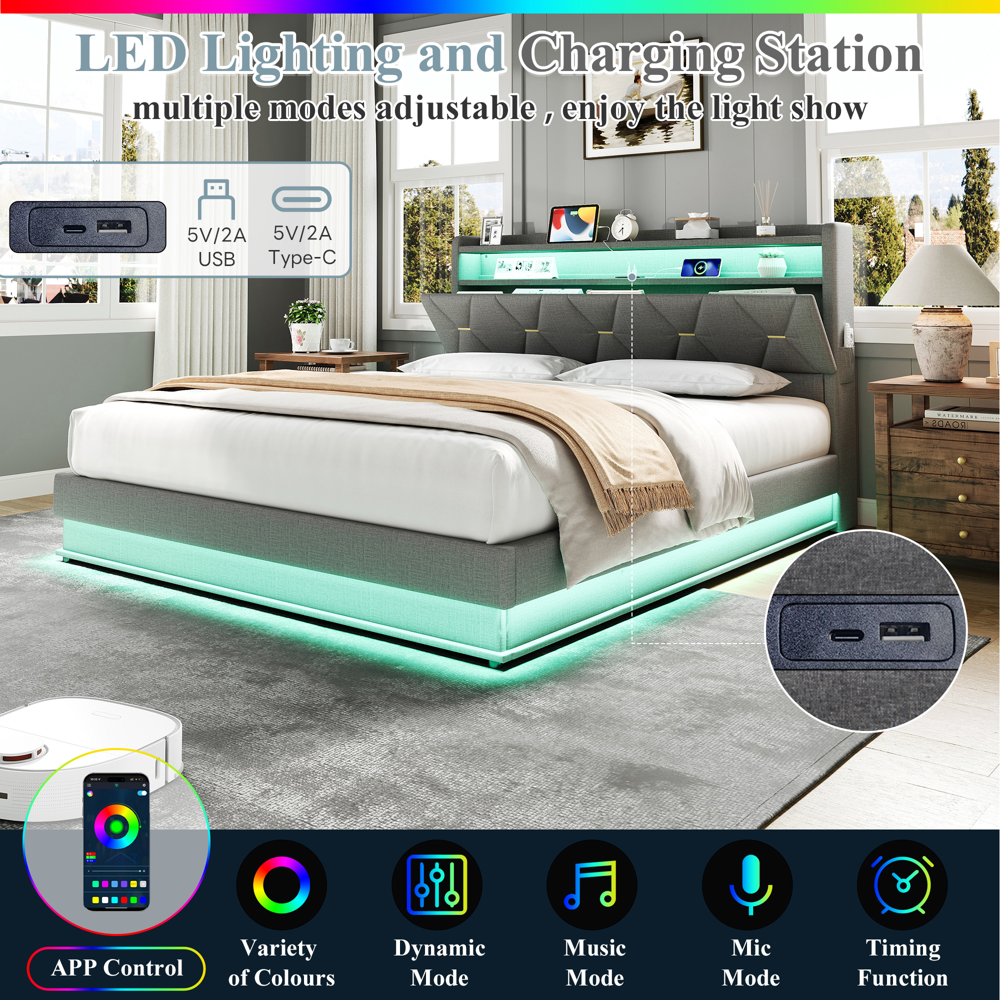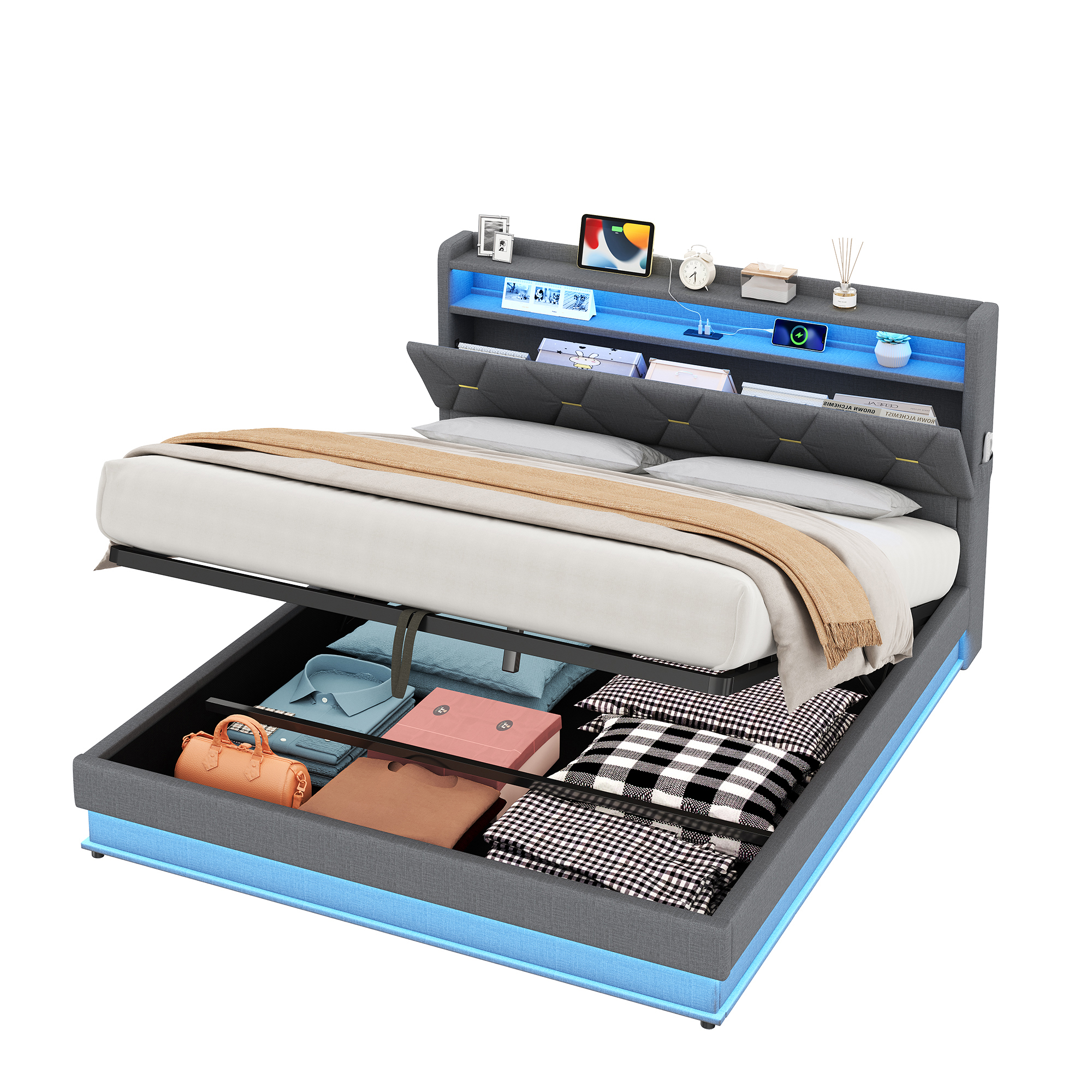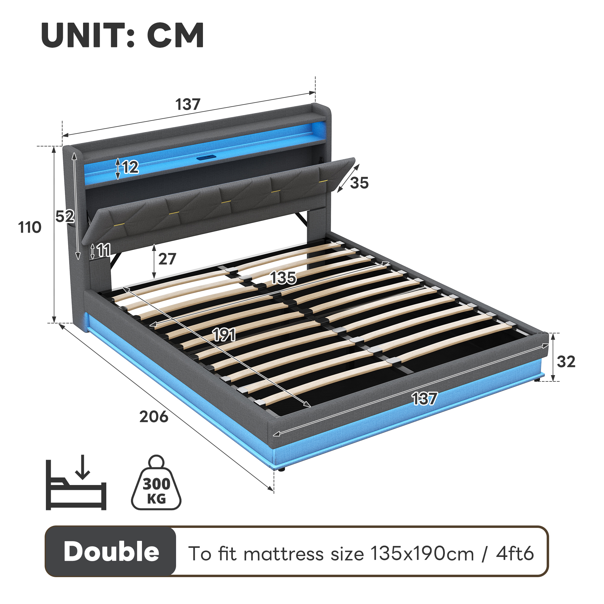 - Combo ItemProduct Name:4ft6 Double Upholstered Bed Frame with Hydraulic Storage, LED Headboard with Charging Station and Concealed Headboard Storage, USB and Type – C Ports, Linen, No Box Spring Needed, Grey (No Mattress)Place of Origin:ChinaMain Color:GreyMain Material:LinenBed Size:135cm*190cmProduct DimensionsAssembled Length (cm):206.00Assembled Width (cm):137.00Assembled Height (cm):110.00Product Weight (kg):52.66Package SizeSub-item 1: N652P266152GPackage Quantity: 1143 * 41.5 * 15.5 cm 27.02 kgSub-item 2: N652P266151GPackage Quantity: 1193.5 * 33.5 * 22 cm 28.33 kgProduct Features[Ample Storage Space] This bed frame uses hydraulic technology to lift and land the platform smoothly, easy to make up the bed and easy to access the items stored under the bed frame. This bed frame comes with a hidden headboard, hidden storage space where you can place your private items. Each side of the bed comes with a pocket on each side, allowing you to get your cell phone, glasses or remote control within reach.[RGB LED Lighting Strip] The headboard and around the bed base of the bed are equipped with RGB lights that can be controlled via mobile app. You can set the brightness and color freely, and there are also control modes such as style mode, music mode, microphone mode and timing function for you to explore. You can design a unique light show according to your own preferences. (Attention: This product does NOT INCLUDE remote control; the LED lighting can only be controlled by APP)[Charging Station] Conveniently located at the bedside, this bed has Type-C and USB ports ensure your devices are always charged and ready to use.[Chic look and Comfortable design] This chic headboard is made of X shape appearance enhances the sophistication of the bed frame. It padded with high resilience sponge and covered with soft Linen Fabric. Its appearance is designed to suit a wide range of home styles. Whether you use it as a primary bed or as a guest bed, you can count on its supportive and comfortable design.[No Box Spring Need] This bed frame comes with sturdy metal and wood support, and as such this bed doesn’t require a box spring. Abandon the box spring, you can save more money and time. Mattress is not included.[Strong Support] This bed frame is made of durable metal-wood frame that combine great sturdiness and outstanding bend resistance. Besides, sturdy support legs and tight connection further enhance stability and provide better support for the whole bed frame.DescriptionsMulti-functional Bed Frame for Enjoying Life!This chic bed frame is made of Linen and the X shape enhances the chic sophistication of the headboard. The smart lamps at the headboard and body of the bed come with multiple light modes, so you can design your own light show to create a dreamy bedroom atmosphere. The headboard is equipped with type-C and USB ports, convenient for you to charge your cell phone, tablet or lamp at any time. It has ample storage space, you can store blankets, bed linen, toys and others under the hydraulic bed, concealed headboard storage, the storage drawers and side pockets to make your bedroom neat and organised. Such a versatile piece, bringing functionality, versatility, and style to your home.