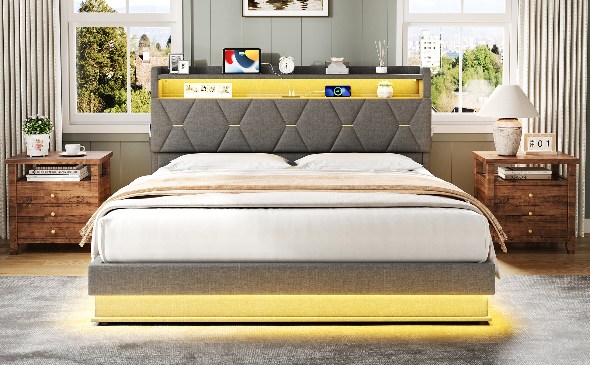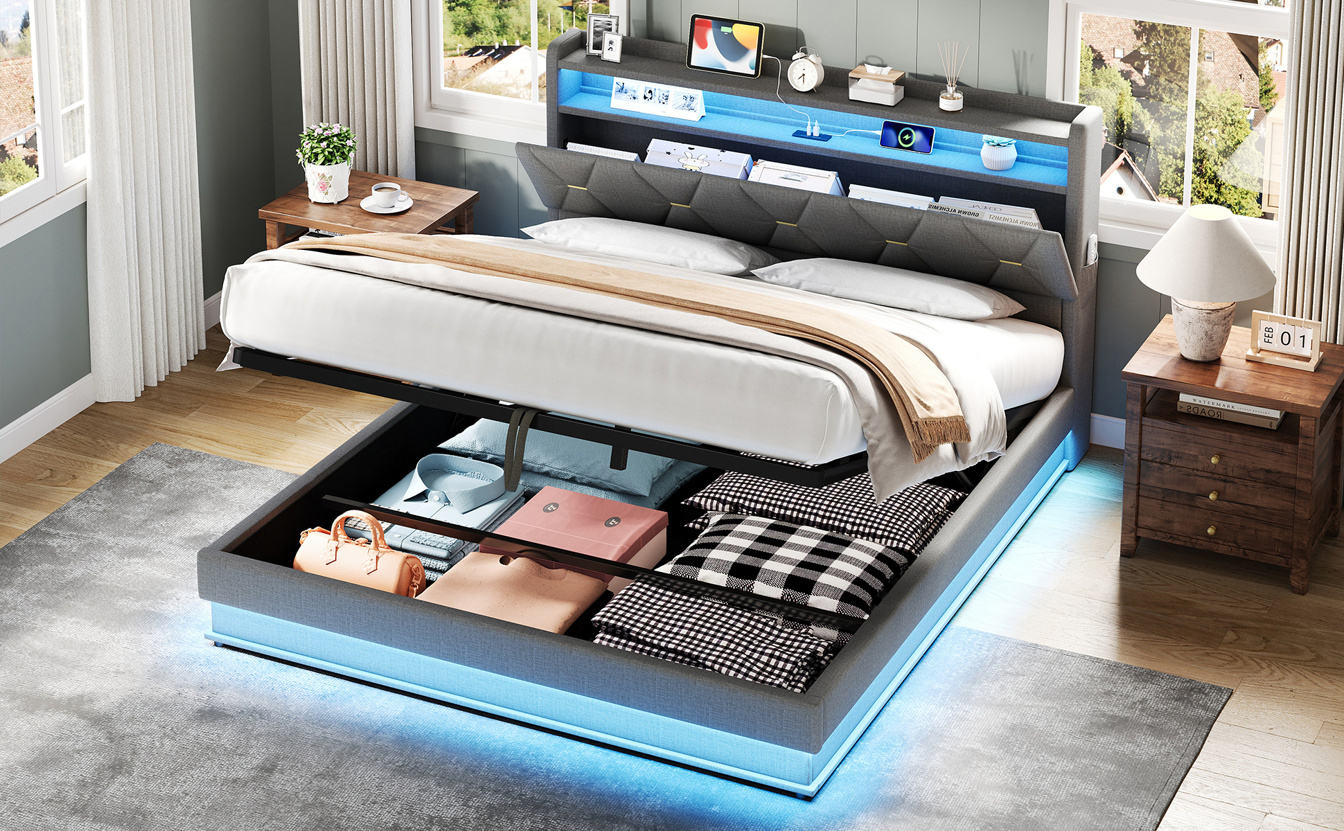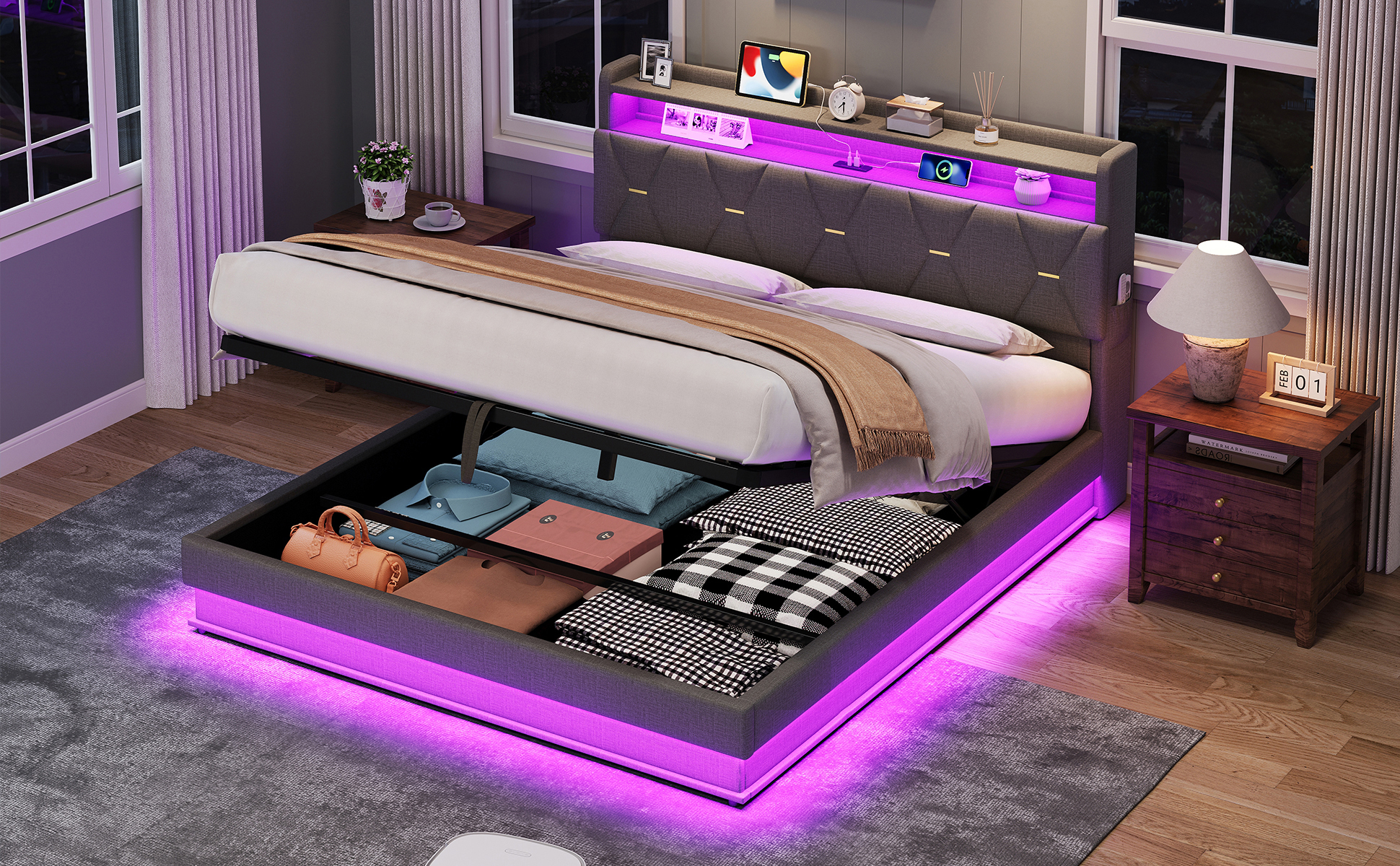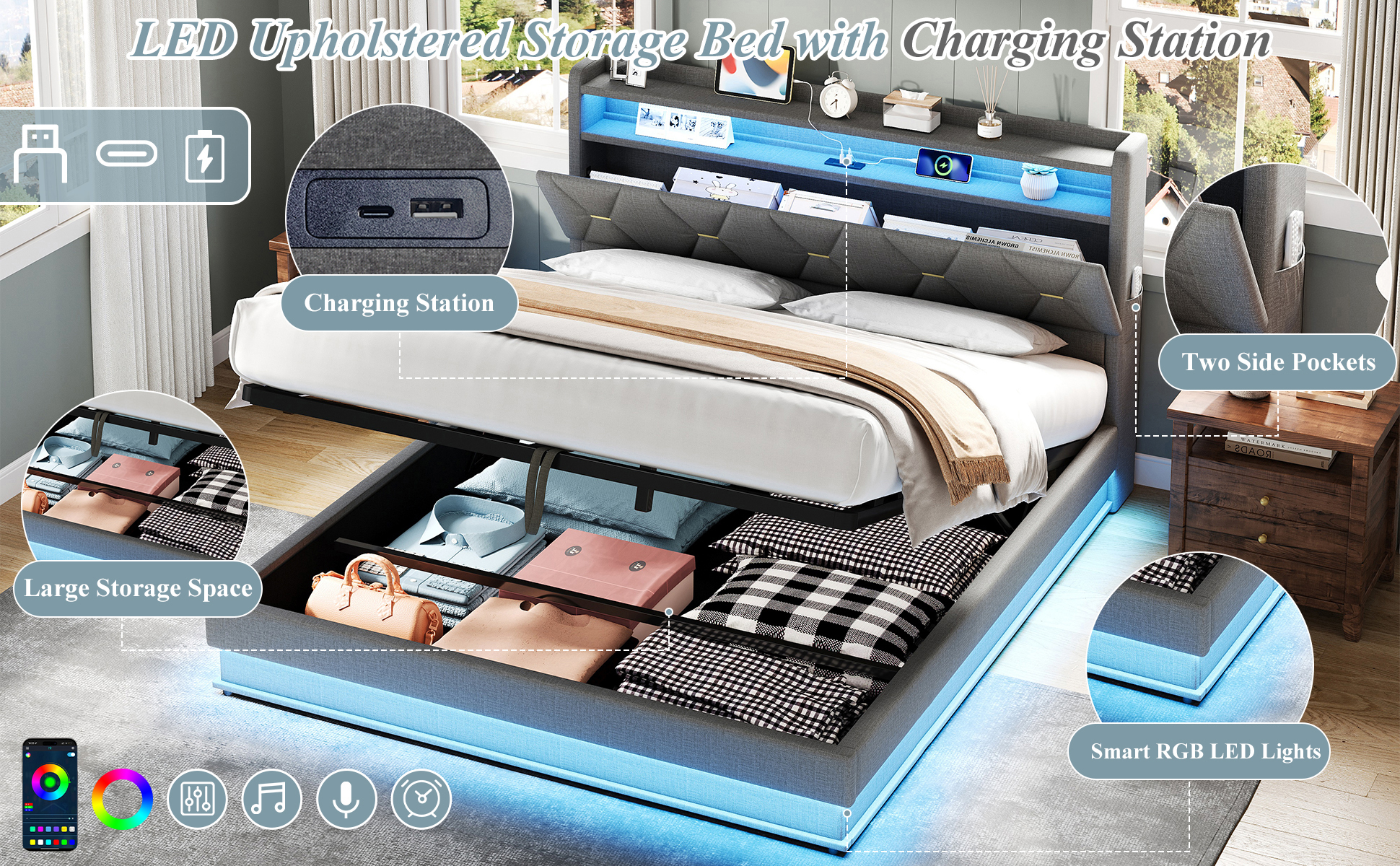 - Combo ItemProduct Name:4ft6 Double Upholstered Bed Frame with Hydraulic Storage, LED Headboard with Charging Station and Concealed Headboard Storage, USB and Type – C Ports, Linen, No Box Spring Needed, Grey (No Mattress)Place of Origin:ChinaMain Color:GreyMain Material:LinenBed Size:135cm*190cmProduct DimensionsAssembled Length (cm):206.00Assembled Width (cm):137.00Assembled Height (cm):110.00Product Weight (kg):52.66Package SizeSub-item 1: N652P266152GPackage Quantity: 1143 * 41.5 * 15.5 cm 27.02 kgSub-item 2: N652P266151GPackage Quantity: 1193.5 * 33.5 * 22 cm 28.33 kgProduct Features[Ample Storage Space] This bed frame uses hydraulic technology to lift and land the platform smoothly, easy to make up the bed and easy to access the items stored under the bed frame. This bed frame comes with a hidden headboard, hidden storage space where you can place your private items. Each side of the bed comes with a pocket on each side, allowing you to get your cell phone, glasses or remote control within reach.[RGB LED Lighting Strip] The headboard and around the bed base of the bed are equipped with RGB lights that can be controlled via mobile app. You can set the brightness and color freely, and there are also control modes such as style mode, music mode, microphone mode and timing function for you to explore. You can design a unique light show according to your own preferences. (Attention: This product does NOT INCLUDE remote control; the LED lighting can only be controlled by APP)[Charging Station] Conveniently located at the bedside, this bed has Type-C and USB ports ensure your devices are always charged and ready to use.[Chic look and Comfortable design] This chic headboard is made of X shape appearance enhances the sophistication of the bed frame. It padded with high resilience sponge and covered with soft Linen Fabric. Its appearance is designed to suit a wide range of home styles. Whether you use it as a primary bed or as a guest bed, you can count on its supportive and comfortable design.[No Box Spring Need] This bed frame comes with sturdy metal and wood support, and as such this bed doesn’t require a box spring. Abandon the box spring, you can save more money and time. Mattress is not included.[Strong Support] This bed frame is made of durable metal-wood frame that combine great sturdiness and outstanding bend resistance. Besides, sturdy support legs and tight connection further enhance stability and provide better support for the whole bed frame.DescriptionsMulti-functional Bed Frame for Enjoying Life!This chic bed frame is made of Linen and the X shape enhances the chic sophistication of the headboard. The smart lamps at the headboard and body of the bed come with multiple light modes, so you can design your own light show to create a dreamy bedroom atmosphere. The headboard is equipped with type-C and USB ports, convenient for you to charge your cell phone, tablet or lamp at any time. It has ample storage space, you can store blankets, bed linen, toys and others under the hydraulic bed, concealed headboard storage, the storage drawers and side pockets to make your bedroom neat and organised. Such a versatile piece, bringing functionality, versatility, and style to your home.