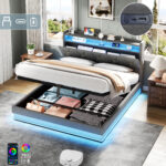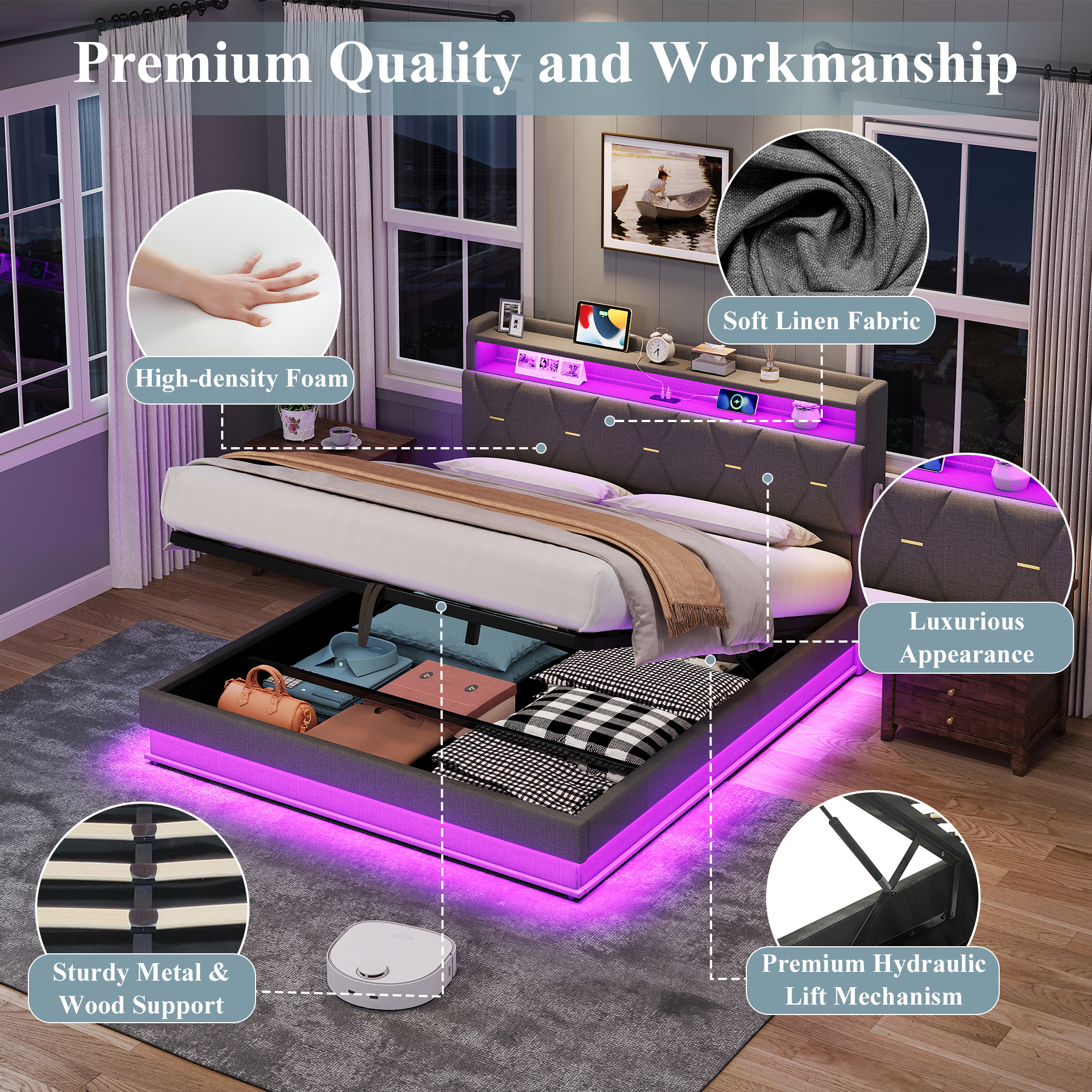 4ft6 Double Upholstered Bed Frame With Hydraulic Storage, LED Headboard With Charging Station And Concealed Headboard Storage, USB And Type – C Ports, Linen, No Box Spring Needed, Grey No Mattress is designed for style, comfort, and everyday use.