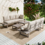 5-6 Seater Garden Lounge Set, Galvanized Iron Frame Outdoor Patio Furniture, 6-Piece Set, Reclining & Adjustable Seating, 2 WPC Tabletop Table Included, Beige Fabric Khaki Frame