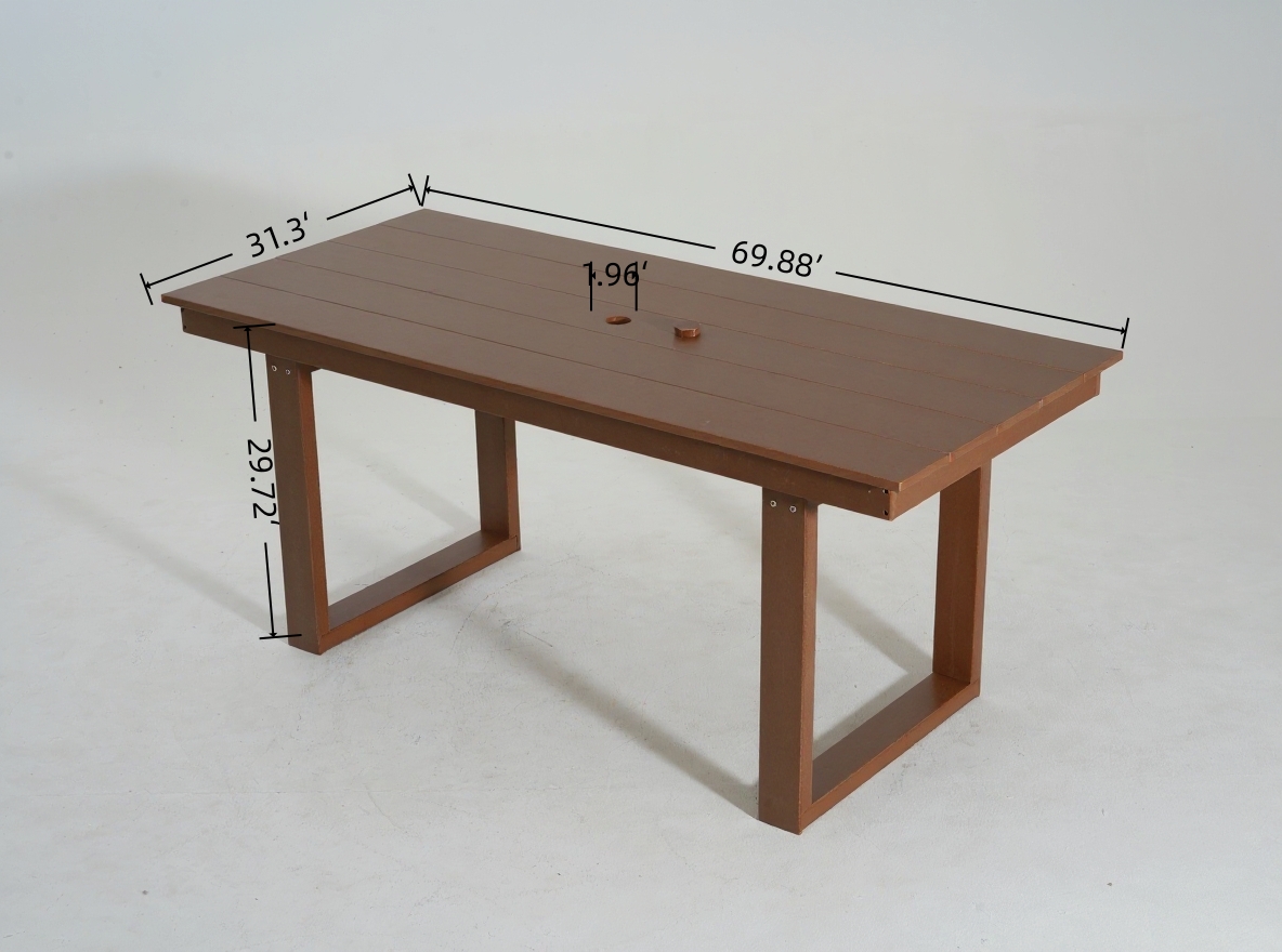 Combo ItemProduct Name:5-Piece Brown HDPE Outdoor Dining Set – Weather-Resistant Patio Table with Umbrella Hole & 4 Chairs for Backyard/PoolsidePlace of Origin:ChinaMain Color:BrownMain Material:HDPEProduct Style:CasualUse Case:Garden & OutdoorSeating Capacity:Seats 4Outdoor Seating Type:Complete Patio SetsSet Design:Dining SetCushions Included:NoFrame Durability:Weather Resistant FrameProduct DimensionsAssembled Length (in.):Not ApplicableAssembled Width (in.):Not ApplicableAssembled Height (in.):Not ApplicableProduct Weight (lbs.):Not ApplicablePackage SizeSub-item 1: W3566P342907Package Quantity: 235.8 * 25.59 * 8.07 in. 56.66 lbs.Sub-item 2: W3566P342697Package Quantity: 169.69 * 33.07 * 4.33 in. 123.01 lbs.
