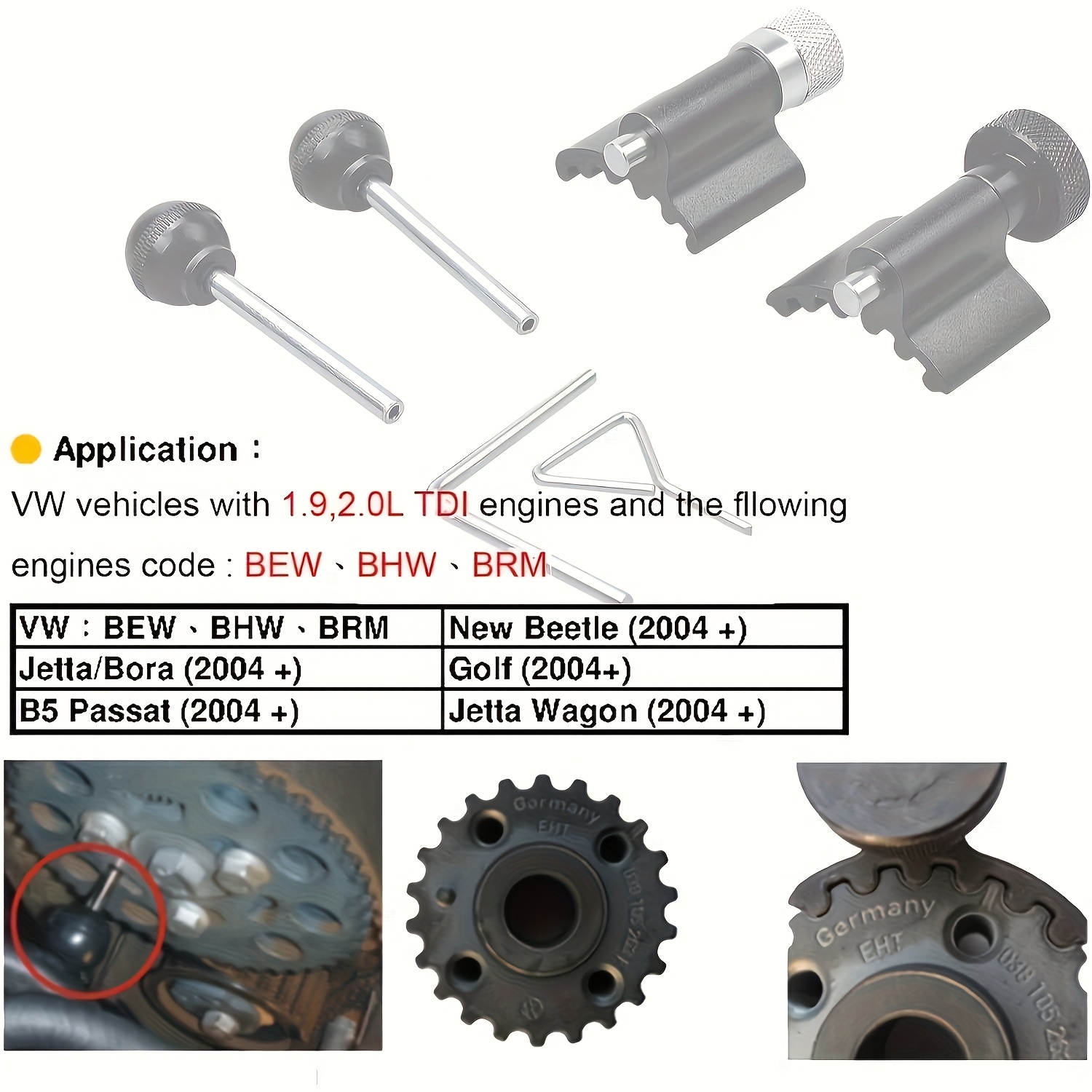 6pcs VW/Audi/Skoda TDI Engine Crankshaft Timing Lock Set Material: Conductive Metal Power Mode: UnchargedApplicable Models: VW Jetta/Bora, Beetle, Passat, Wagon (2004+), Compatible with BMW/RM EngineProduct Features: – Precision Timing Control: Designed to accurately lock the engine crankshaft timing, ensuring precise synchronization during maintenance or repairs. – Durable Construction: Made from high – quality conductive metal, enhancing durability and reliability in mechanical applications. – Wide Compatibility: Suitable for multiple models, including VW Jetta/Bora, Beetle, Passat, Wagon (2004+), and compatible with BMW/RM engines. Manual Power Operation: Specifically engineered for manual power systems, providing efficient control without battery power. – Easy Installation: User – friendly design allows for quick and easy installation, saving time during engine repairs.