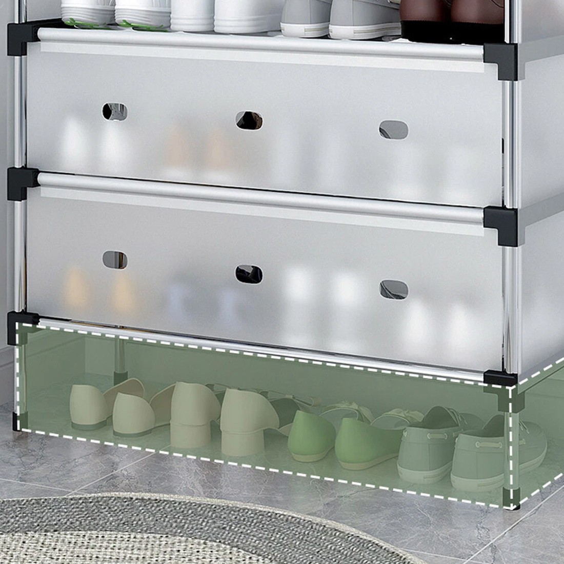 • – Stable and sturdy: Made from stainless steel, this shoes rack is strong and sturdy, able to support a heavy load of shoes and other items.