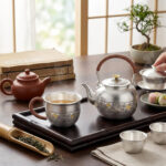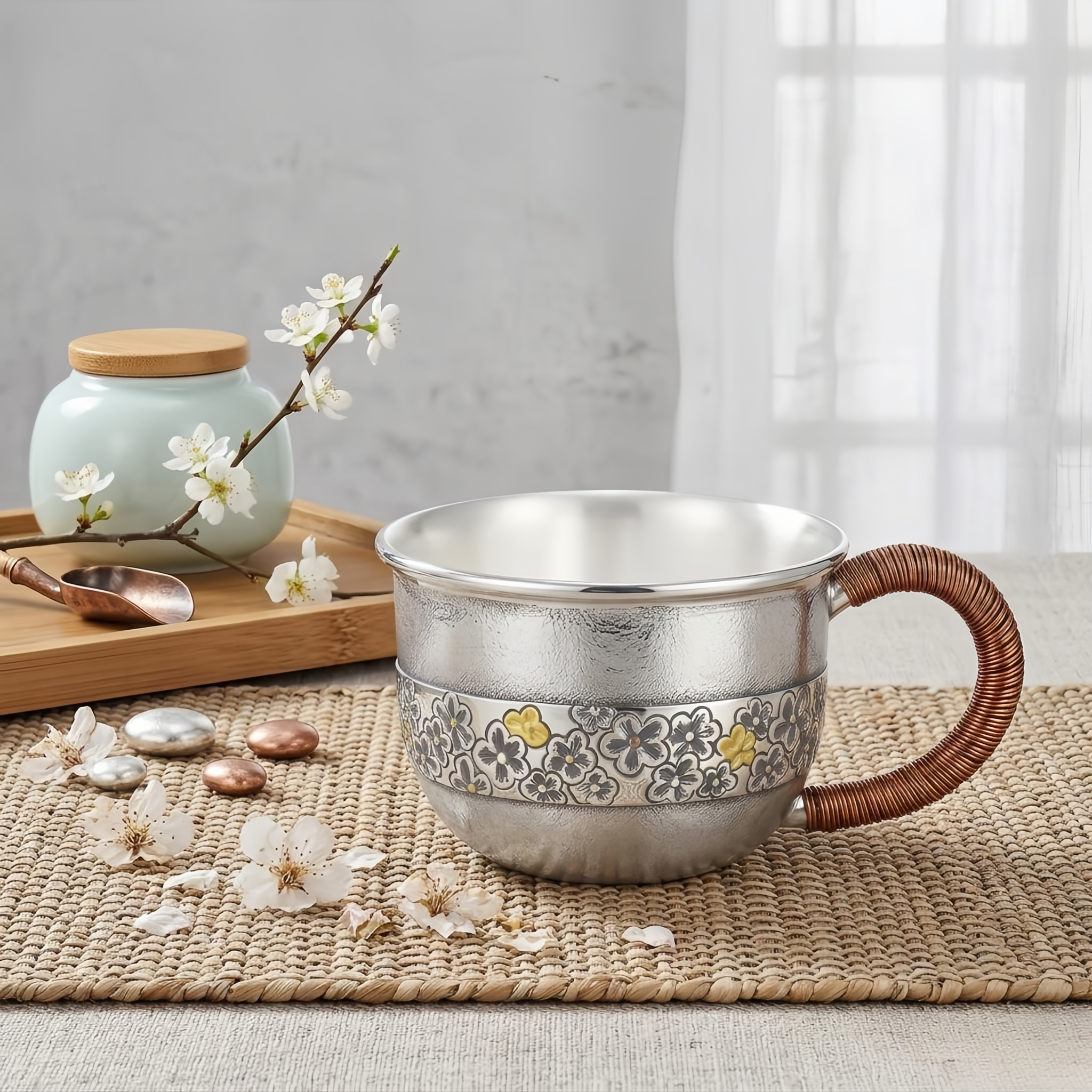This exquisite silver cup features a meticulously hammered body that creates a sophisticated textured finish. A central decorative band is adorned with intricate embossed floral motifs, where select blossoms are highlighted with warm metallic accents to provide a beautiful visual contrast. The ergonomic handle is expertly wrapped in fine copper wire, offering a secure grip and a touch of rustic charm. With its polished interior and wide rim, this cup is designed for both functionality and aesthetic appeal, perfect for serving premium beverages. The fusion of traditional craftsmanship and delicate artistry makes this a unique collector’s piece or a luxurious gift for those who appreciate fine silverware and artisanal design. | Brand: jewelryodm