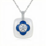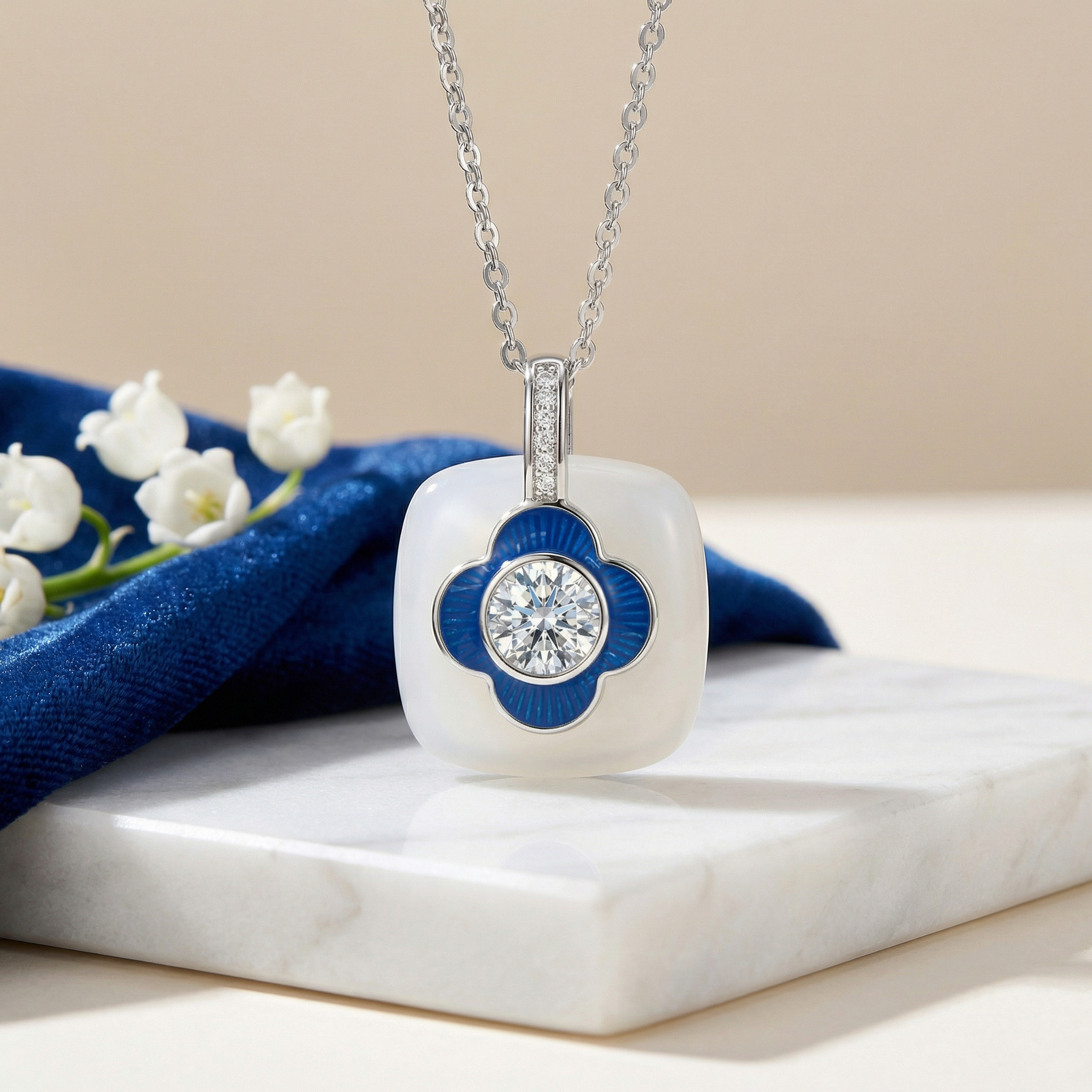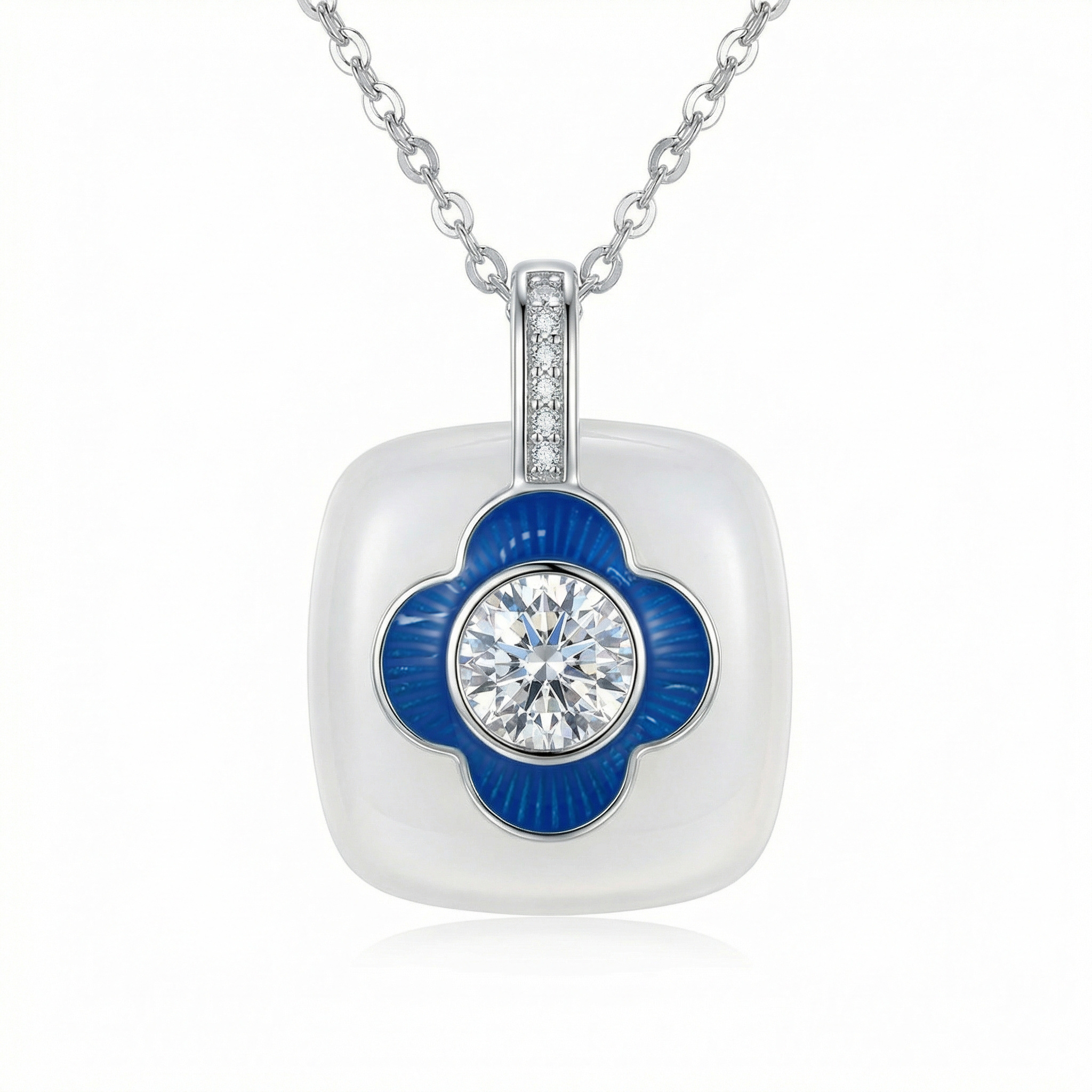 • This exquisite necklace features a unique cushion-shaped pendant crafted from smooth, milky-white ceramic. At its center lies a vibrant blue four-leaf clover motif, meticulously framed in silver-tone metal. A stunning round brilliant-cut stone takes center stage within the clover, catching light from every angle. The sleek bail is also embellished with a row of shimmering pavé-set accents, adding a touch of luxury. Suspended from a delicate silver cable chain, this piece blends modern geometric shapes with timeless floral elements. Perfect for adding a pop of color and sophistication to any ensemble, it represents a harmonious balance of contemporary design and classic elegance. | Brand: jewelryodm