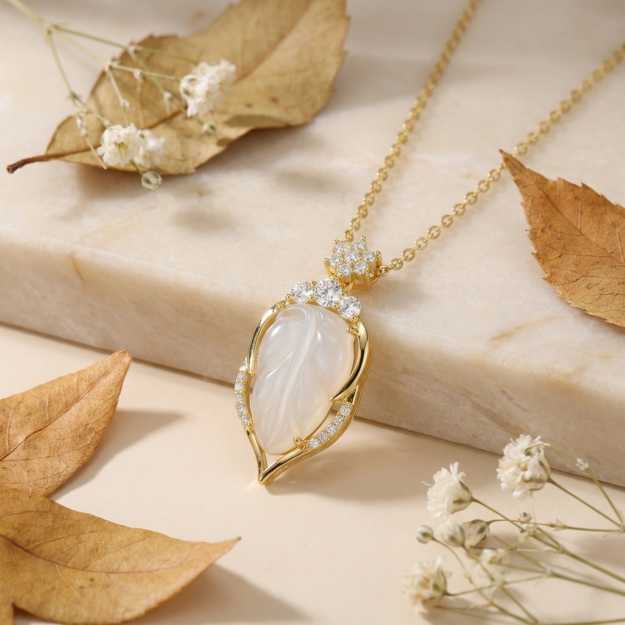 925 Sterling Silver Elegant Carved White Jade Leaf Pendant Necklace with Glistening Accents
