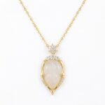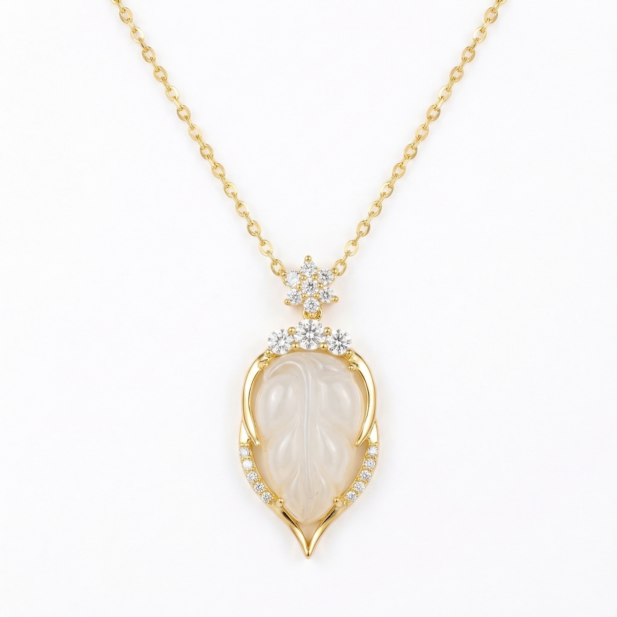 • This exquisite necklace showcases a finely carved white jade pendant shaped like a delicate leaf, capturing the essence of natural beauty. The translucent gemstone is encased in a polished setting that enhances its soft glow. Adorning the bail is an intricate floral motif set with brilliant round diamonds, while three larger stones crown the top of the leaf for added radiance. The lower portion of the frame is delicately pave-set with shimmering accents, creating a seamless play of light. Suspended from a graceful cable chain, this piece offers a sophisticated blend of classic jade artistry and contemporary luxury. Ideal for special occasions or daily elegance, it serves as a timeless statement of grace and refinement. | Brand: jewelryodm