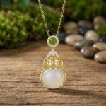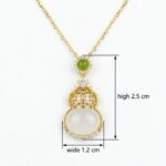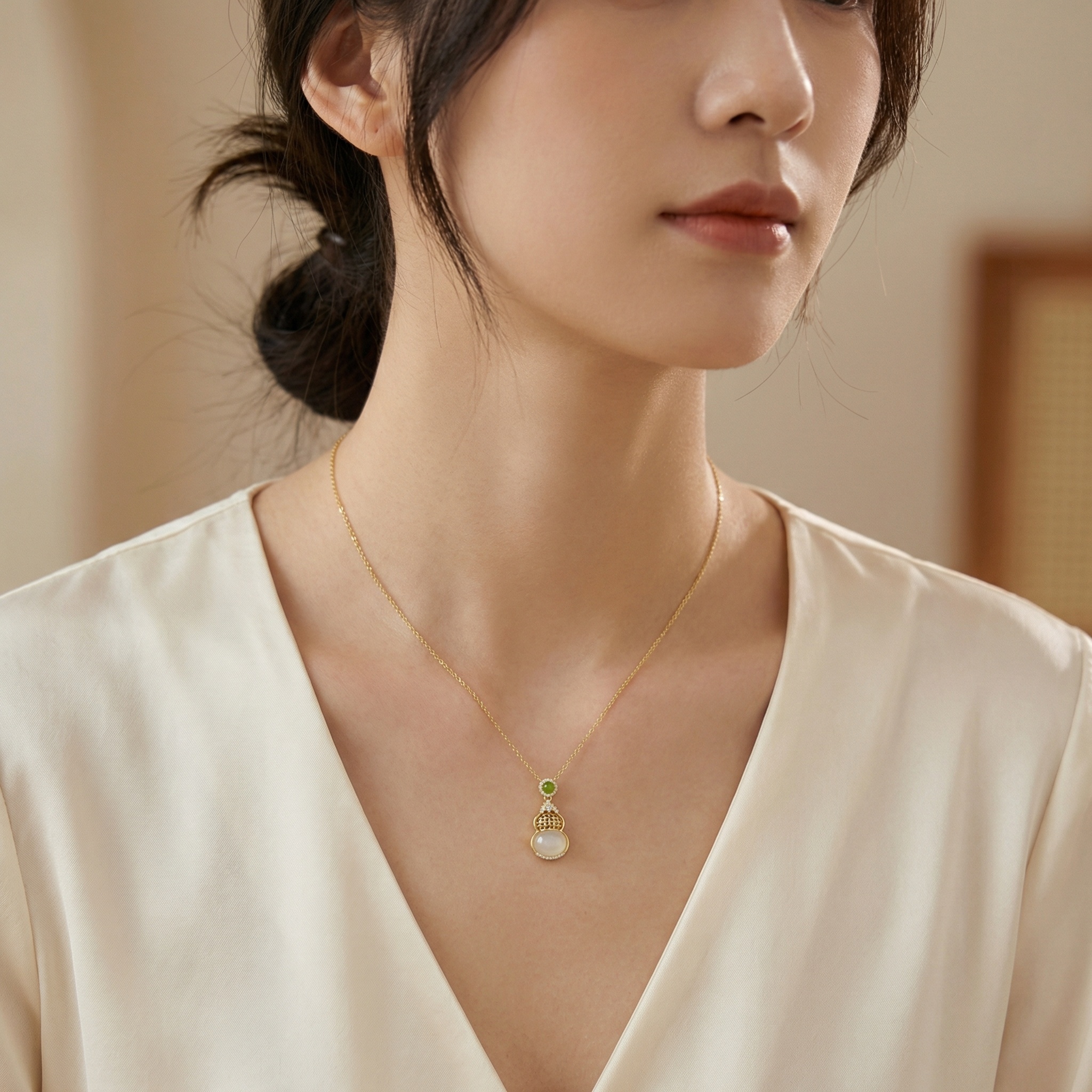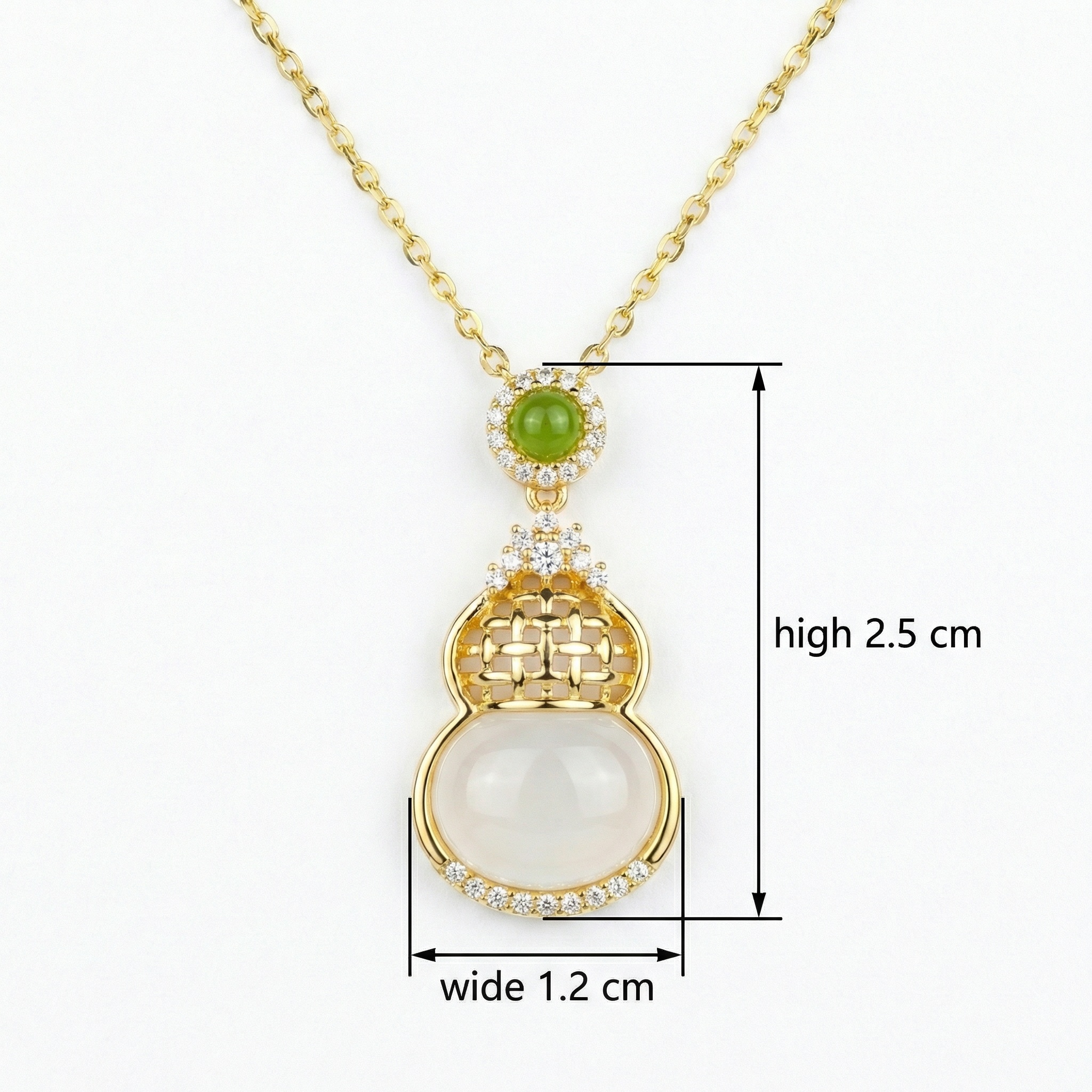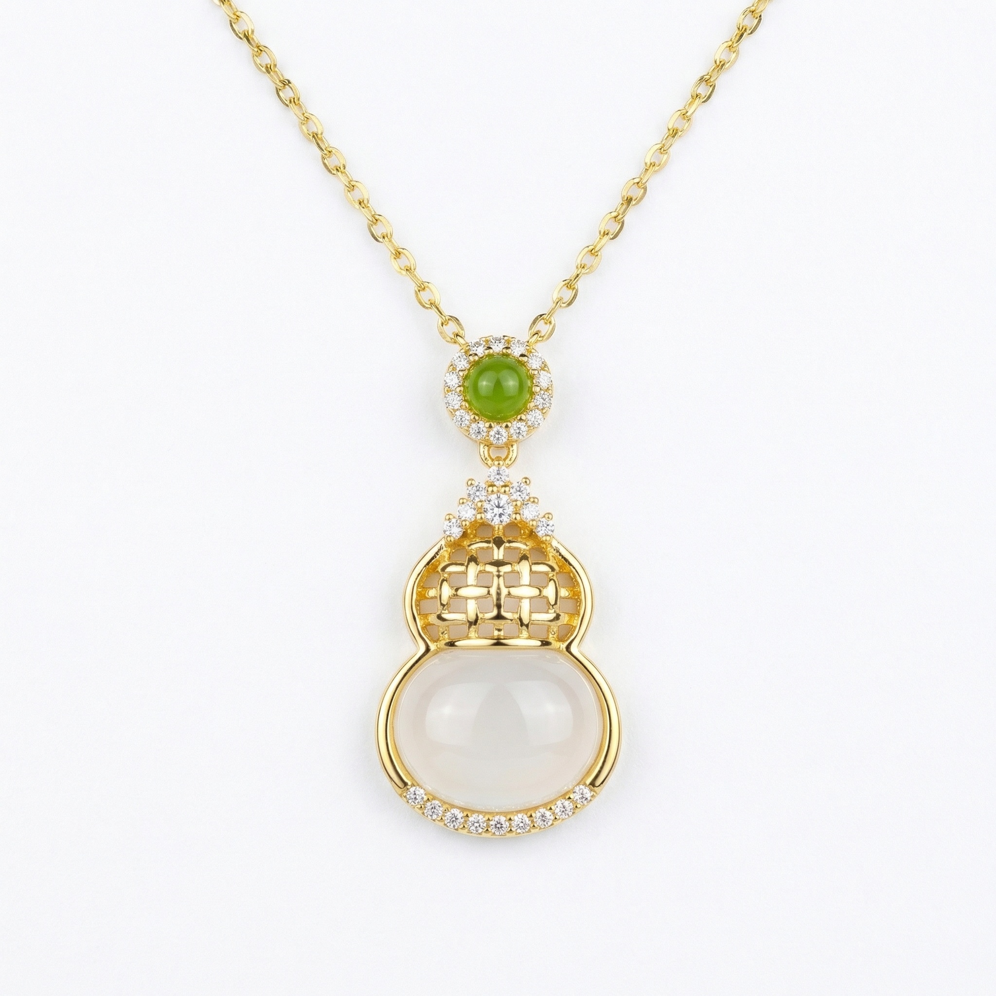 • This exquisite necklace features a traditional double gourd, or “hulu,” pendant, a classic symbol of longevity and prosperity. At the top, a vibrant green cabochon is encircled by shimmering white accents, leading down to an intricate lattice-style metalwork. The base of the pendant showcases a large, smooth, white translucent stone with a milky finish, elegantly framed by a row of sparkling crystals. Hanging from a delicate link chain, this piece beautifully blends cultural motifs with sophisticated elegance. The combination of vibrant green and pure white creates a harmonious aesthetic, making it a perfect gift for special occasions or a meaningful addition to any jewelry collection. The fine craftsmanship highlights the detailed openwork and the lustrous surface of the featured stones, capturing light from every angle for a truly captivating and luxurious appearance. | Brand: jewelryodm