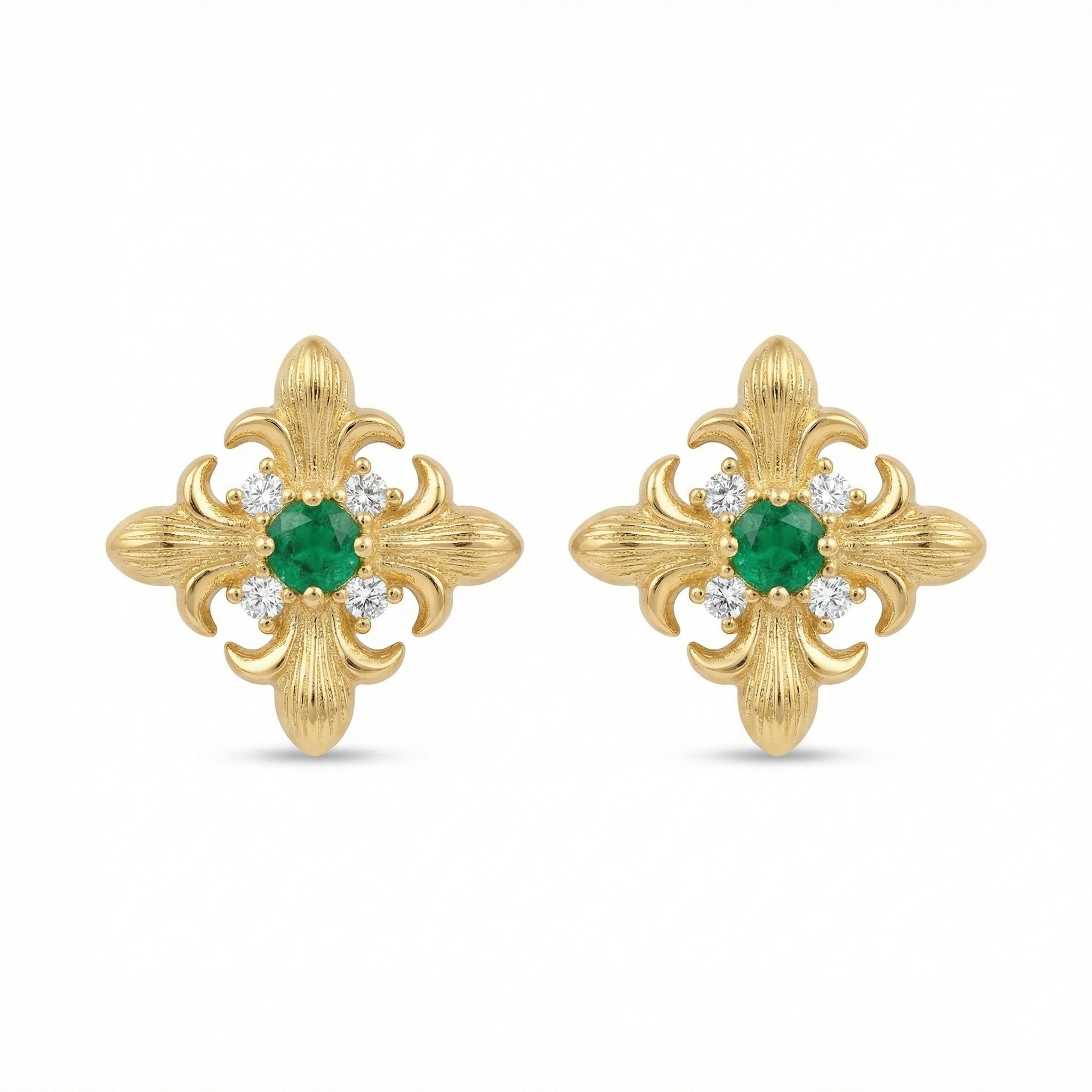 These sophisticated stud earrings showcase a timeless fleur-de-lis motif, meticulously crafted with intricate textured detailing. At the center of each earring sits a brilliant round green emerald, radiating a deep and lush hue. Encircling the central gem are four petite, shimmering white diamonds that add a touch of brilliant sparkle and contrast. The warm-toned metallic setting enhances the vintage-inspired aesthetic, making these earrings a perfect choice for those who appreciate classic elegance and heraldic symbolism. Whether worn for a special occasion or as a refined everyday accessory, these exquisite emerald and diamond pieces bring a regal touch to any ensemble. | Brand: jewelryodm