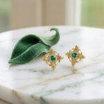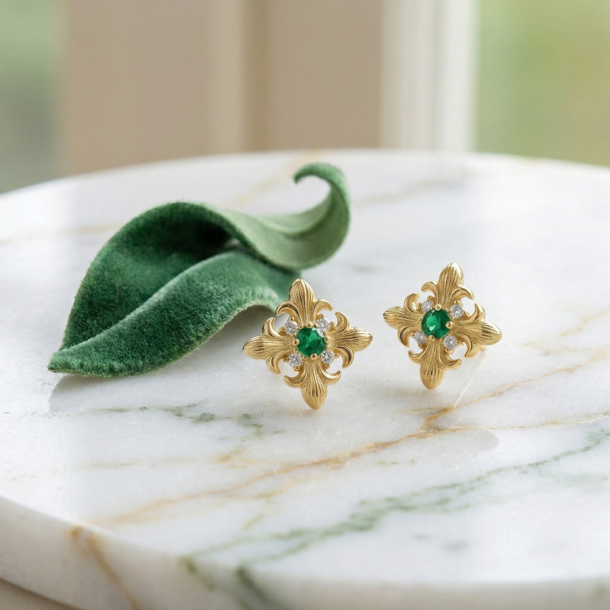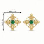 • These sophisticated stud earrings showcase a timeless fleur-de-lis motif, meticulously crafted with intricate textured detailing. At the center of each earring sits a brilliant round green emerald, radiating a deep and lush hue. Encircling the central gem are four petite, shimmering white diamonds that add a touch of brilliant sparkle and contrast. The warm-toned metallic setting enhances the vintage-inspired aesthetic, making these earrings a perfect choice for those who appreciate classic elegance and heraldic symbolism. Whether worn for a special occasion or as a refined everyday accessory, these exquisite emerald and diamond pieces bring a regal touch to any ensemble. | Brand: jewelryodm