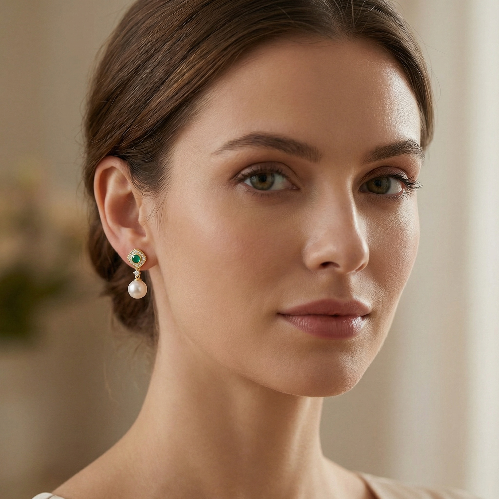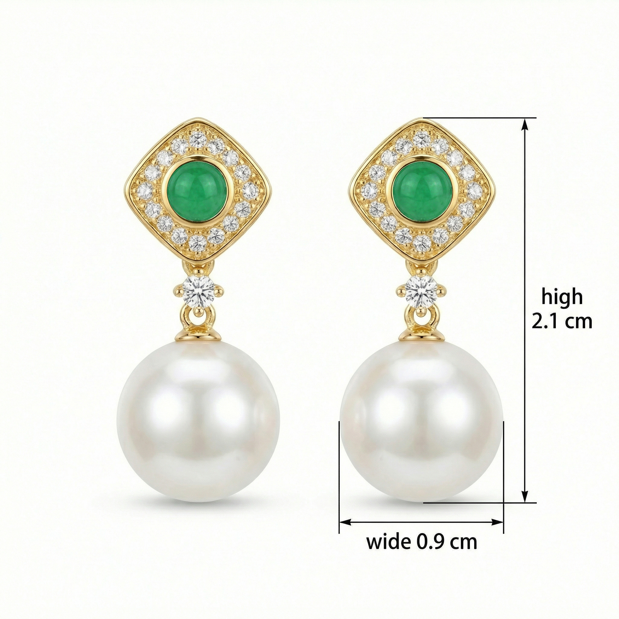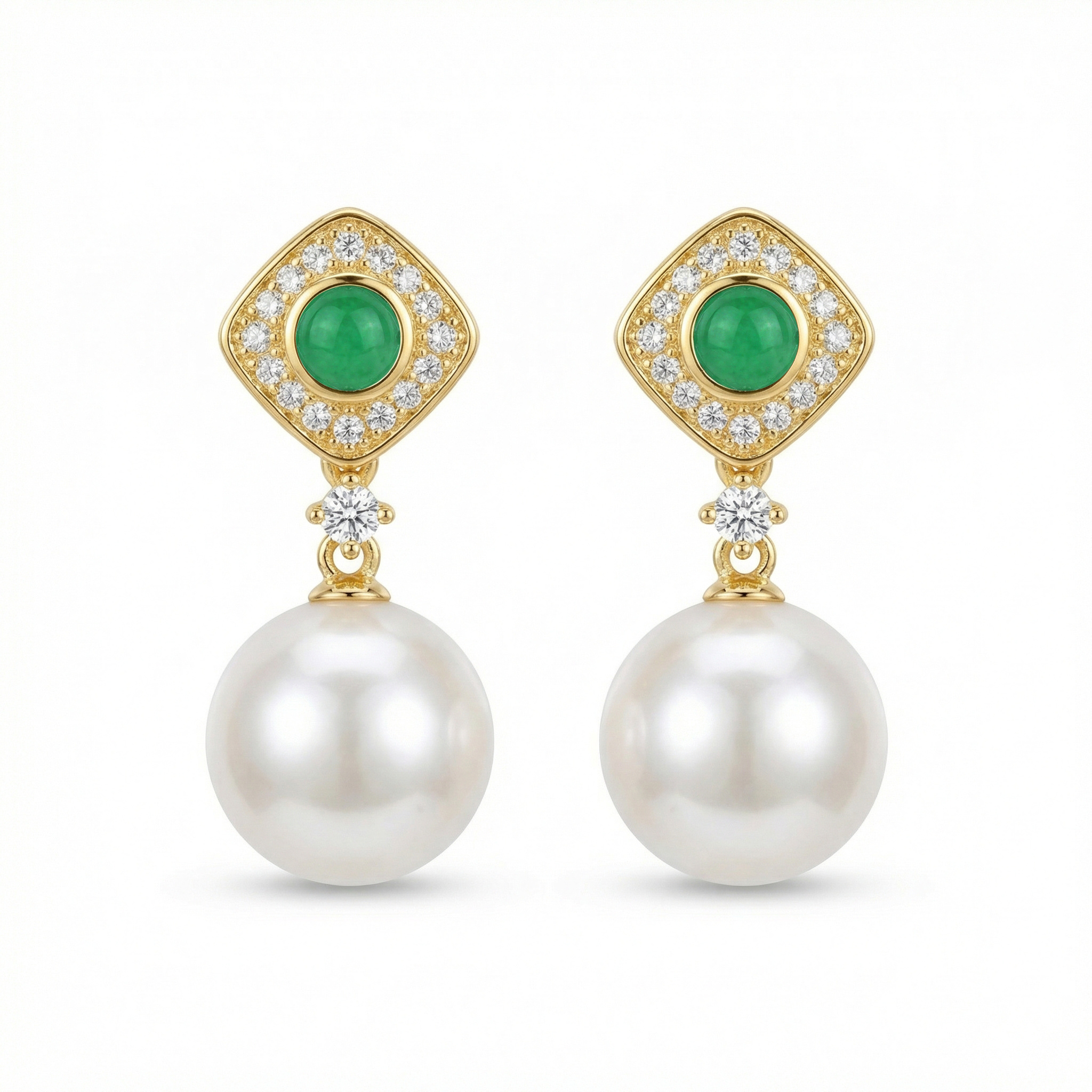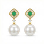 • These exquisite earrings showcase a breathtaking blend of classic elegance and vibrant color. At the top, a rich green emerald is encased in a polished metal halo adorned with sparkling diamonds, forming a sophisticated square-shaped stud. A delicate link featuring an additional brilliant-cut diamond leads to a large, lustrous white pearl that hangs gracefully as a drop. The combination of the deep green gemstones, the shimmering diamonds, and the smooth, creamy glow of the pearls creates a balanced and luxurious aesthetic. Ideal for formal evenings or as a treasured gift, these drop earrings offer a timeless design that radiates sophistication. The warm tones of the setting perfectly highlight the brilliance of the stones and the natural beauty of the pearls, ensuring they remain a centerpiece of any jewelry ensemble. | Brand: jewelryodm