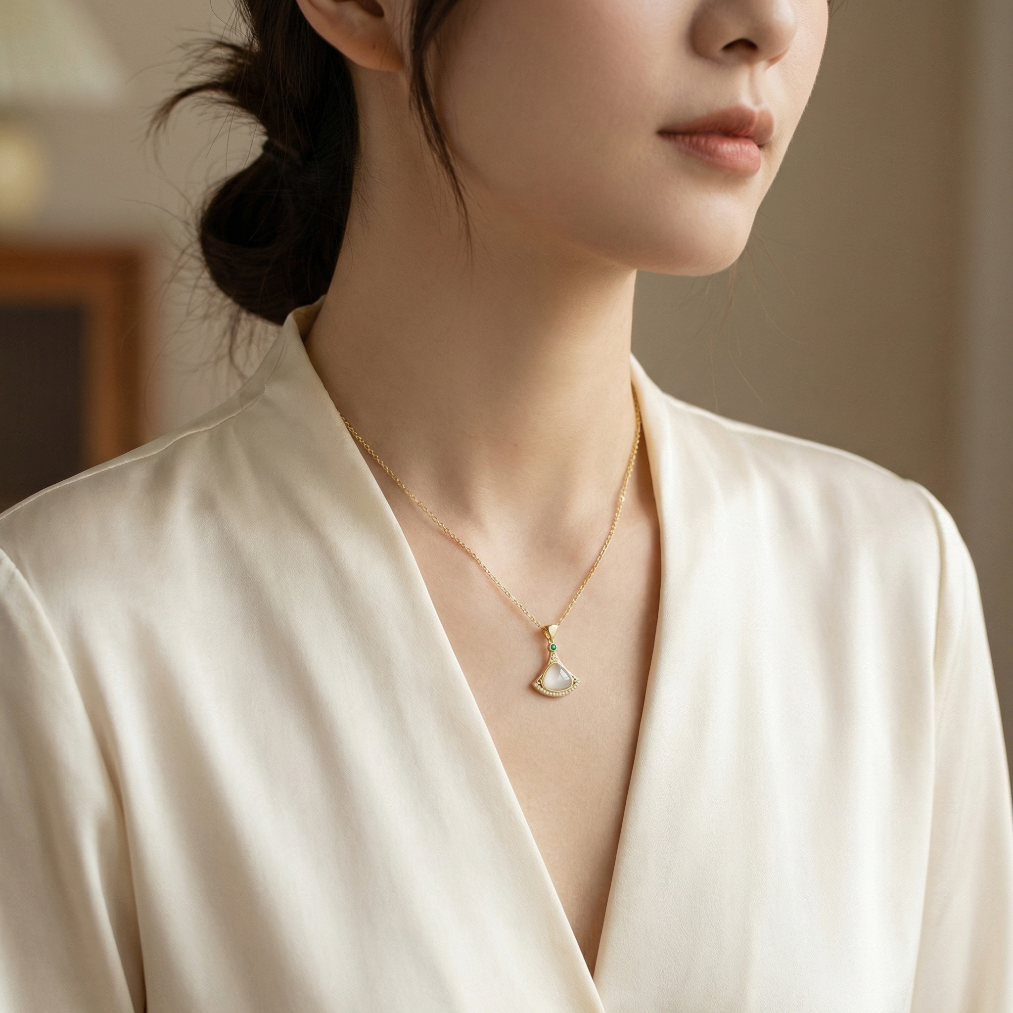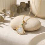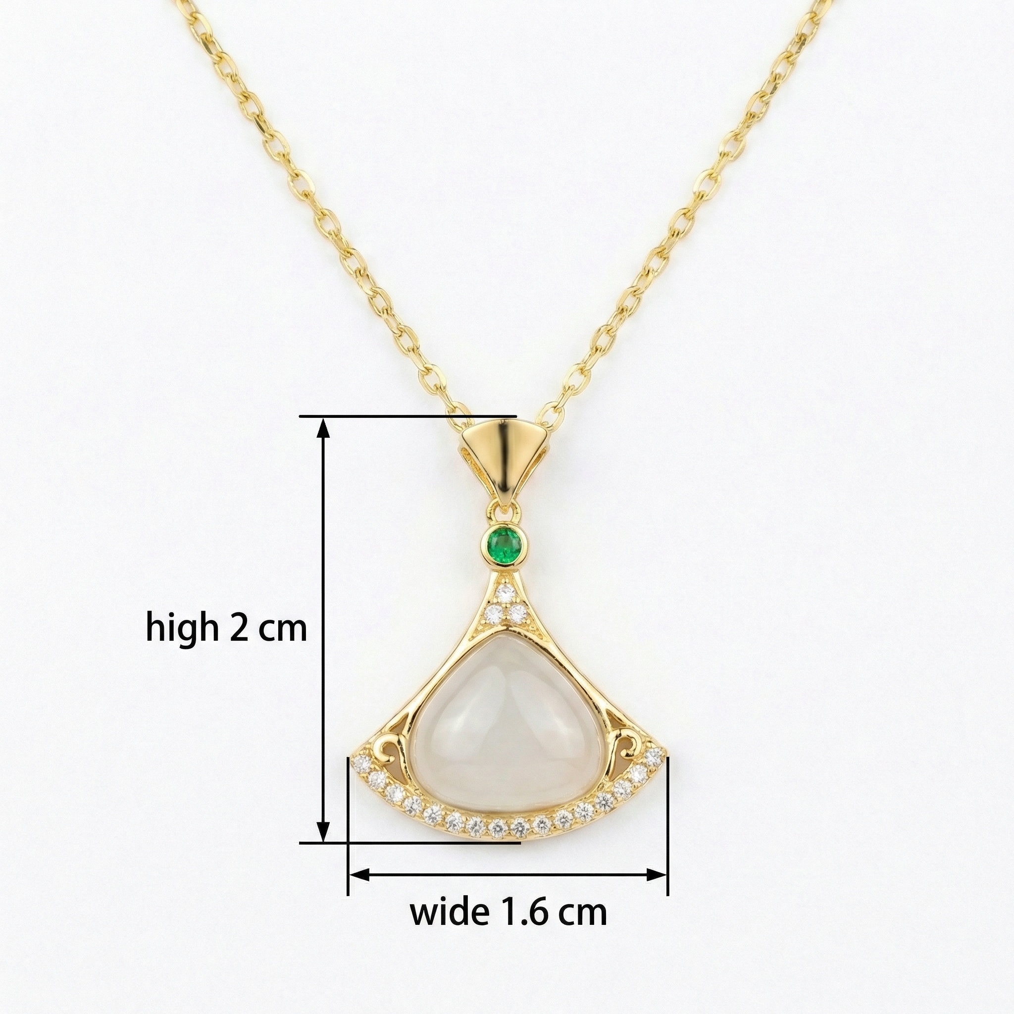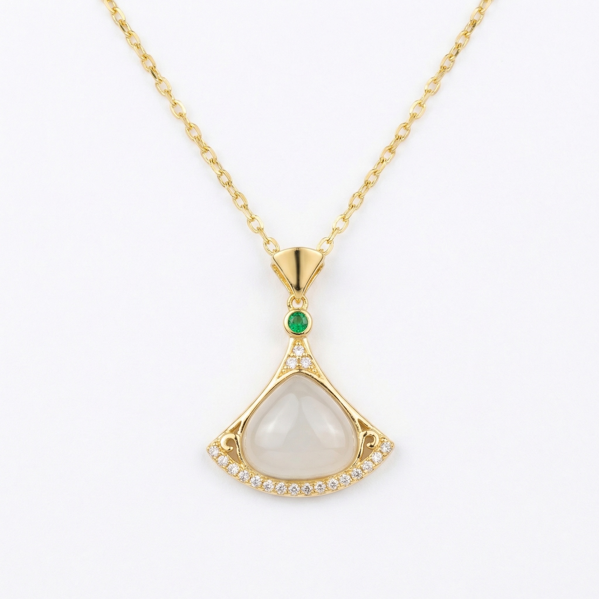 This exquisite necklace showcases a sophisticated fan-shaped pendant that blends classic charm with modern elegance. The focal point is a smooth, pearlescent white stone, gracefully enclosed within a polished metallic frame adorned with shimmering crystals. A brilliant green gemstone provides a pop of color at the apex, creating a stunning visual harmony against the warm tones of the metal. Suspended from a delicate chain, this versatile piece is perfect for both formal events and everyday refinement. Its meticulous design reflects a commitment to beauty and detail, making it a timeless addition to any jewelry collection. Whether worn as a statement piece or as a subtle accent, this necklace captures a sense of effortless grace and luxury, making it a perfect gift for any special occasion. | Brand: jewelryodm