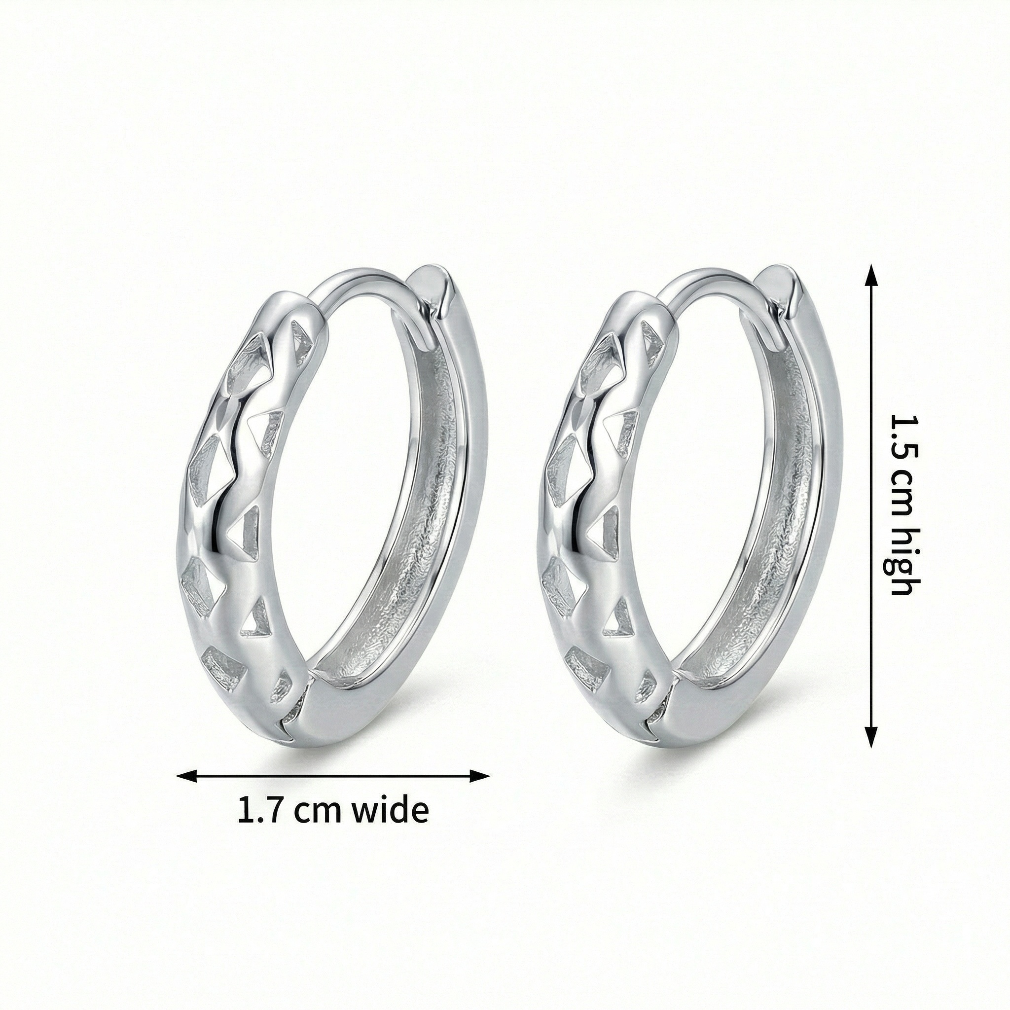 These stunning silver hoop earrings feature a modern and sophisticated design, perfect for adding a touch of elegance to any outfit. Crafted with a high-polish finish, the earrings showcase an intricate geometric cutout pattern that creates a beautiful play of light and shadow. The hollowed-out triangular motifs offer a contemporary aesthetic while keeping the earrings lightweight and comfortable for all-day wear. Equipped with a secure hinged clasp mechanism, these hoops are easy to put on and take off, ensuring they stay safely in place. Their versatile style makes them suitable for both casual daily wear and more formal occasions. Whether you’re dressing up for a night out or looking for a chic accessory for the office, these timeless geometric hoops are a perfect choice. They make an excellent gift for someone special or a stylish addition to your own jewelry collection. | Brand: jewelryodm