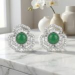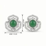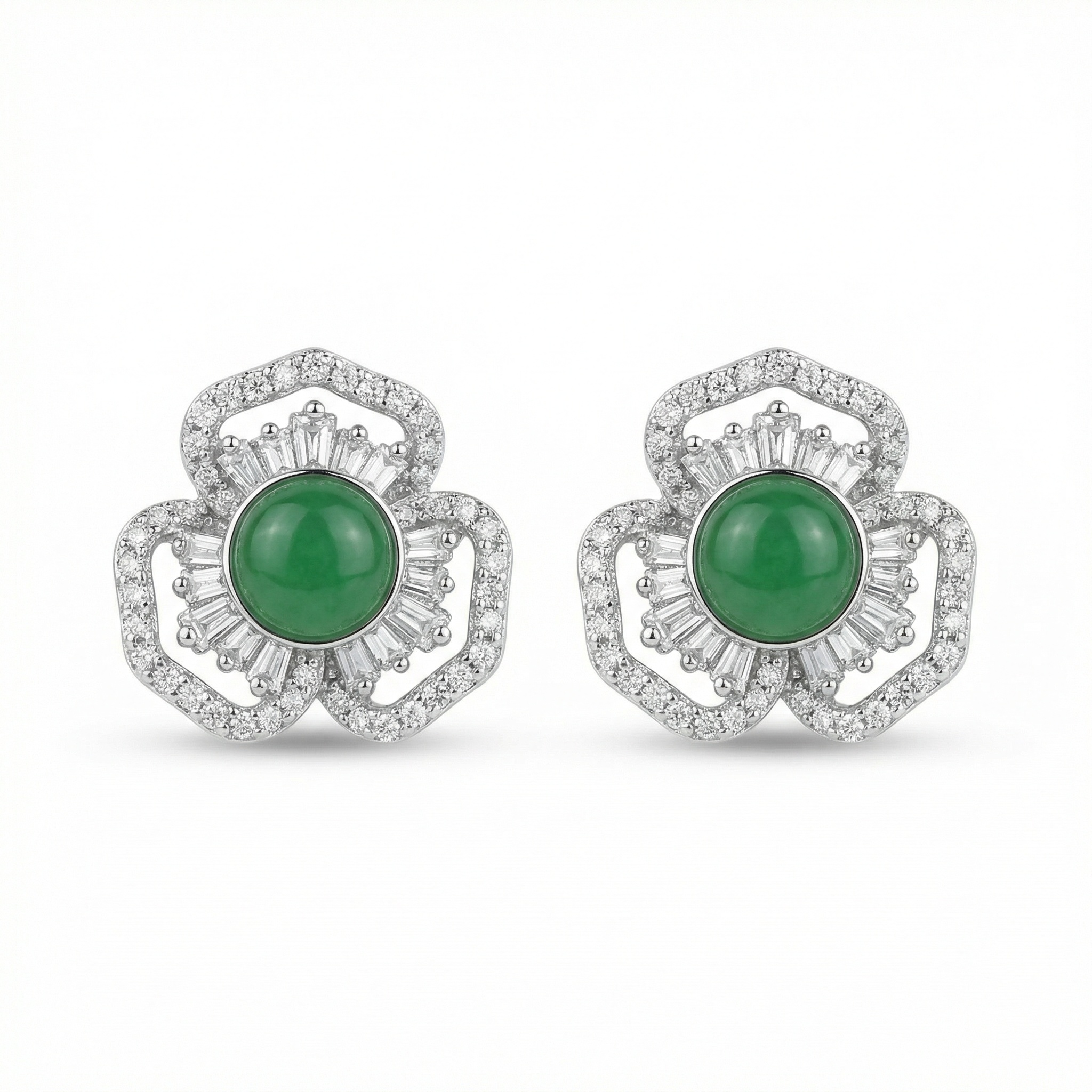925 Sterling Silver Elegant Green Gemstone Flower Stud Earrings with Shimmering Baguette and Round Accents