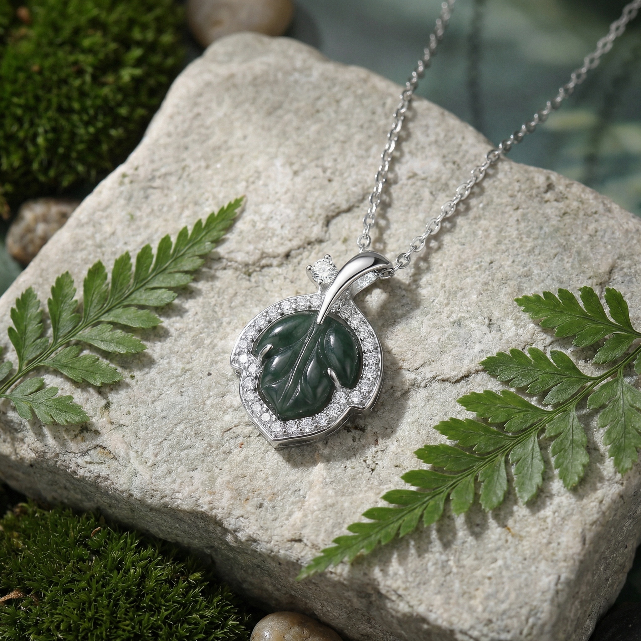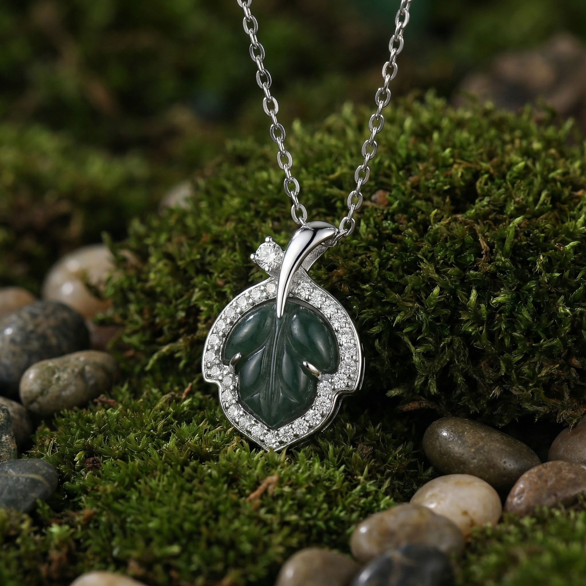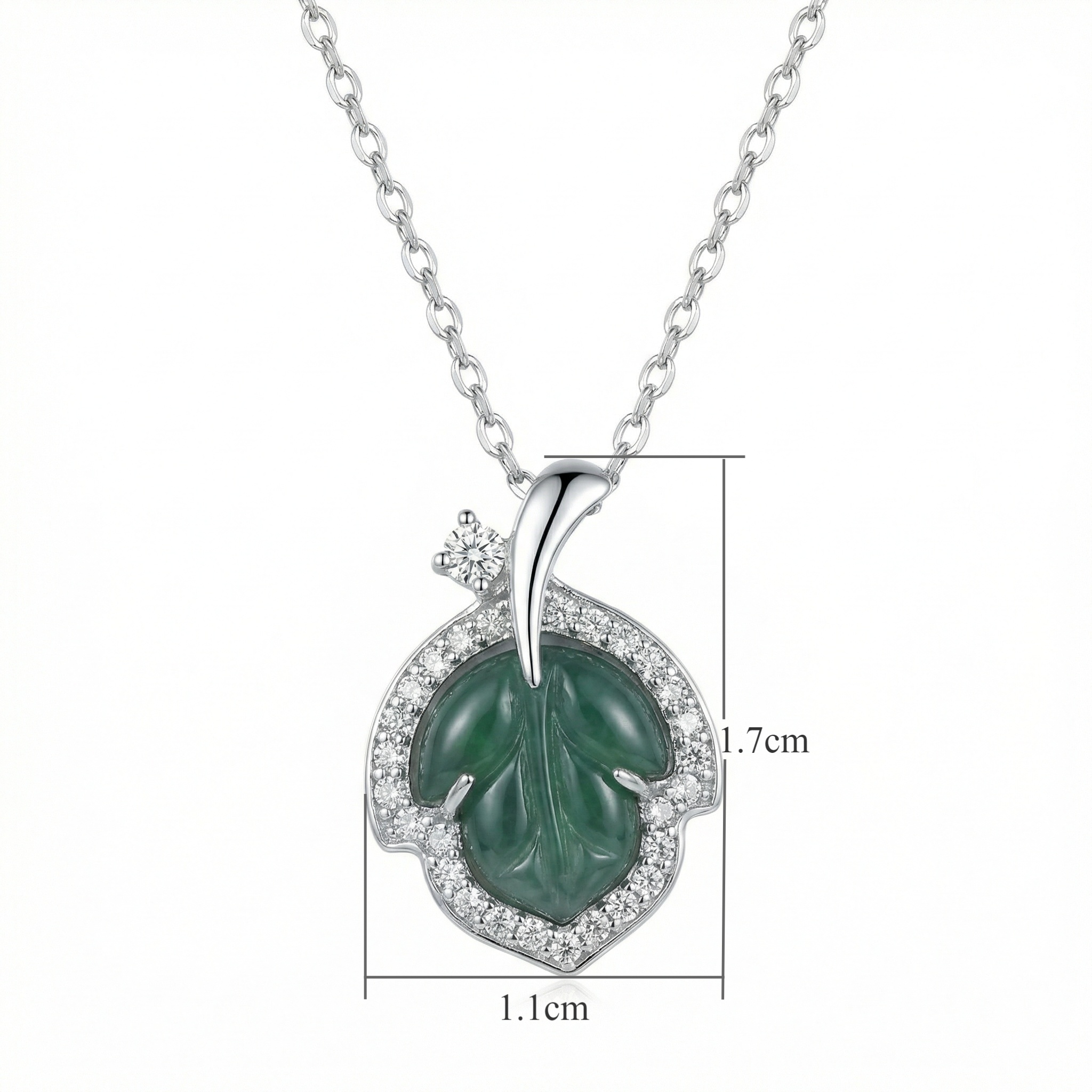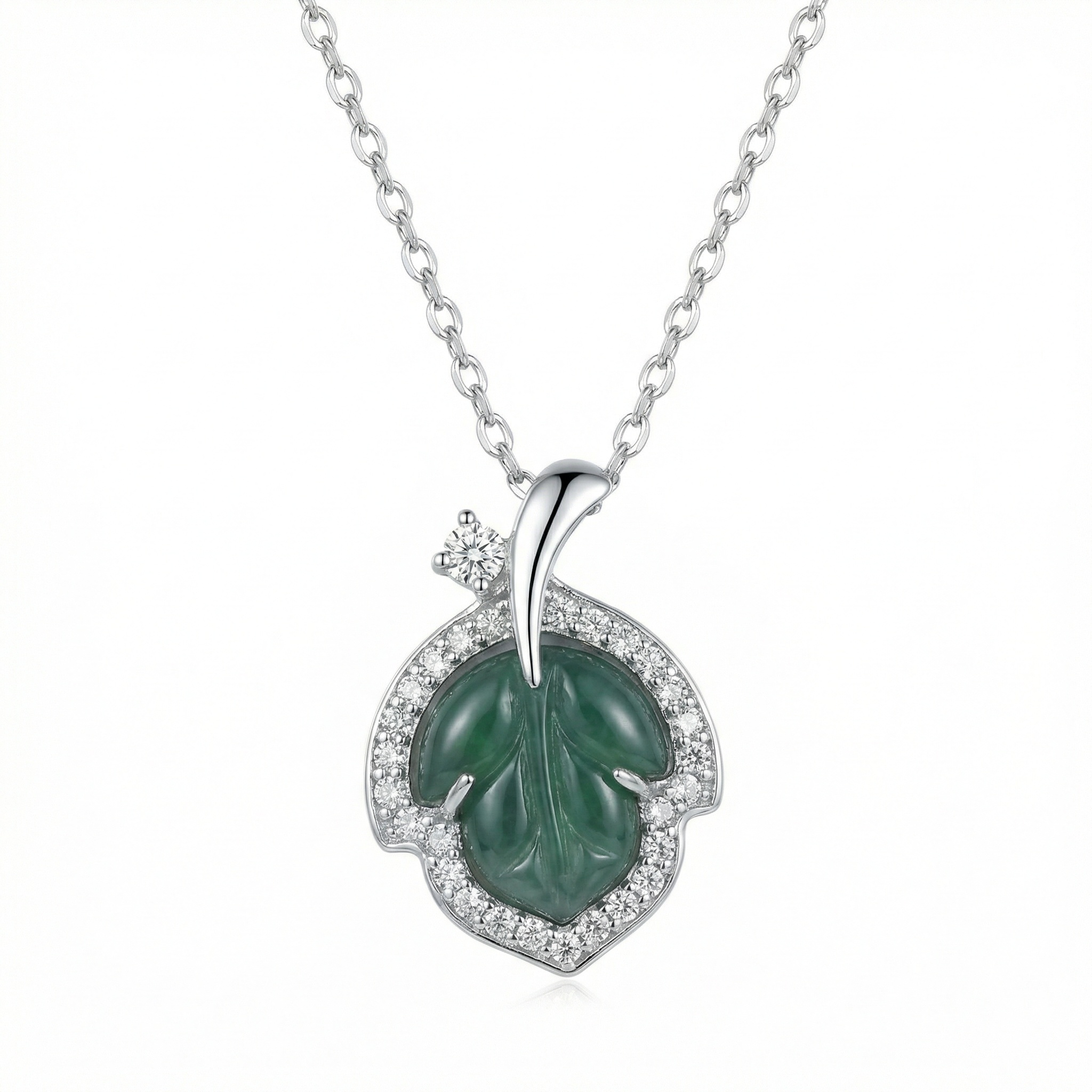 • This exquisite necklace features a beautifully carved green jade leaf, symbolizing natural beauty and vitality. The deep green gemstone is delicately encased in a polished silver-toned setting and surrounded by a halo of sparkling round-cut stones. An additional brilliant accent stone sits above the leaf, leading to a refined bail and a classic cable chain. The combination of the rich, earthy jade and the brilliant shimmer of the surrounding stones creates a timeless piece that exudes elegance. Whether worn as a statement piece for a special event or as a sophisticated daily accessory, this nature-inspired pendant adds a touch of grace and luxury to any ensemble. | Brand: jewelryodm