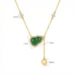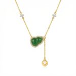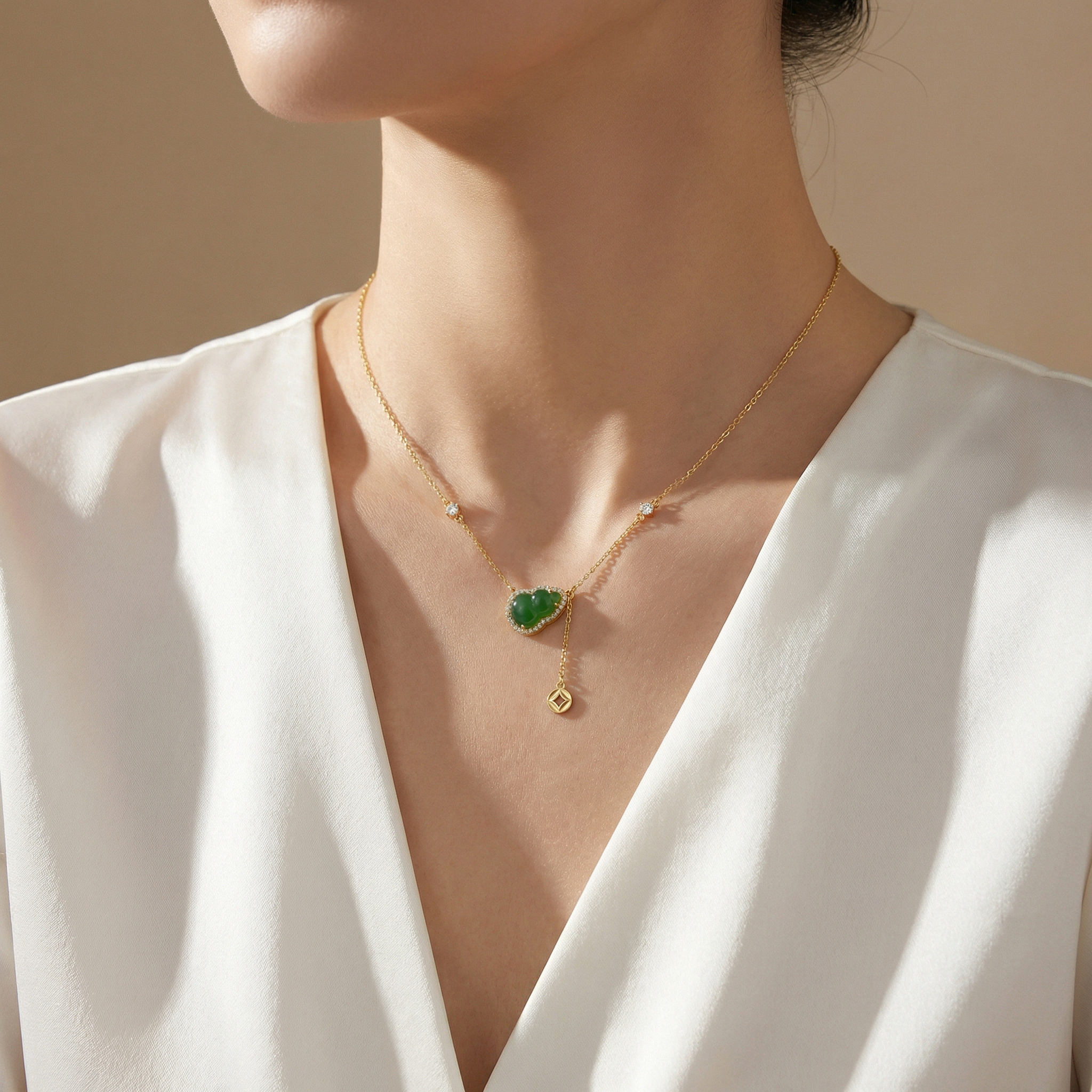 • This exquisite necklace features a vibrant green jadeite pendant shaped like a traditional gourd, symbolizing prosperity and longevity. The central jade piece is meticulously framed by a halo of brilliant white stones that capture the light beautifully. The delicate chain is further enhanced by two bezel-set accent gems, adding a touch of sophisticated sparkle. A unique dangling chain hangs elegantly from the pendant, finished with a classic coin-inspired charm that represents wealth and harmony. The rich green hue of the jade contrasts perfectly with the polished metallic setting, creating a timeless design that blends cultural tradition with modern elegance. Ideal for gifting or personal wear, this stunning piece serves as a meaningful talisman and a luxurious fashion statement. | Brand: jewelryodm