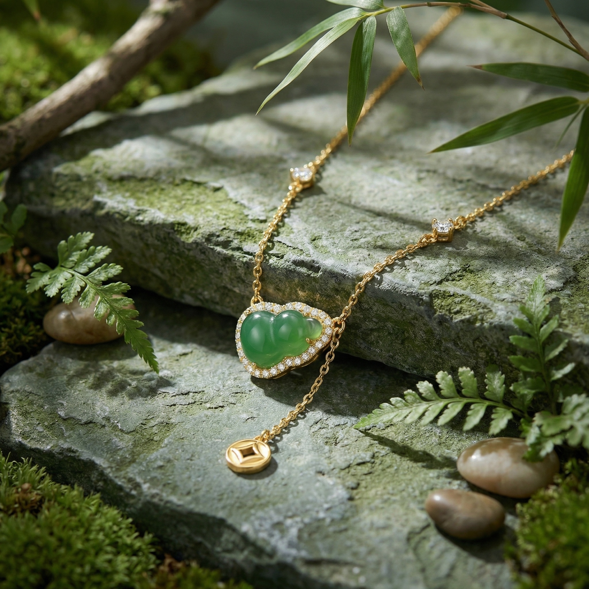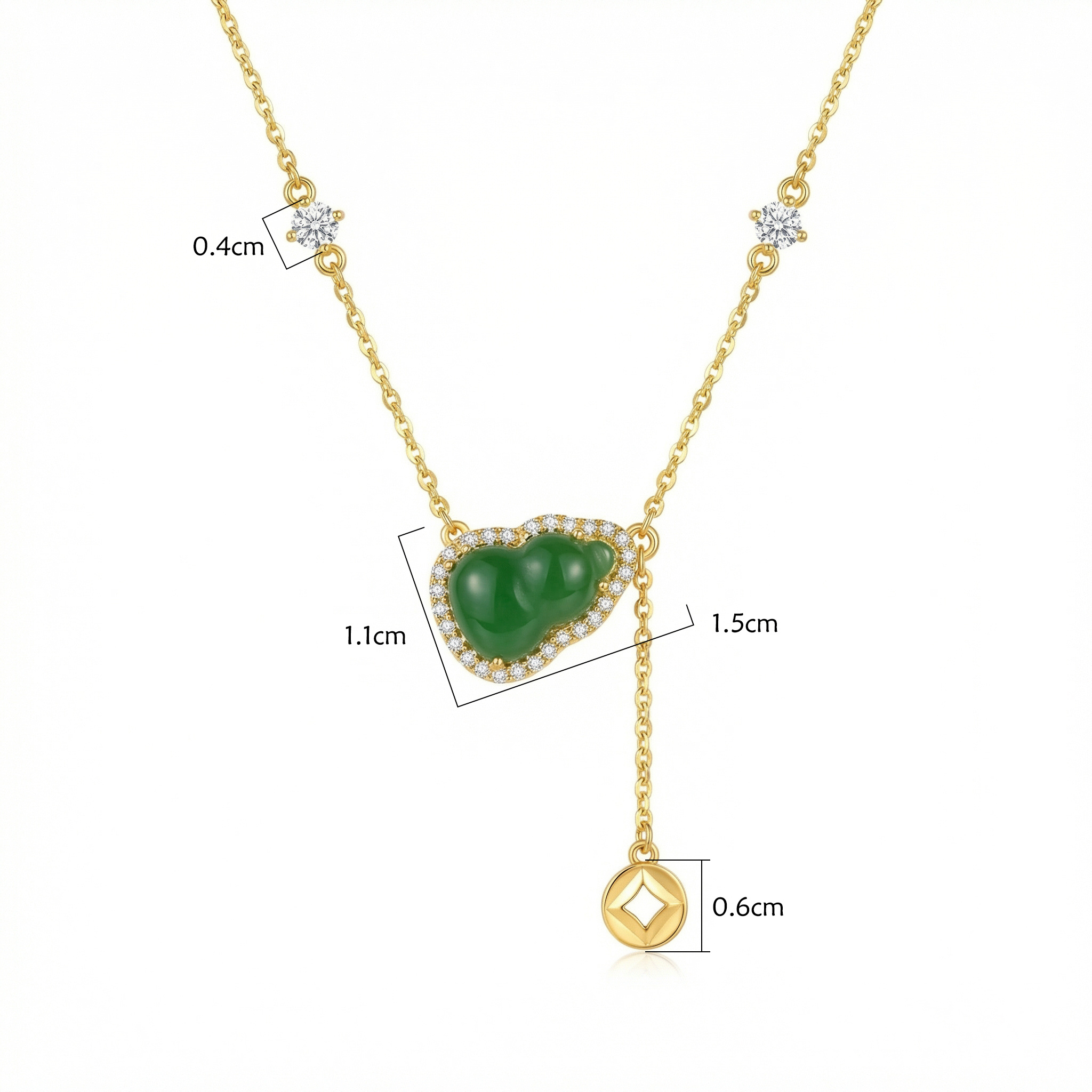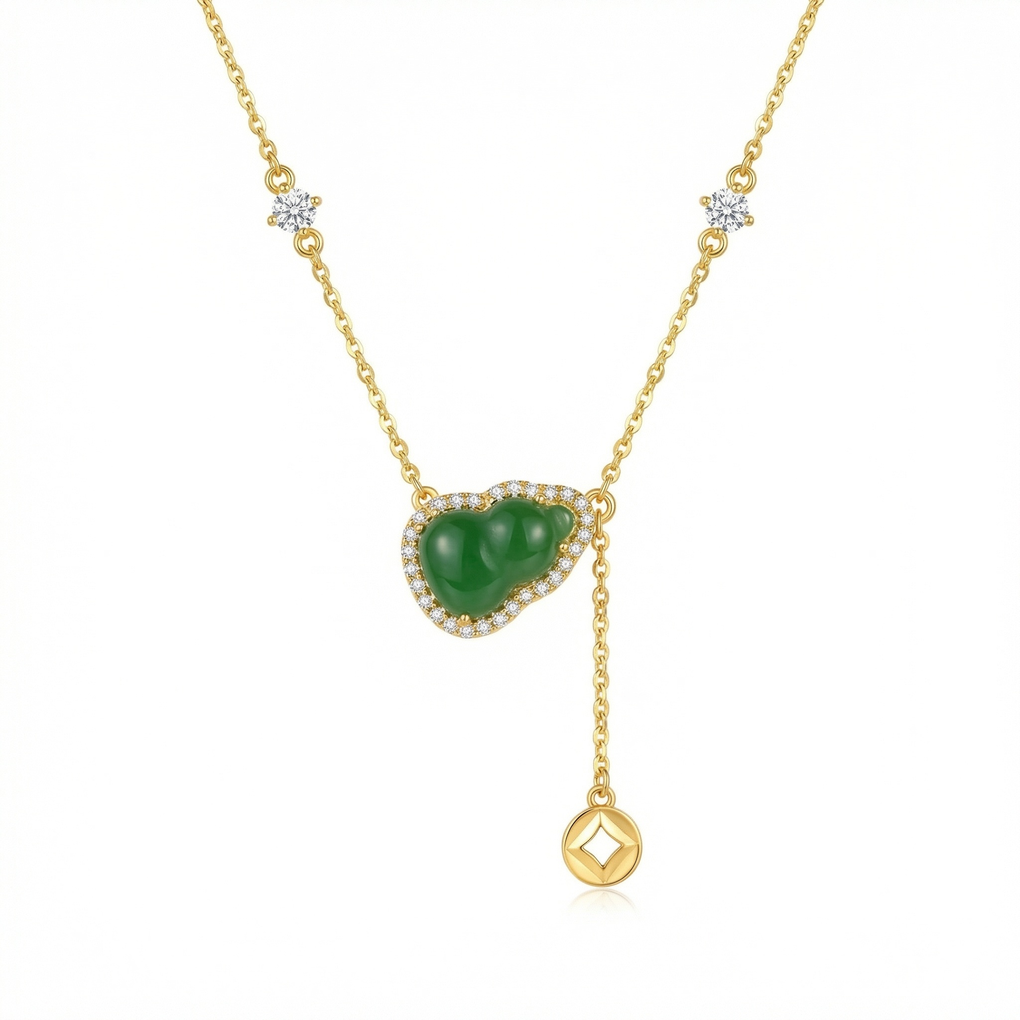 This exquisite necklace features a vibrant green jadeite pendant shaped like a traditional gourd, symbolizing prosperity and longevity. The central jade piece is meticulously framed by a halo of brilliant white stones that capture the light beautifully. The delicate chain is further enhanced by two bezel-set accent gems, adding a touch of sophisticated sparkle. A unique dangling chain hangs elegantly from the pendant, finished with a classic coin-inspired charm that represents wealth and harmony. The rich green hue of the jade contrasts perfectly with the polished metallic setting, creating a timeless design that blends cultural tradition with modern elegance. Ideal for gifting or personal wear, this stunning piece serves as a meaningful talisman and a luxurious fashion statement. | Brand: jewelryodm