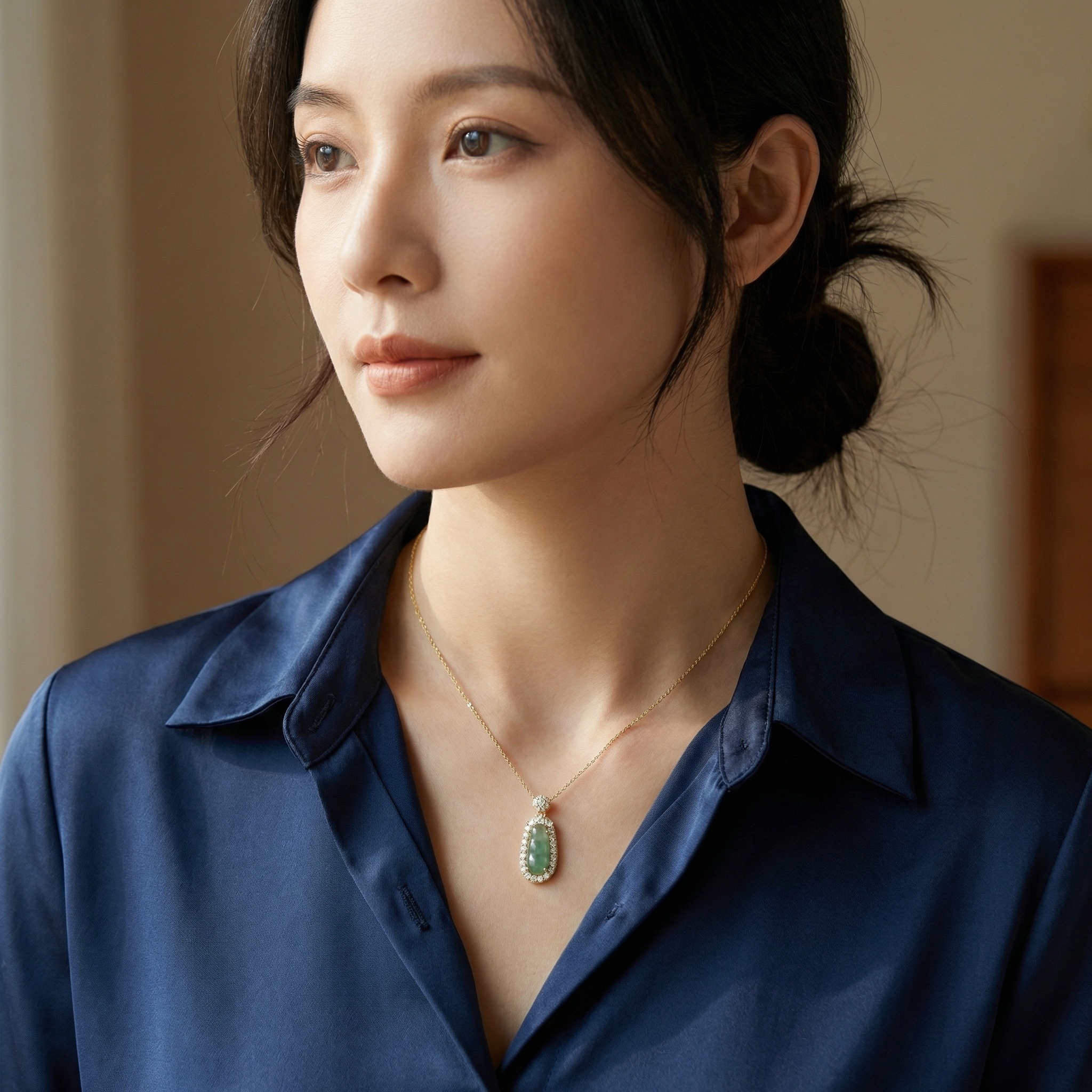 • This exquisite necklace features a captivating green jadeite pendant, expertly carved into a traditional pea pod shape, symbolizing longevity and prosperity. The translucent jadeite stone is framed by a dazzling halo of round brilliant white gemstones that catch the light from every angle. Above the main pendant, a matching circular cluster of stones adds an extra touch of brilliance to the design. The pendant hangs gracefully from a delicate link chain, creating a sophisticated and timeless look. Perfect for special occasions or adding a touch of elegance to your daily attire, this piece beautifully combines classic inspiration with contemporary jewelry craftsmanship. The polished setting enhances the natural luster of the jade, making it a stunning statement piece for any jewelry lover. | Brand: jewelryodm