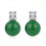 These stunning earrings showcase a vibrant green spherical base, exuding a timeless charm and natural beauty. Each earring is crowned with a polished white metal setting featuring two meticulously set, brilliant-cut diamonds that add a touch of luxury and light. The minimalist yet bold design makes them perfect for both formal occasions and everyday elegance. The contrast between the deep, rich green of the round stones and the cool luster of the white metal creates a striking visual appeal. Crafted with attention to detail, these earrings are a perfect blend of classic sophistication and contemporary style. They serve as an exquisite gift or a refined addition to any jewelry collection, offering a pop of color and a sparkle that catches the eye from every angle. | Brand: jewelryodm