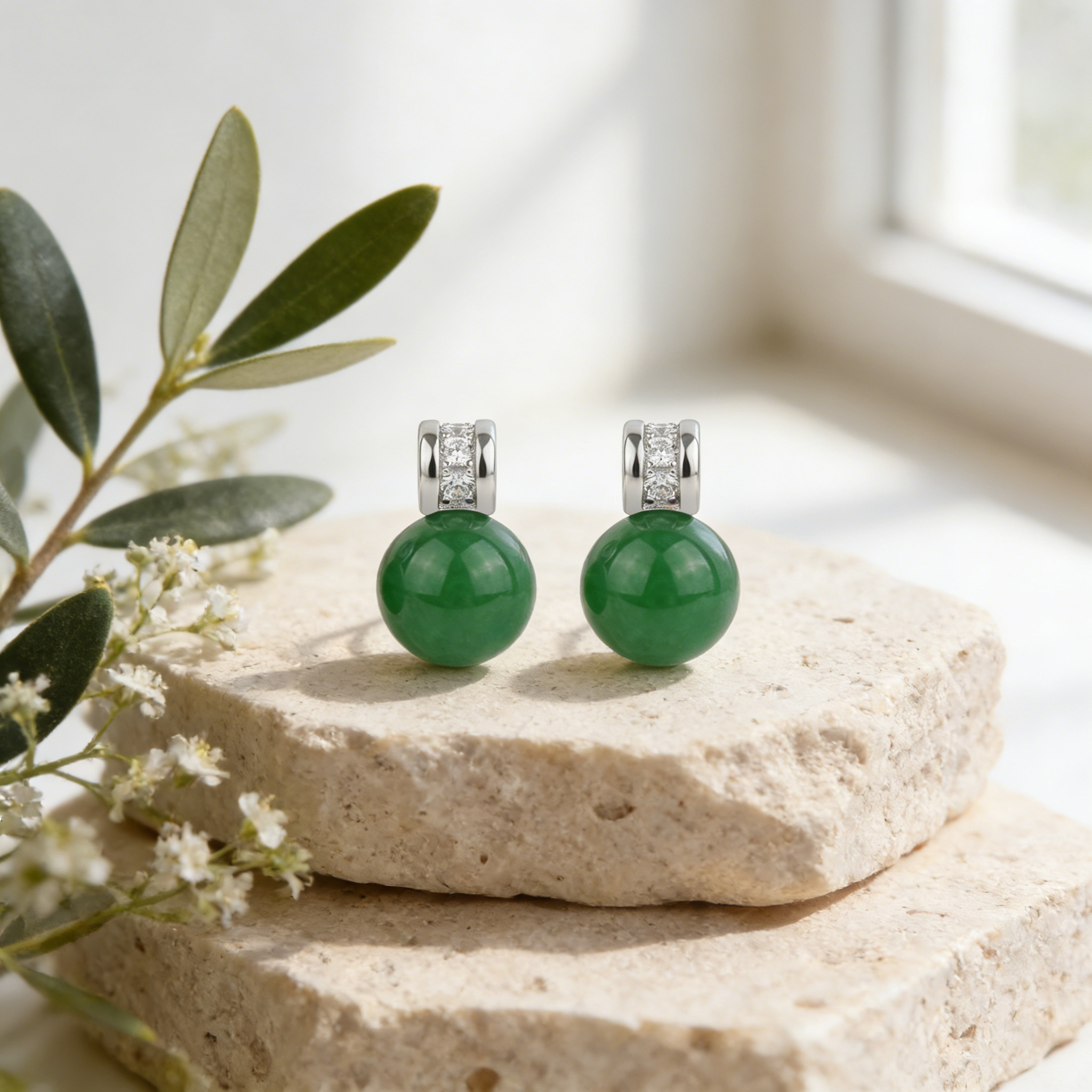 925 Sterling Silver Elegant Green Sphere Earrings with Sparkling CZ Accents and Sleek White Metal Settings is designed for style, comfort, and everyday use.