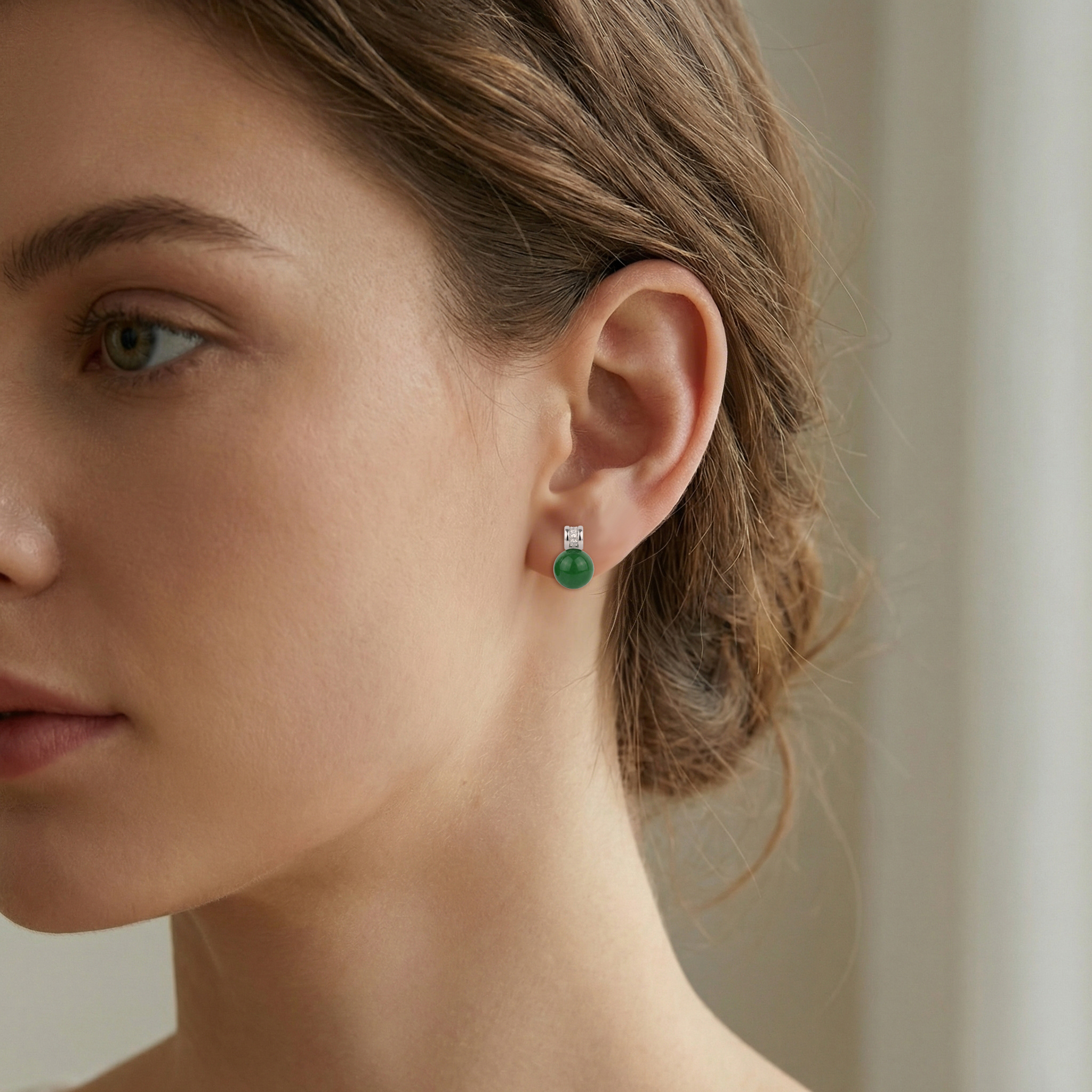 • These stunning earrings showcase a vibrant green spherical base, exuding a timeless charm and natural beauty. Each earring is crowned with a polished white metal setting featuring two meticulously set, brilliant-cut diamonds that add a touch of luxury and light. The minimalist yet bold design makes them perfect for both formal occasions and everyday elegance. The contrast between the deep, rich green of the round stones and the cool luster of the white metal creates a striking visual appeal. Crafted with attention to detail, these earrings are a perfect blend of classic sophistication and contemporary style. They serve as an exquisite gift or a refined addition to any jewelry collection, offering a pop of color and a sparkle that catches the eye from every angle. | Brand: jewelryodm