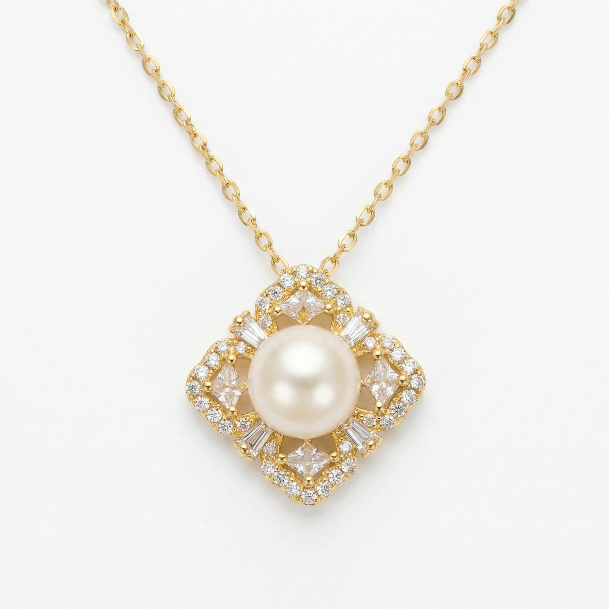 This exquisite necklace features a central creamy pearl with a radiant luster, nestled within a sophisticated vintage-inspired setting. The pendant is meticulously crafted with a geometric floral motif, adorned with a brilliant array of sparkling diamonds in various cuts, including baguette and round stones. Each accent stone is precisely set to maximize light reflection, creating a dazzling halo effect around the central pearl. Suspended from a delicate, polished chain, this timeless piece offers an elegant silhouette that seamlessly blends classic charm with modern sophistication. Perfect for special occasions or bridal ensembles, this necklace exudes a refined grace, making it a standout addition to any jewelry collection. Its intricate craftsmanship and harmonious design ensure a captivating look from every angle. | Brand: jewelryodm