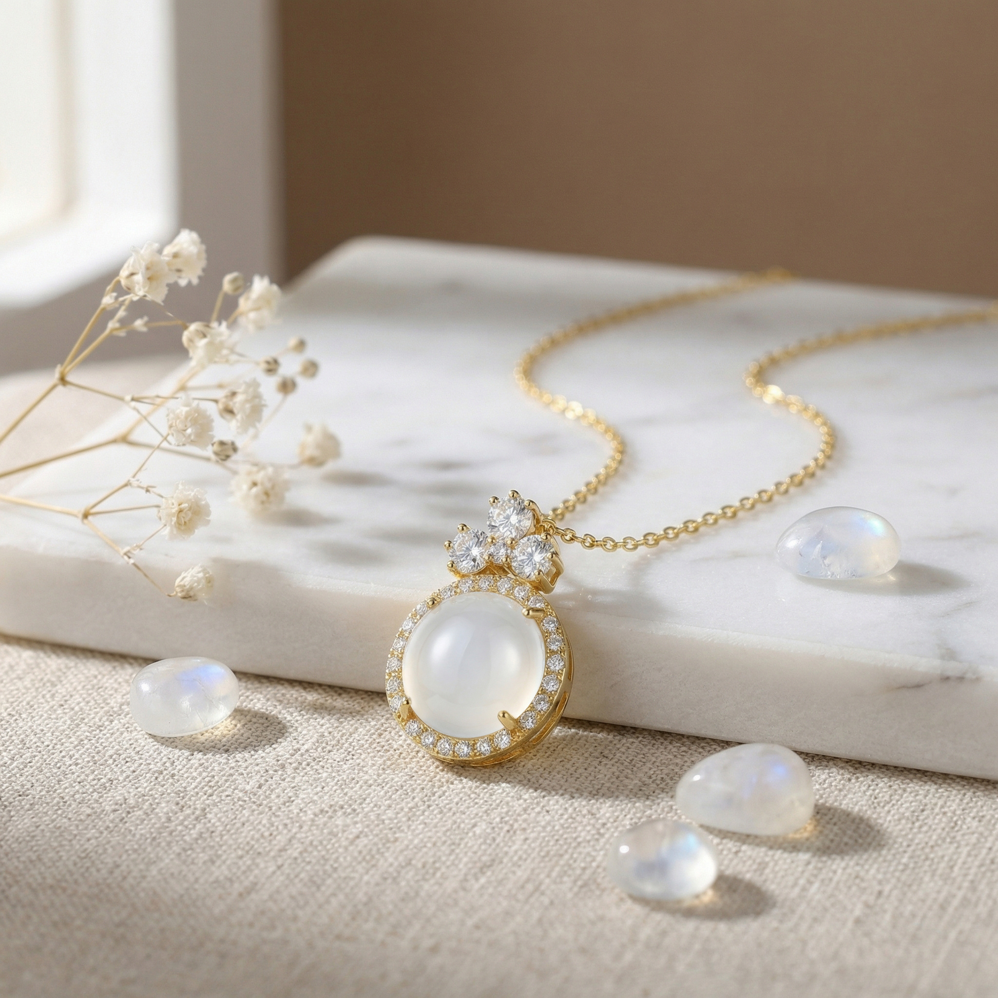 This exquisite necklace features a luminous round moonstone cabochon at its heart, radiating a soft, ethereal glow. The central stone is meticulously framed by a shimmering halo of brilliant-cut accents that catch the light from every angle. Above the main pendant, a charming floral-inspired cluster of three larger sparkling gems adds a touch of sophisticated flair. Suspended from a delicate yellow-toned chain, this piece combines timeless elegance with modern craftsmanship. Perfect for special occasions or adding a touch of luxury to everyday wear, its serene beauty and polished finish make it a standout addition to any jewelry collection. The contrast between the milky sheen of the moonstone and the fiery brilliance of the surrounding gems creates a captivating and harmonious visual balance. | Brand: jewelryodm