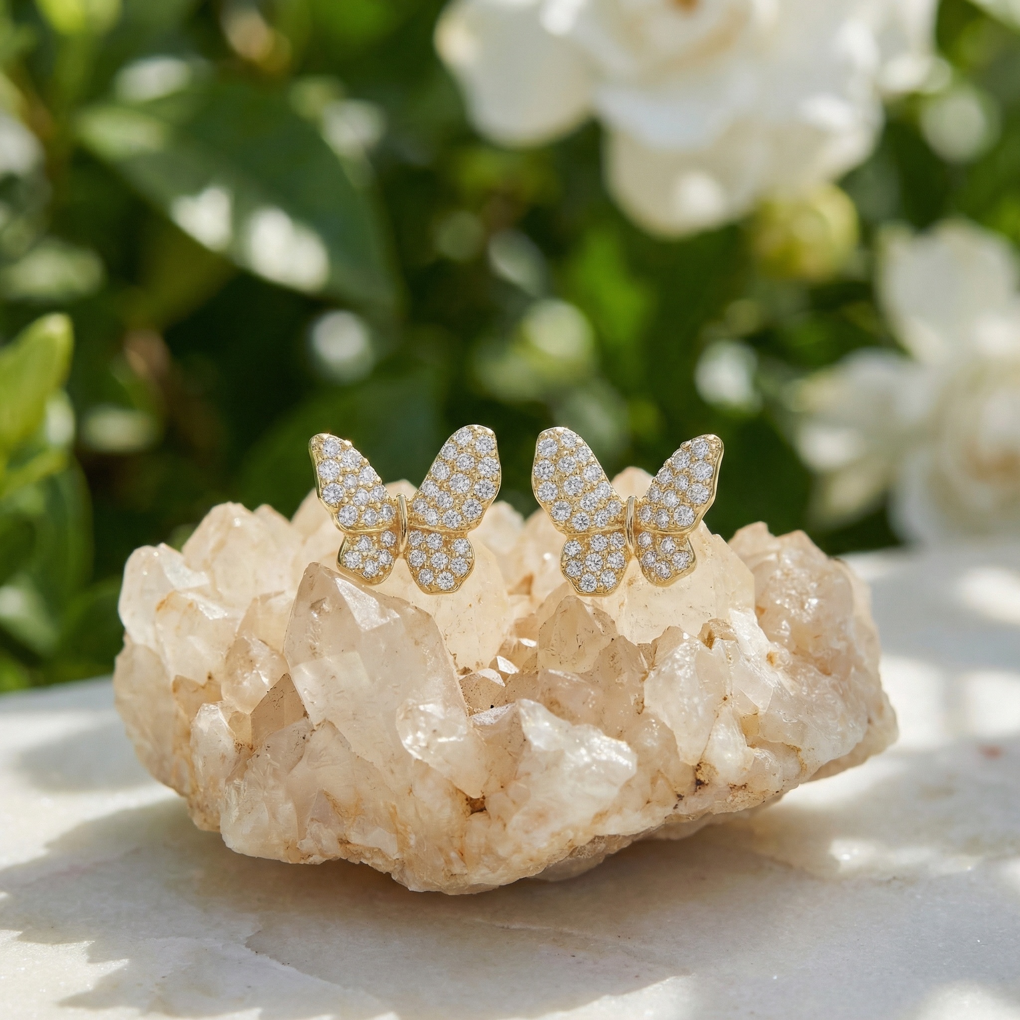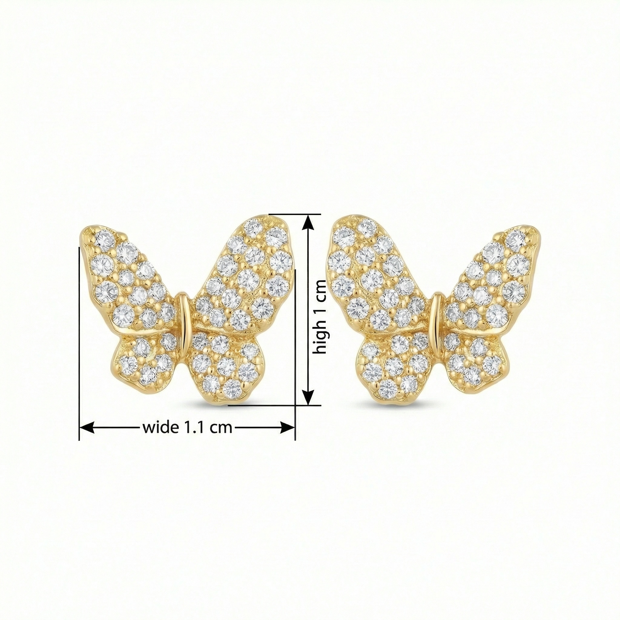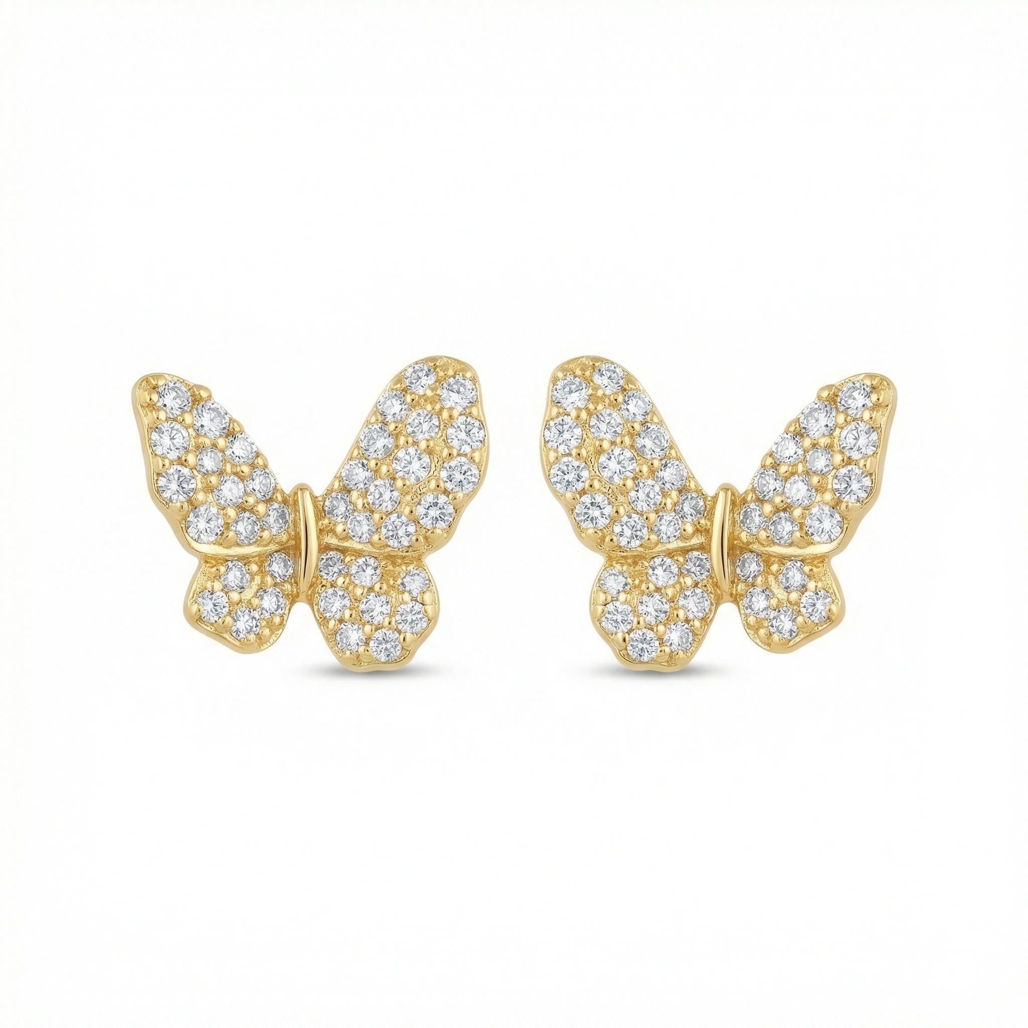 These exquisite butterfly-shaped stud earrings are a perfect blend of whimsy and sophistication. Each butterfly is meticulously crafted from a lustrous yellow-toned metal, providing a rich backdrop for the shimmering pavé-set stones that cover the wings. The brilliant-cut stones catch the light from every angle, creating a dazzling display of sparkle that mimics the delicate flutter of a real butterfly. Their elegant design makes them versatile enough for both everyday wear and special occasions, adding a touch of natural beauty to any ensemble. With a secure post backing, these earrings offer a comfortable and secure fit for all-day wear. Whether as a thoughtful gift for a loved one or a charming personal treat, these butterfly studs are a timeless addition to any jewelry collection, beautifully capturing the grace and transformation symbolized by this enchanting garden creature. | Brand: jewelryodm