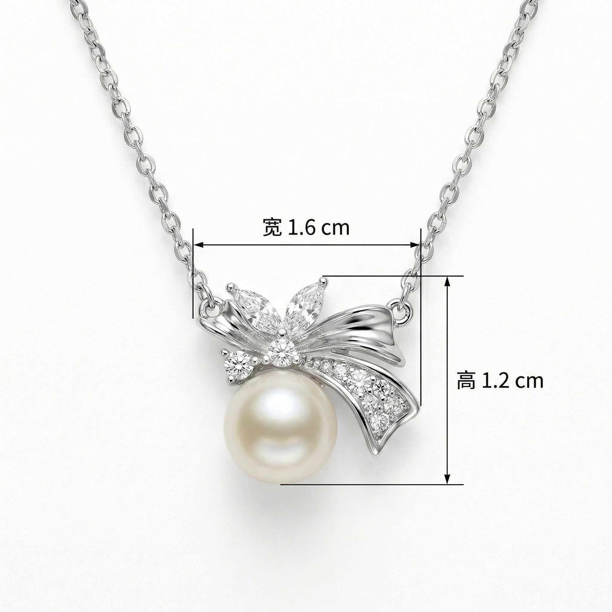 This stunning necklace features a sophisticated bow design crafted from high-quality silver-tone metal. At the heart of the pendant hangs a perfectly round, lustrous white pearl that radiates a soft, natural glow. The bow itself is intricately detailed, embellished with a combination of marquise-cut and brilliant round-cut stones that add a touch of timeless sparkle. The ribbon curves gracefully, creating a sense of movement and elegance. Suspended from a delicate cable chain, this piece is the perfect accessory for both formal occasions and everyday luxury. Its classic combination of pearls and shimmering accents makes it a thoughtful gift or a beautiful addition to any jewelry collection. The polished finish provides a brilliant shine that captures the light beautifully from every angle, making it a truly eye-catching piece. | Brand: jewelryodm