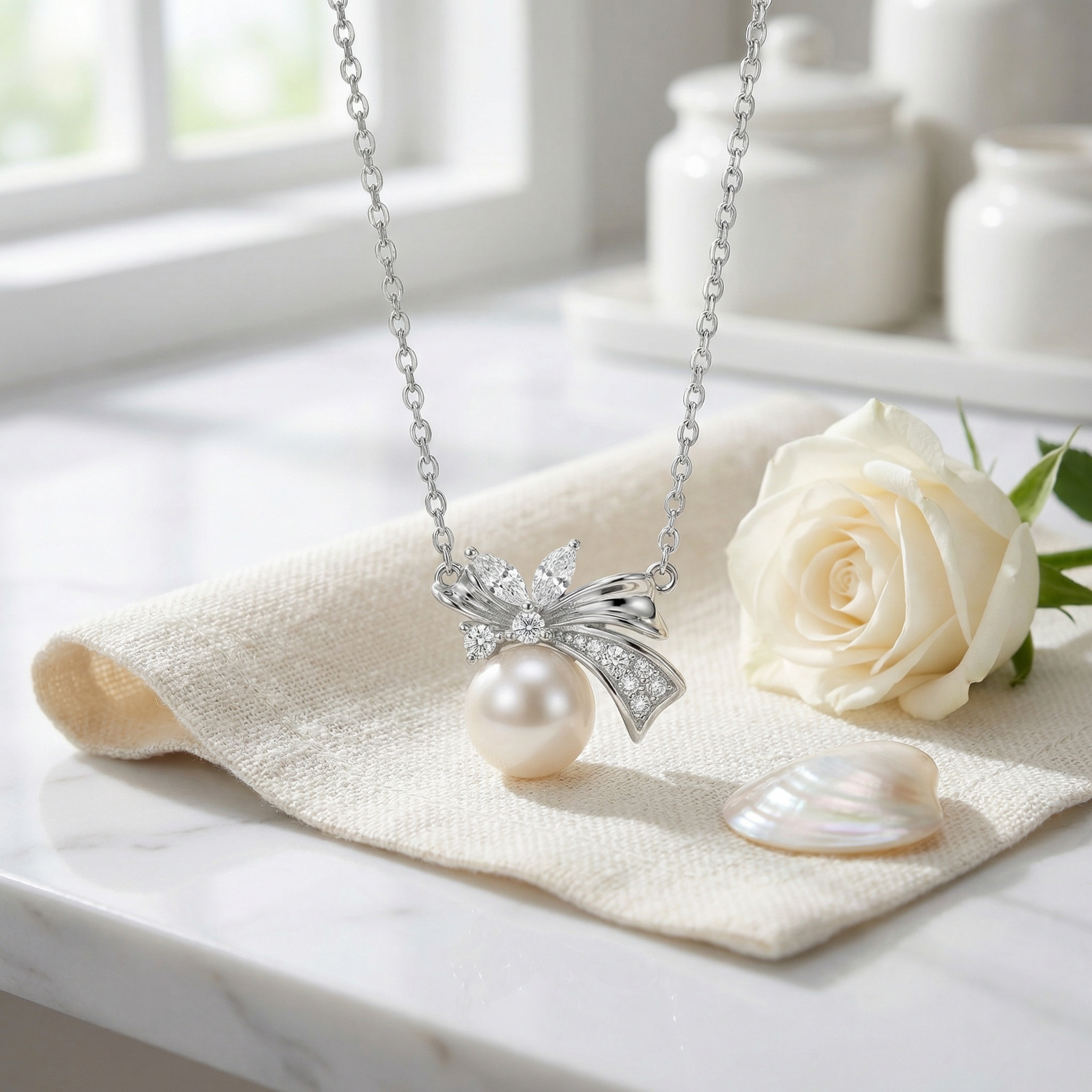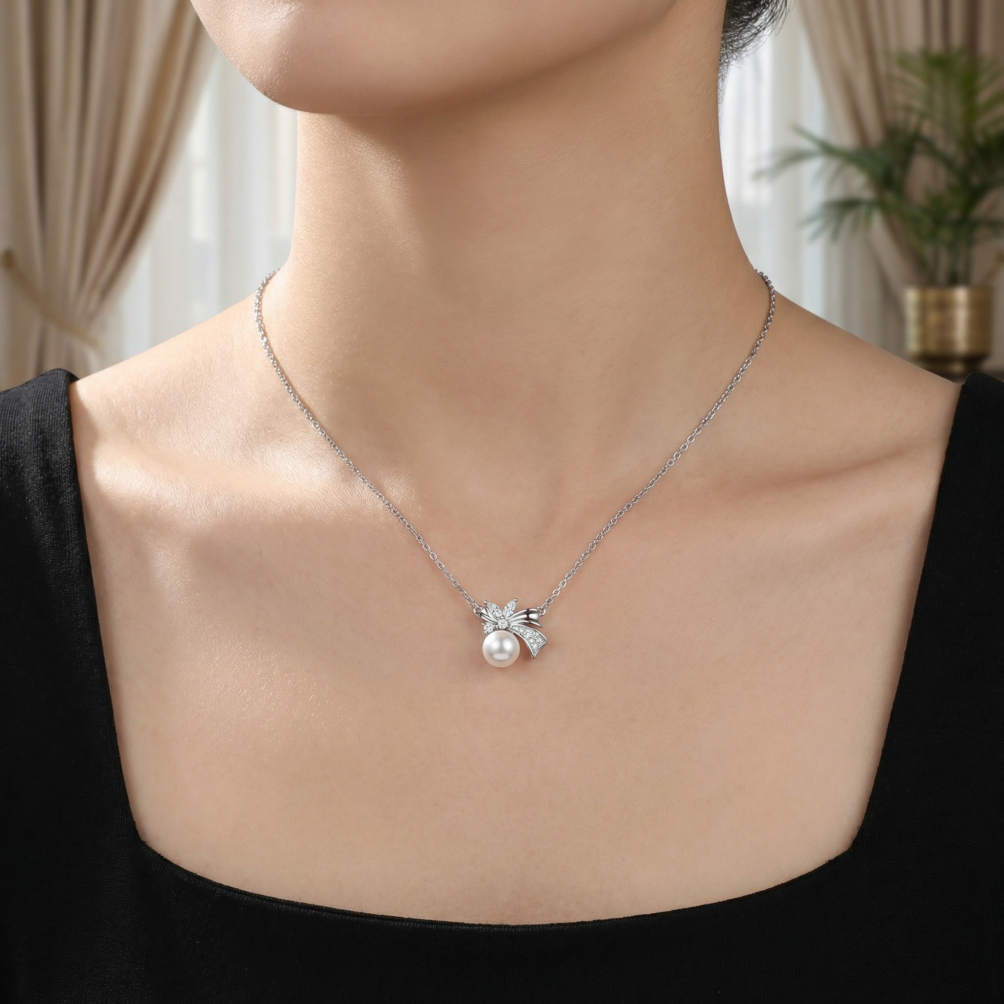 925 Sterling Silver Elegant Pearl Pendant Necklace with Sparkling Diamond Bow Design is designed for style, comfort, and everyday wear.