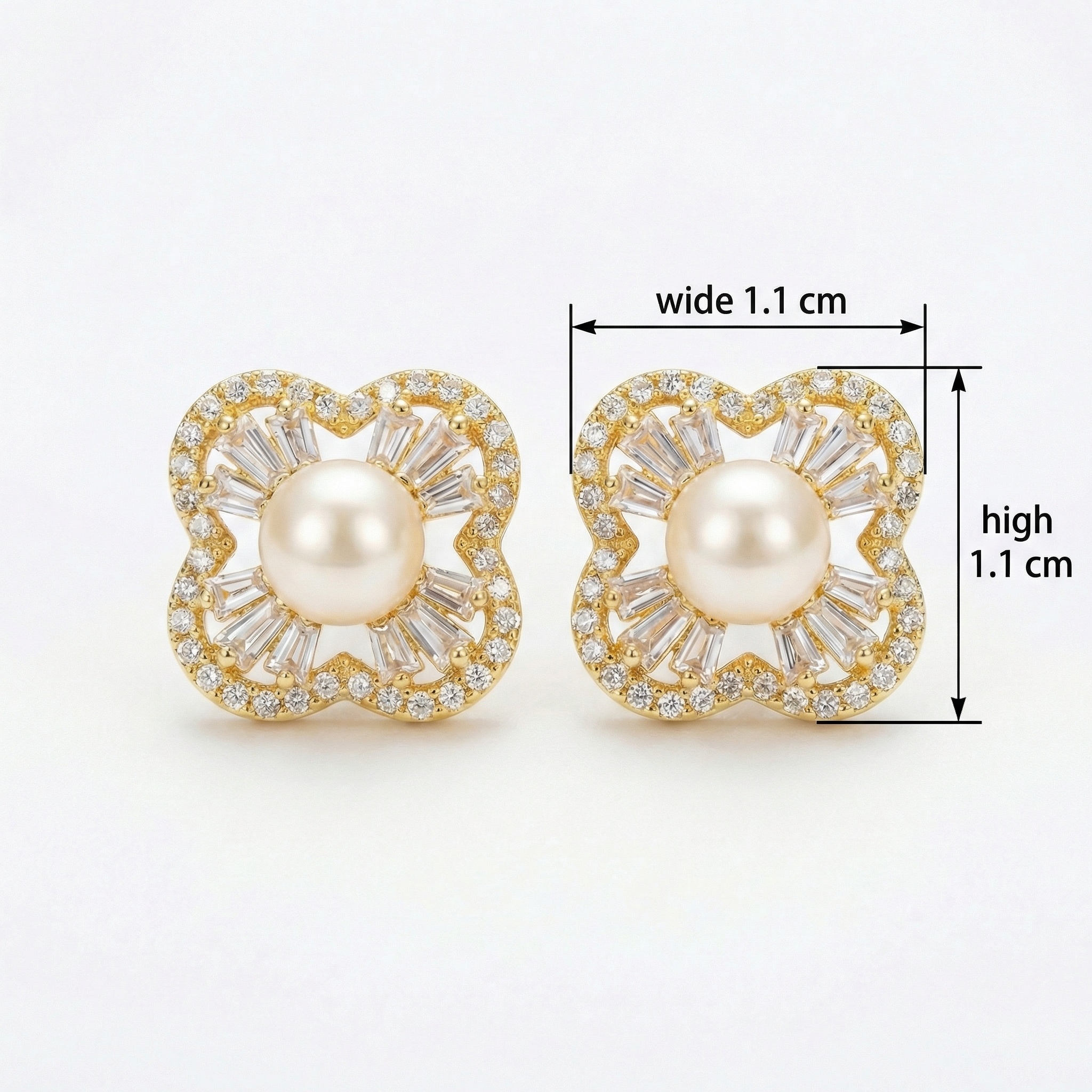 • Elevate your jewelry collection with these exquisite pearl stud earrings, designed to capture timeless elegance. Each earring features a lustrous, round cream pearl nestled at the center of a sophisticated quatrefoil-inspired frame. Radiating from the pearl are sparkling baguette-cut accents that create a sunburst effect, perfectly complemented by a delicate border of pavé-set round stones. Crafted in a warm, polished finish, these studs blend vintage charm with modern brilliance. The intricate clover-like silhouette adds a touch of symbolic luck and grace to any ensemble. Perfect for bridal wear, formal galas, or adding a luxurious touch to everyday outfits, these earrings are a versatile statement of refined taste. Their lightweight design ensures comfort throughout the day, while the secure backing provides peace of mind. Experience the perfect harmony of classic pearl luster and contemporary geometric sparkle. | Brand: jewelryodm