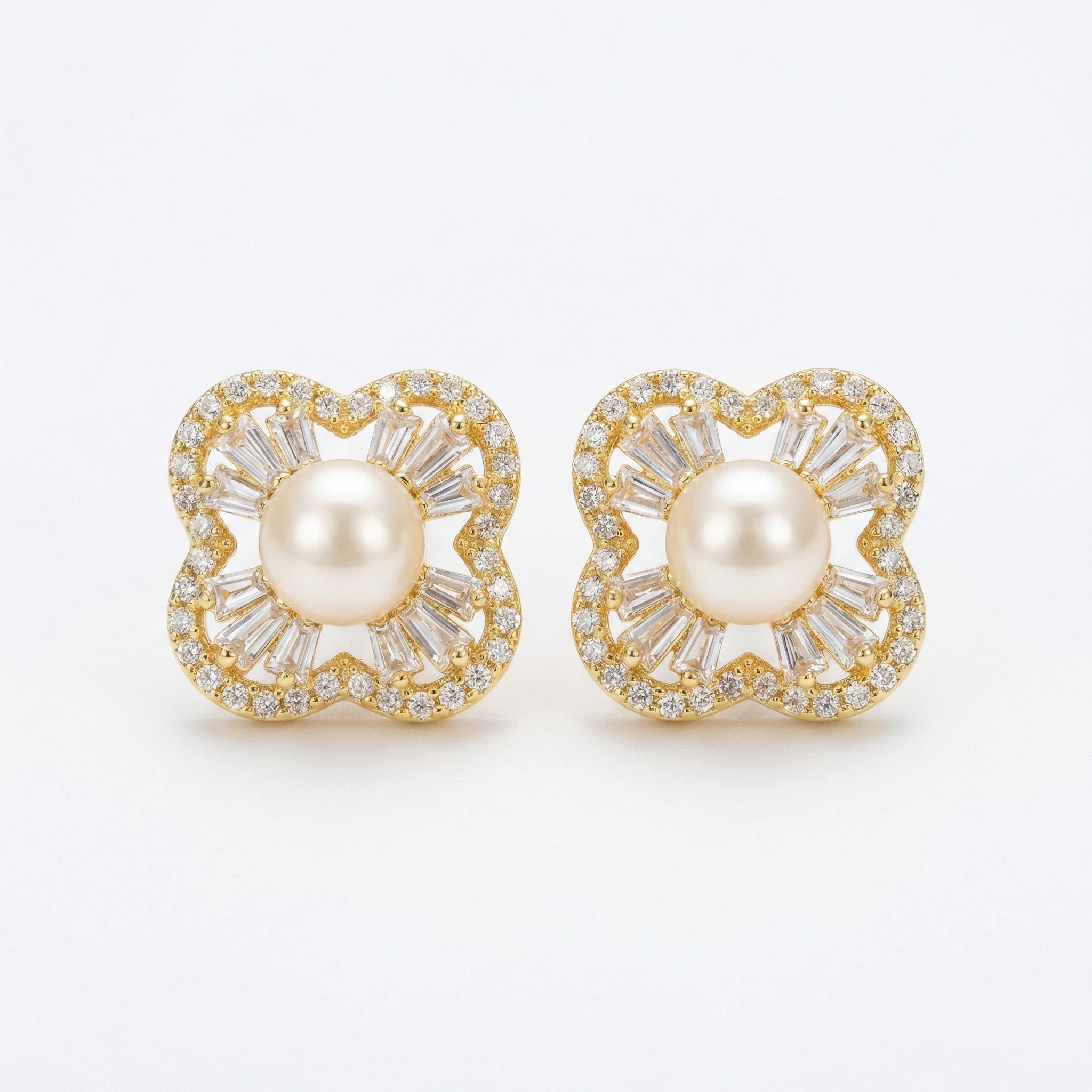 Elevate your jewelry collection with these exquisite pearl stud earrings, designed to capture timeless elegance. Each earring features a lustrous, round cream pearl nestled at the center of a sophisticated quatrefoil-inspired frame. Radiating from the pearl are sparkling baguette-cut accents that create a sunburst effect, perfectly complemented by a delicate border of pavé-set round stones. Crafted in a warm, polished finish, these studs blend vintage charm with modern brilliance. The intricate clover-like silhouette adds a touch of symbolic luck and grace to any ensemble. Perfect for bridal wear, formal galas, or adding a luxurious touch to everyday outfits, these earrings are a versatile statement of refined taste. Their lightweight design ensures comfort throughout the day, while the secure backing provides peace of mind. Experience the perfect harmony of classic pearl luster and contemporary geometric sparkle. | Brand: jewelryodm