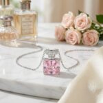 This exquisite necklace features a stunning perfume bottle-inspired pendant that exudes elegance and charm. At its center is a large, radiant pink gemstone, precision-cut into a classic rectangular shape to capture and reflect light beautifully. The pendant’s “cap” is meticulously crafted from polished silver, embellished with a row of shimmering clear crystals for a touch of luxury. Suspended from a delicate silver link chain, this piece blends whimsical creativity with sophisticated jewelry craftsmanship. Perfect for those who appreciate unique and romantic accessories, this necklace makes a bold statement while remaining timelessly graceful. Its soft pink hues and brilliant metallic finish ensure it complements any outfit with a dash of feminine flair. | Brand: jewelryodm