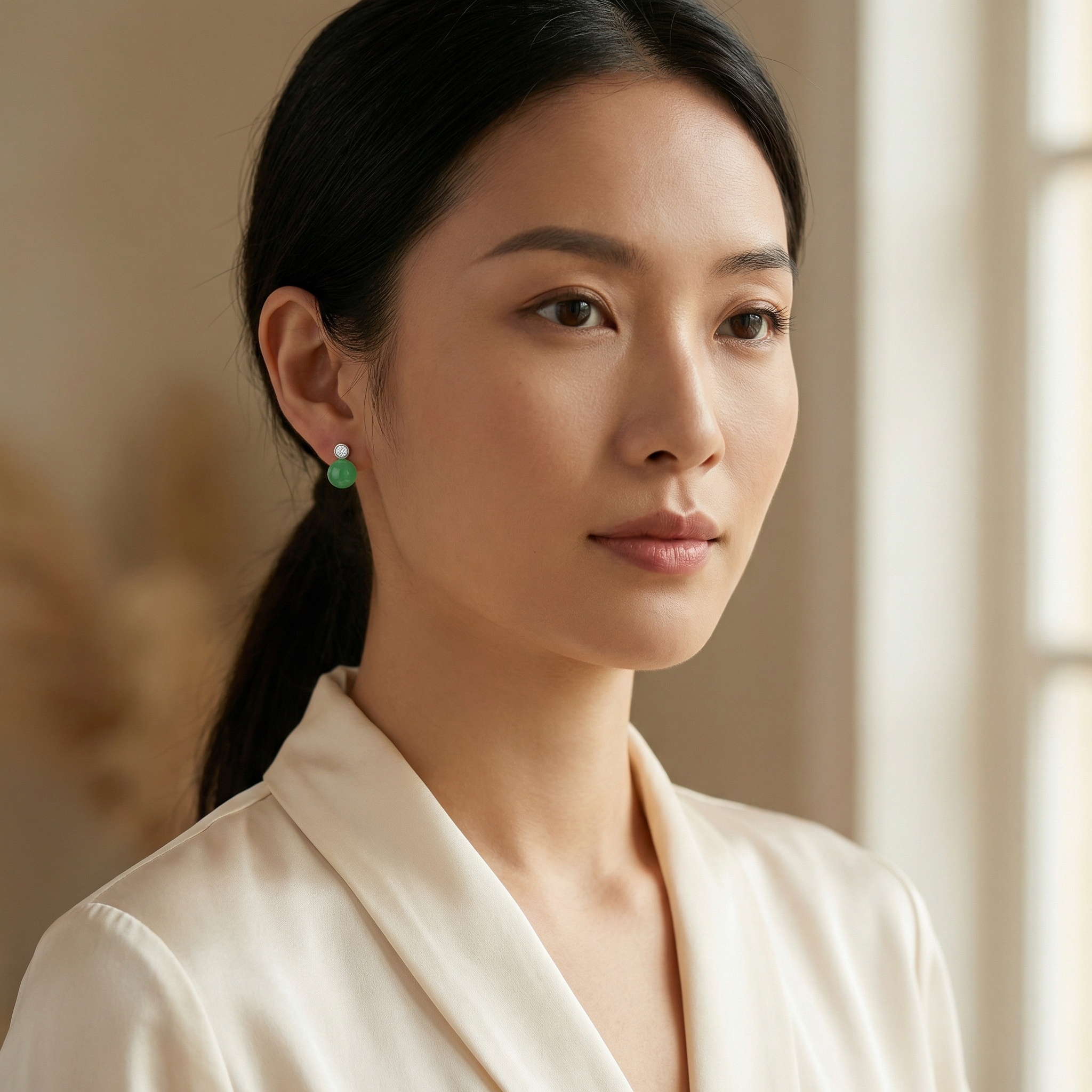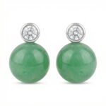 • This exquisite pair of stud earrings features a sophisticated blend of classic and contemporary design. Each earring is anchored by a perfectly spherical green jade bead, showcasing a vibrant, mottled emerald hue that exudes natural beauty. Resting atop each jade sphere is a shimmering round brilliant-cut diamond, securely held in a polished white metal bezel setting. The contrast between the organic, translucent texture of the jade and the sharp, fire-filled brilliance of the diamonds creates a striking visual balance. These earrings offer a timeless elegance suitable for both formal occasions and elevated everyday wear. The minimalist drop-stud design ensures they remain a versatile staple in any fine jewelry collection, making them a perfect gift for those who appreciate the serene beauty of jade paired with the classic sparkle of diamonds. | Brand: jewelryodm