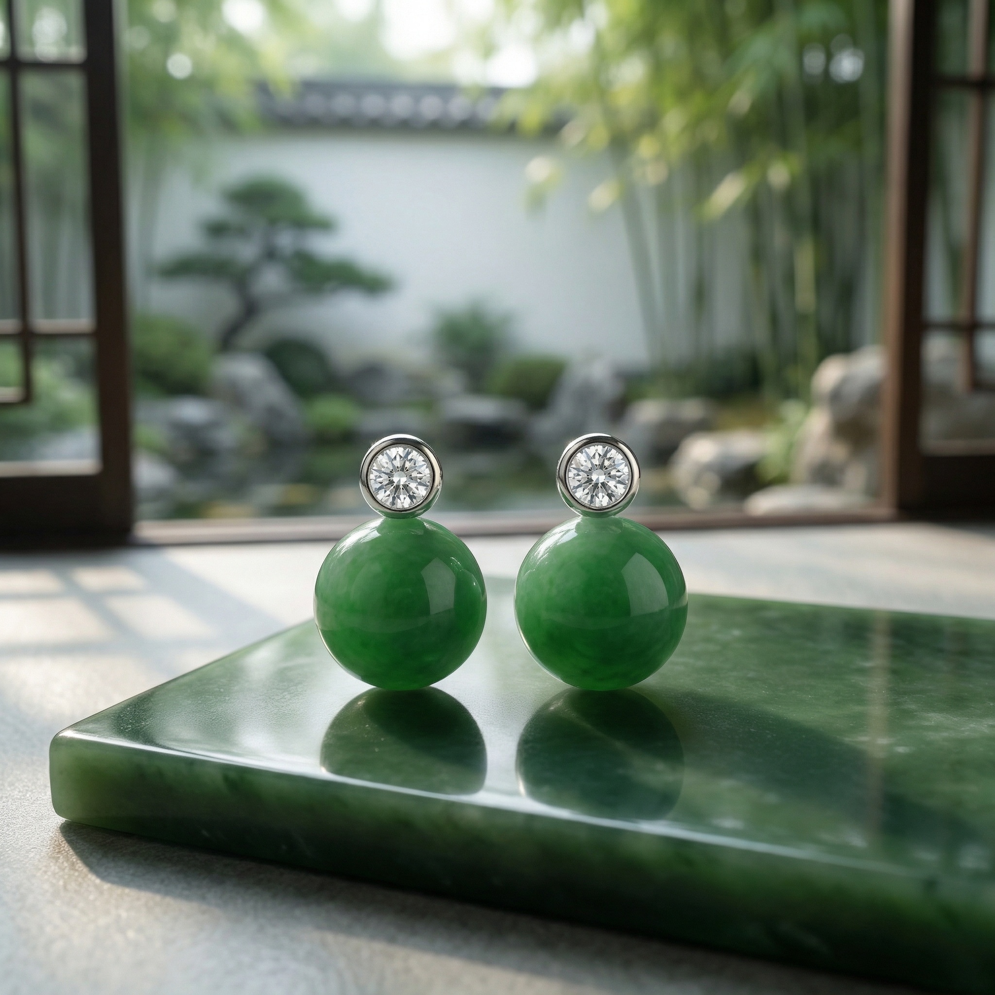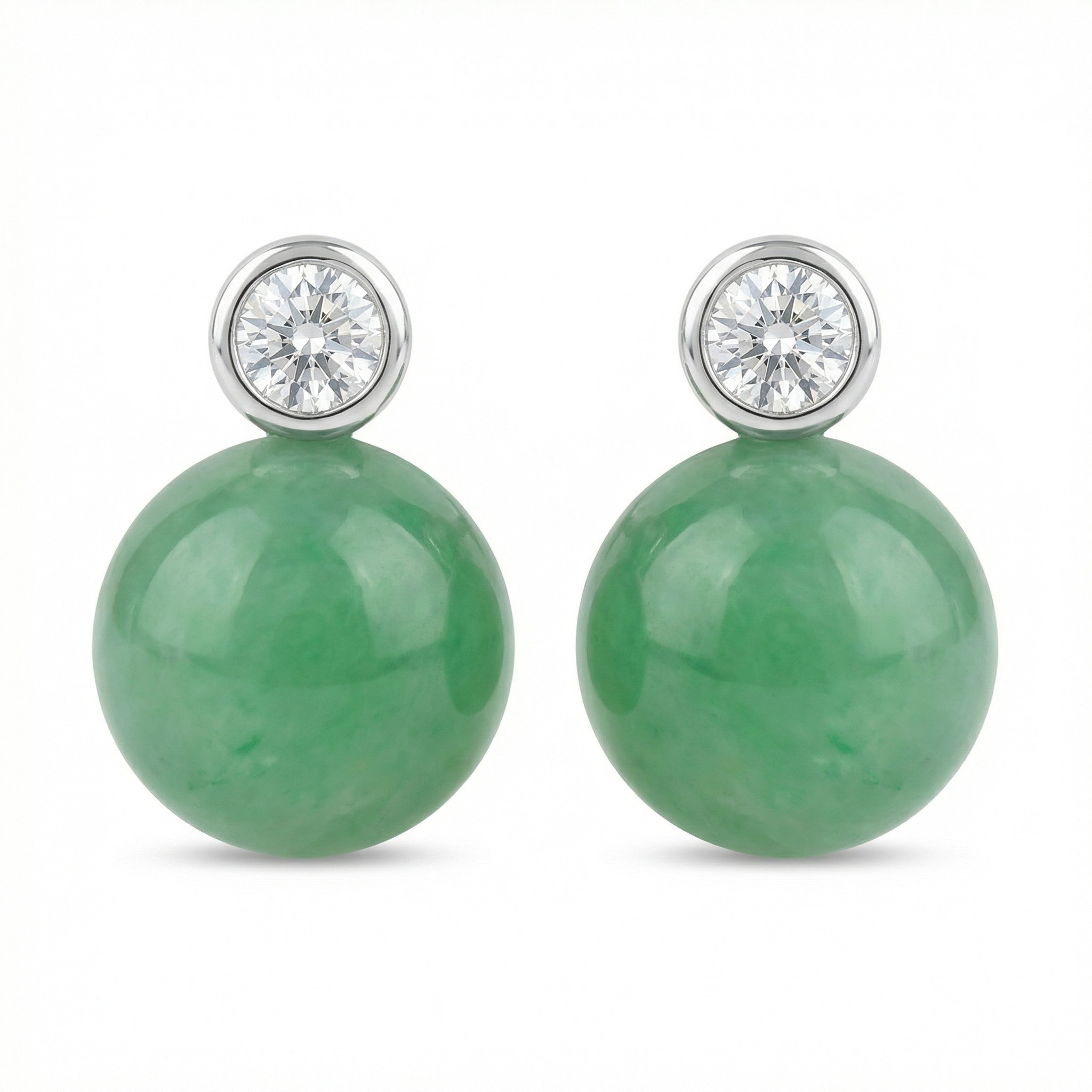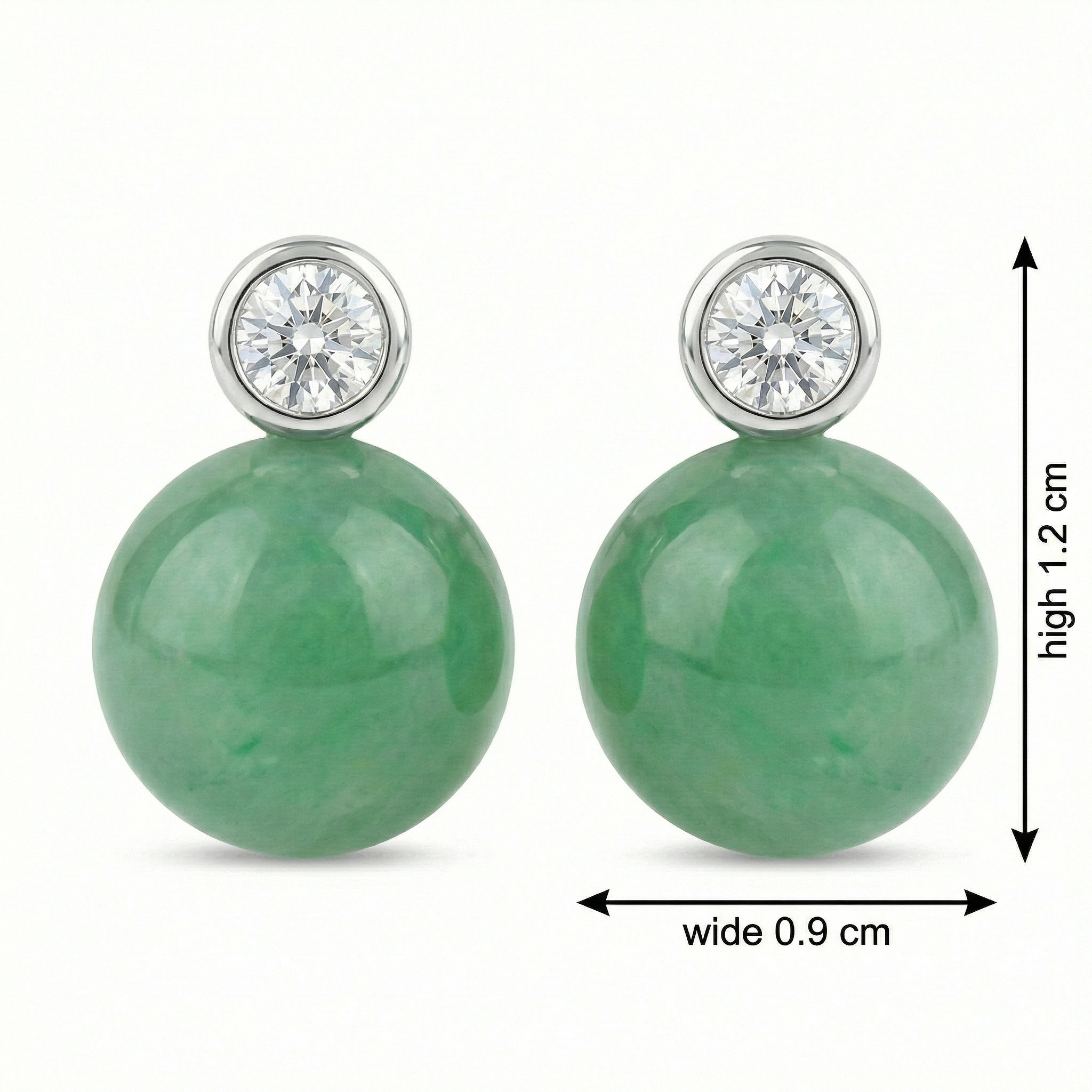 This exquisite pair of stud earrings features a sophisticated blend of classic and contemporary design. Each earring is anchored by a perfectly spherical green jade bead, showcasing a vibrant, mottled emerald hue that exudes natural beauty. Resting atop each jade sphere is a shimmering round brilliant-cut diamond, securely held in a polished white metal bezel setting. The contrast between the organic, translucent texture of the jade and the sharp, fire-filled brilliance of the diamonds creates a striking visual balance. These earrings offer a timeless elegance suitable for both formal occasions and elevated everyday wear. The minimalist drop-stud design ensures they remain a versatile staple in any fine jewelry collection, making them a perfect gift for those who appreciate the serene beauty of jade paired with the classic sparkle of diamonds. | Brand: jewelryodm